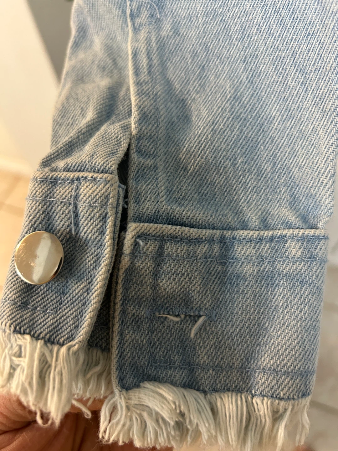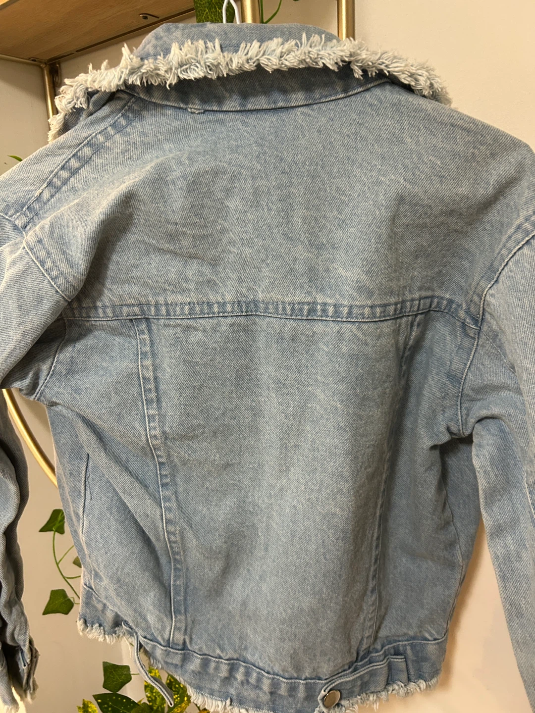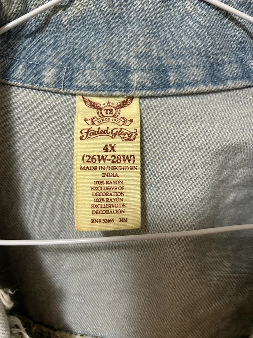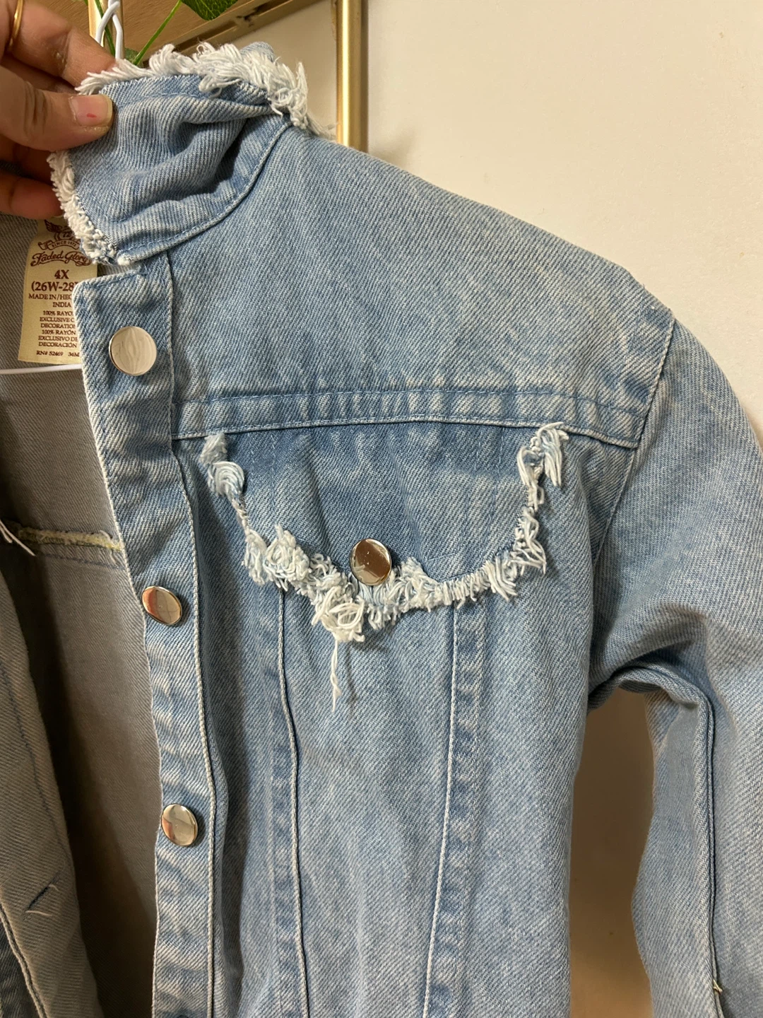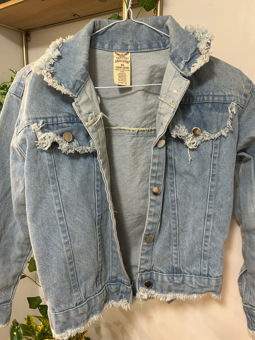Selling a Faded Glory denim jacket in size 4X (26W-28W). It's a light wash denim with a fun, fringed design. Made of 100% rayon!