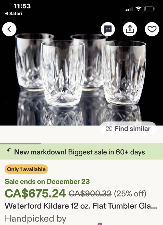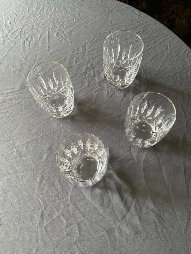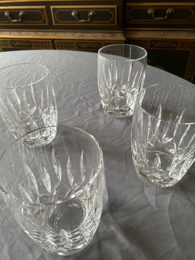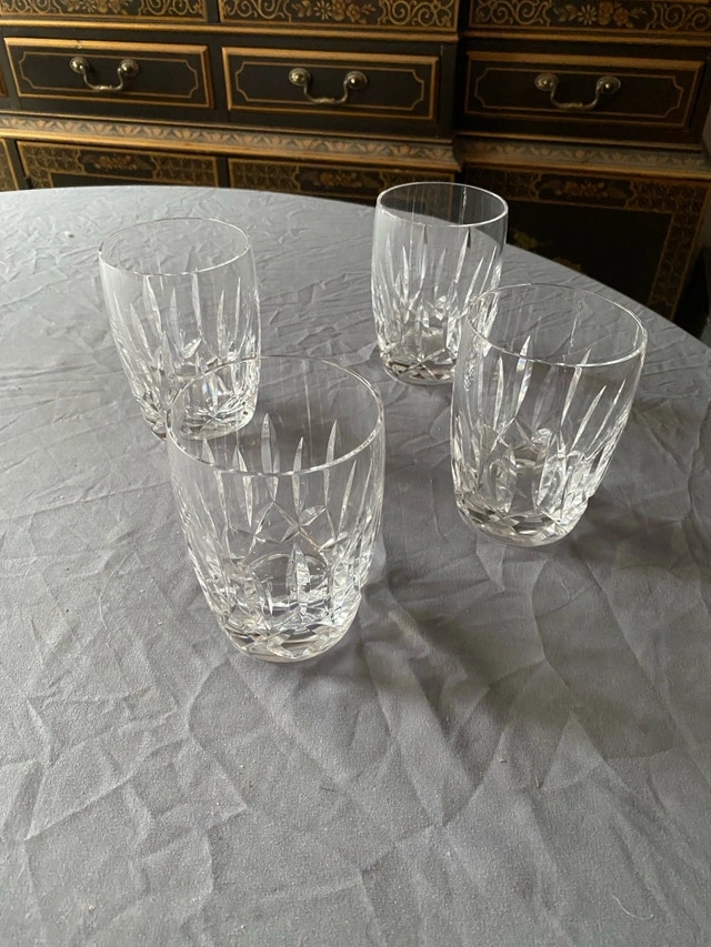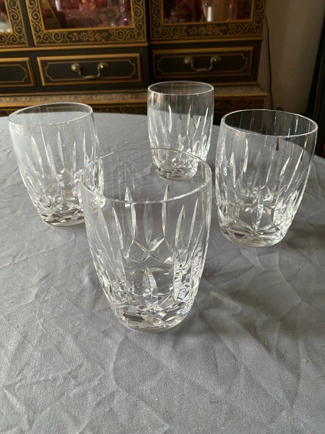 These are a set of four (4) Kildare Waterford barrel-shaped crystal tumblers, each with a 12oz capacity. These items are used. Package price of $280 if purchased with my other post of 4 Waterford Champaign Flutes. Excellent vintage condition. No chips, cracks or clarity problems. This set includes 4 glasses. Signed "Waterford". No original box. These elegant crystal glasses are looking for a new home where they can be appreciated.