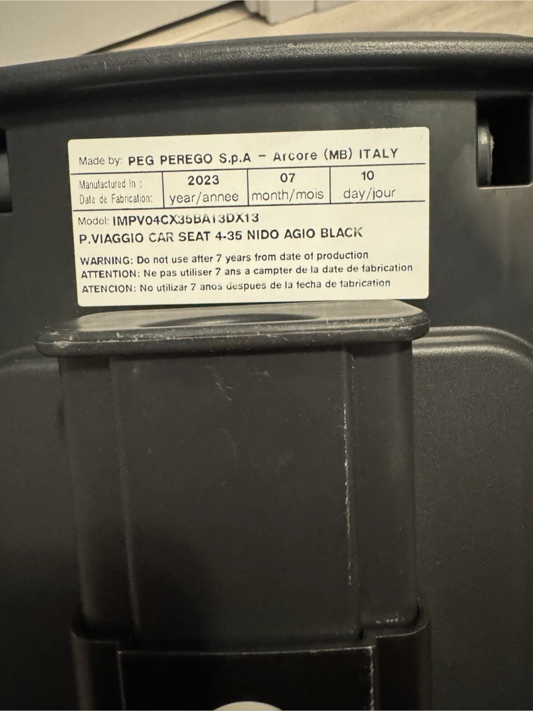 Selling a Peg Perego P.Viaggio car seat base in black. It was manufactured in 2023 July 10 and it will expire on July 2030. It's designed for the P.Viaggio car seat 4-35 Nido Agio Black.