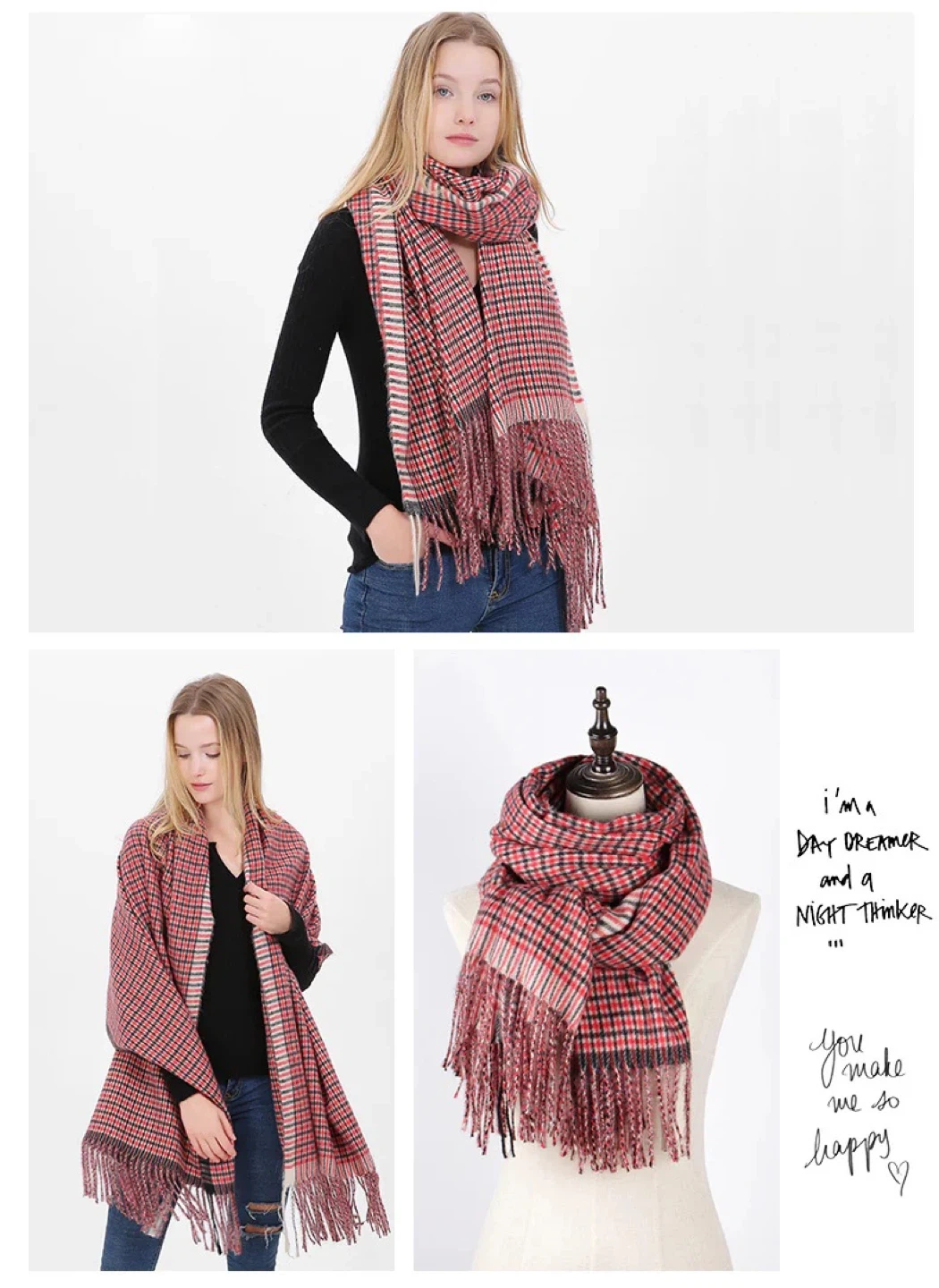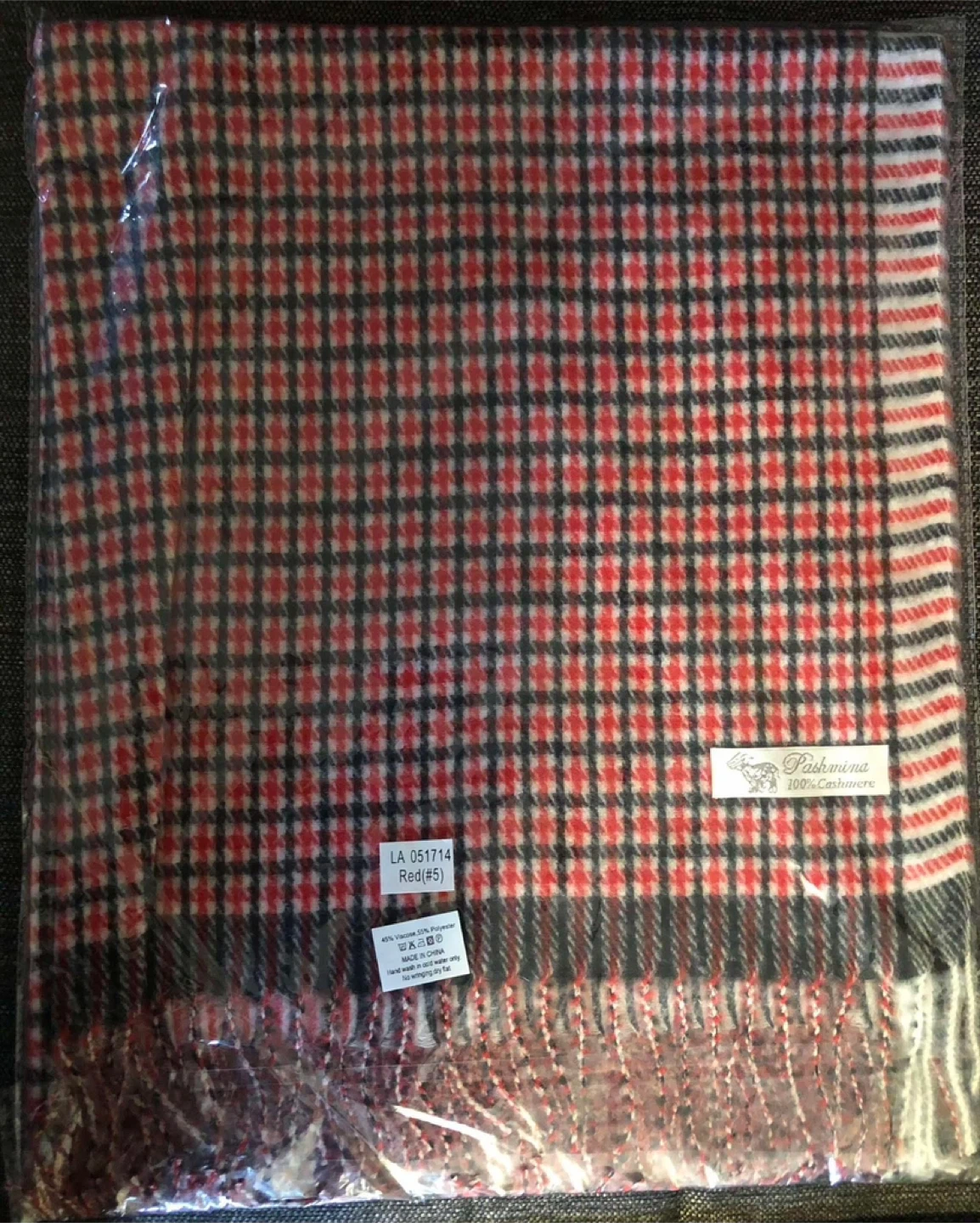 - Cozy plaid scarf in a lovely red, black, and white pattern!