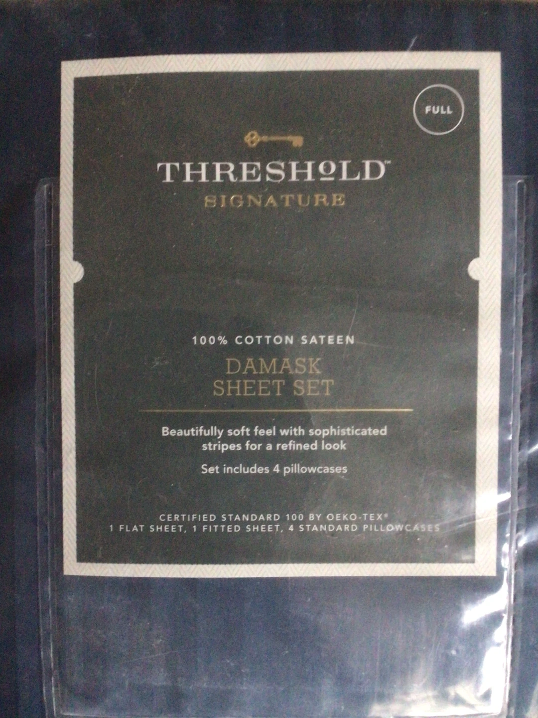 Selling a brand new Threshold Signature Damask Sheet Set! This full-size set is made of 100% cotton sateen for a beautifully soft feel with sophisticated stripes. The set includes 1 flat sheet, 1 fitted sheet, and 4 standard pillowcases