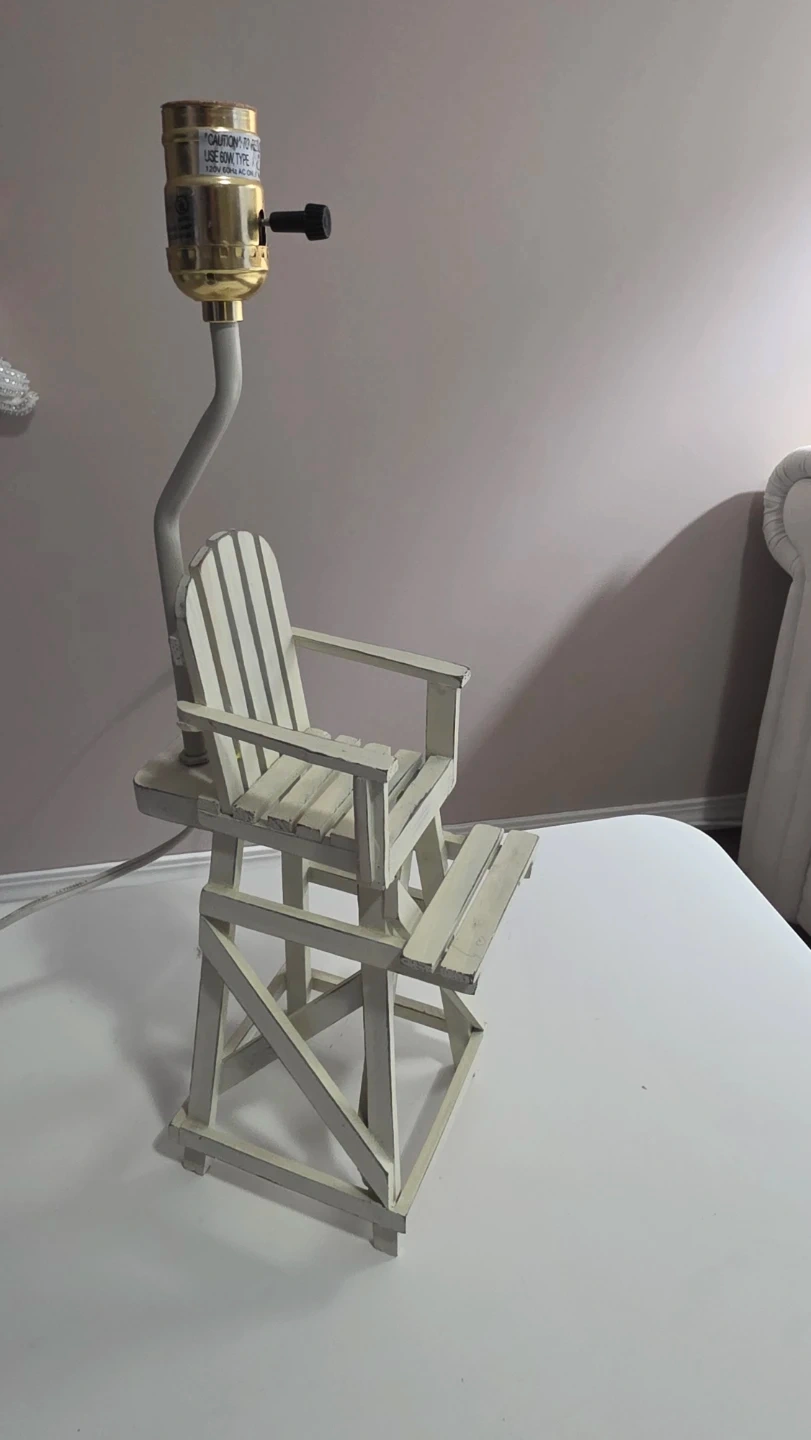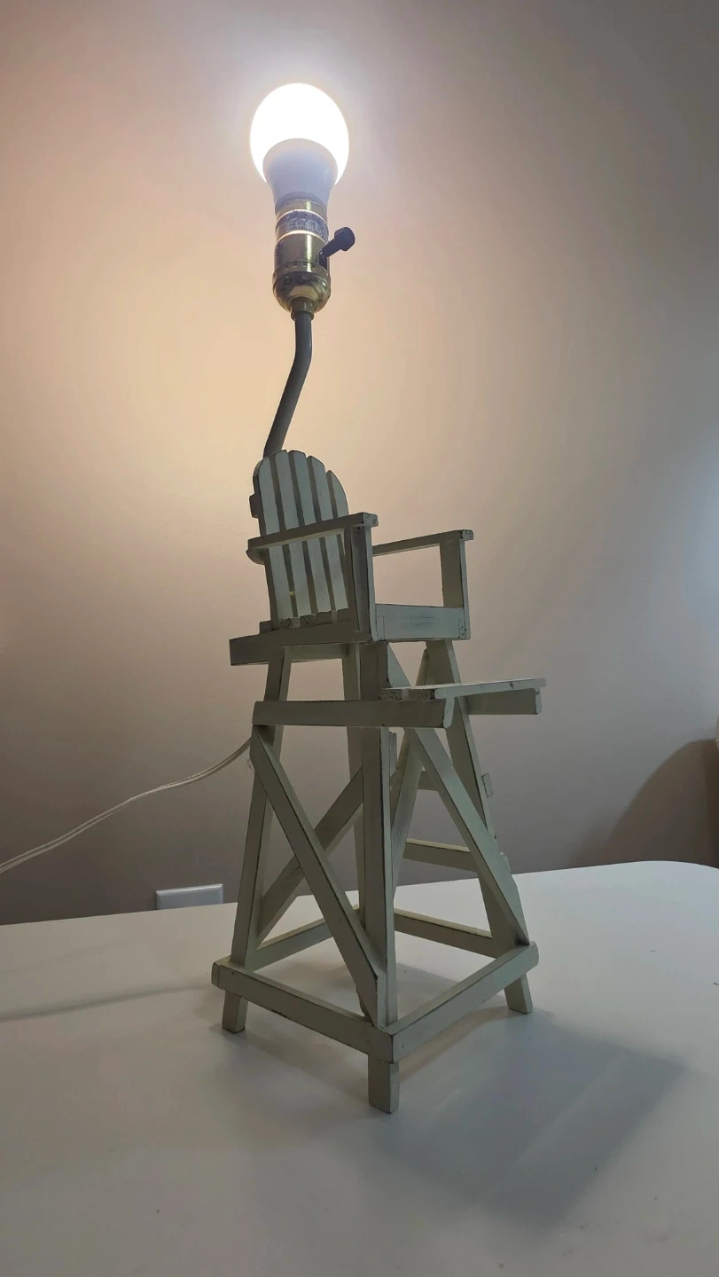 Here's a unique table lamp shaped like a lifeguard chair! It adds a fun, beachy vibe to any room. The lamp is in great condition and provides a nice ambient light. Perfect for a bedside table or desk!