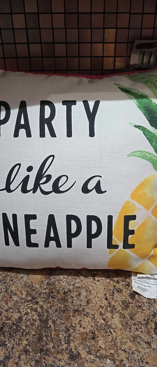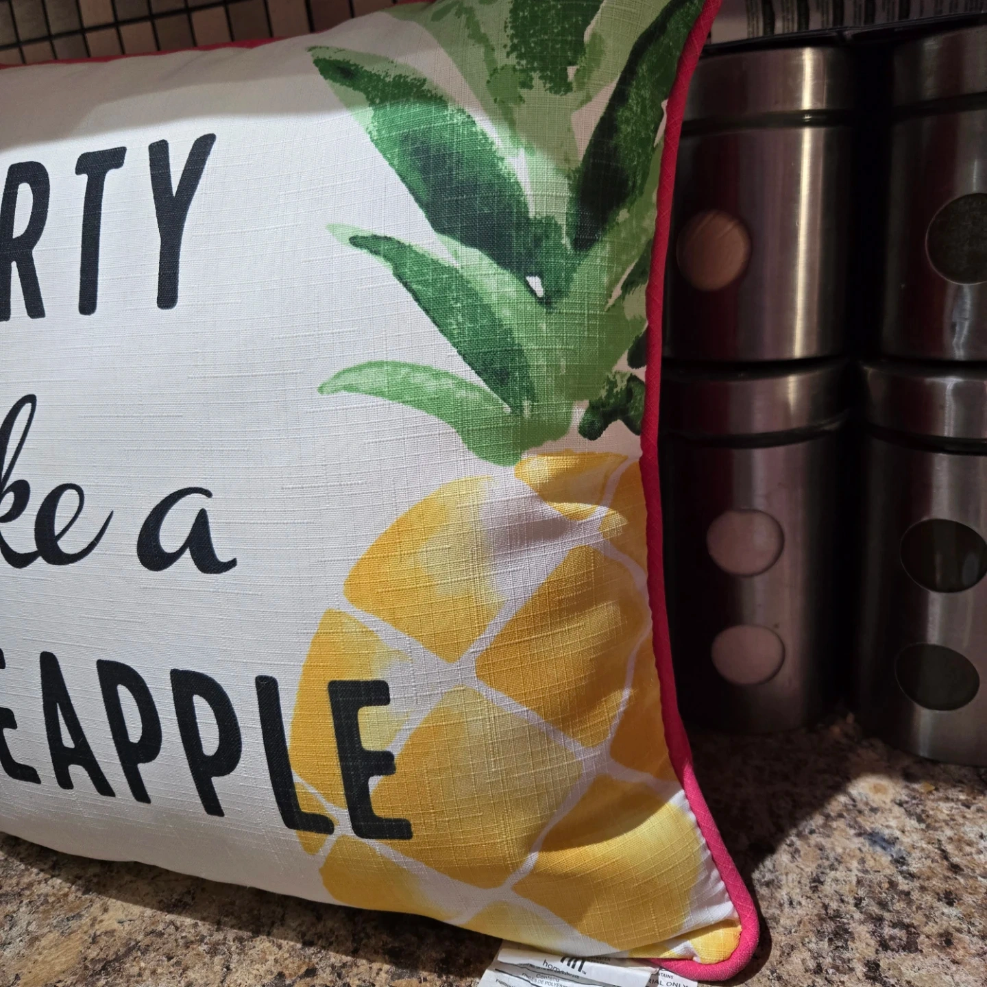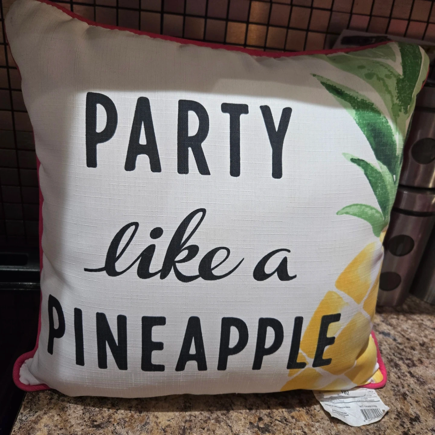 Add a fun touch to your home decor with this decorative pillow! It features the phrase "Party like a PINEAPPLE" with a cute pineapple design. Perfect for adding a pop of colour and personality to any room