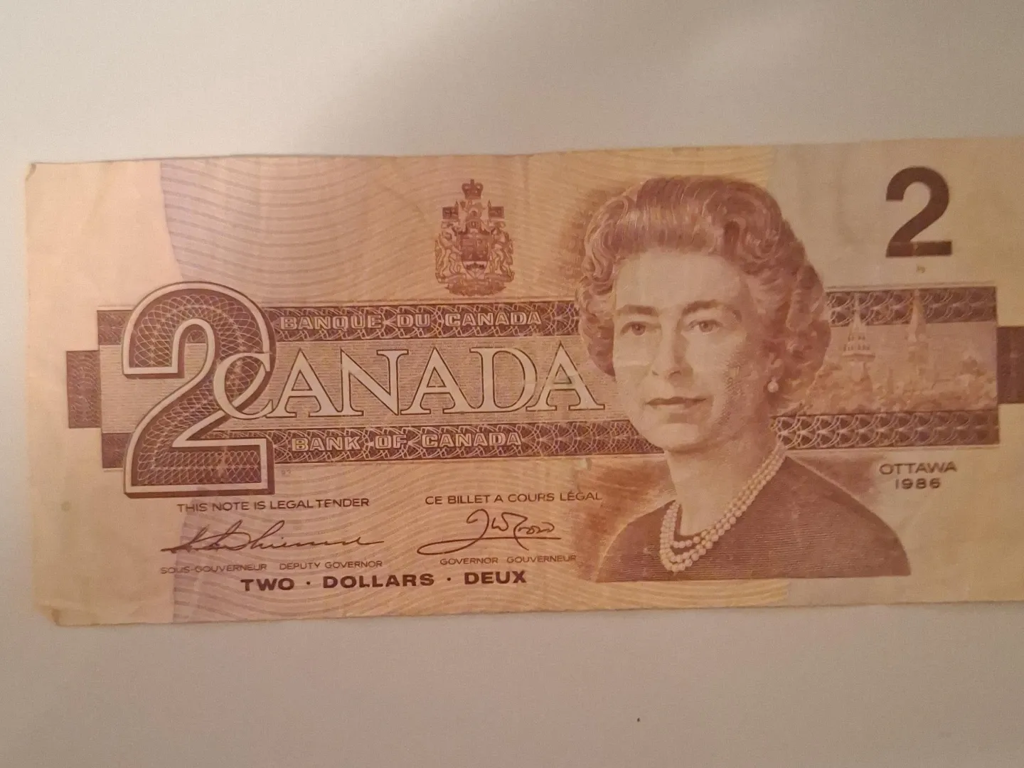 Selling a vintage Canadian $2 bill from 1986. It features a portrait of Queen Elizabeth II and is a piece of Canadian history! Perfect for collectors or anyone interested in numismatics