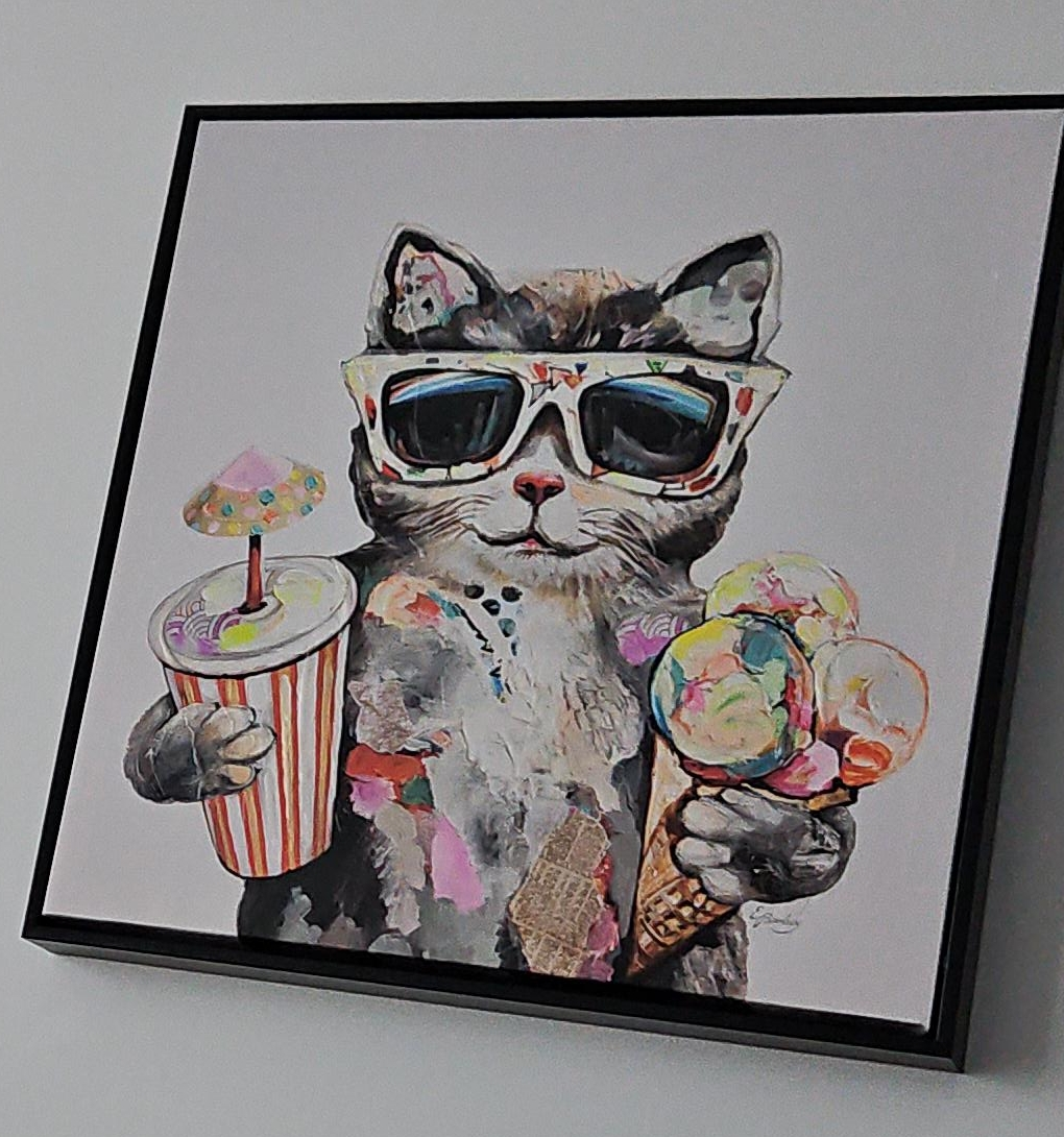 A framed painting of a cat wearing sunglasses and holding a drink and ice cream. Super cute and fun picture for your rec room, teen or kids bedrooms.