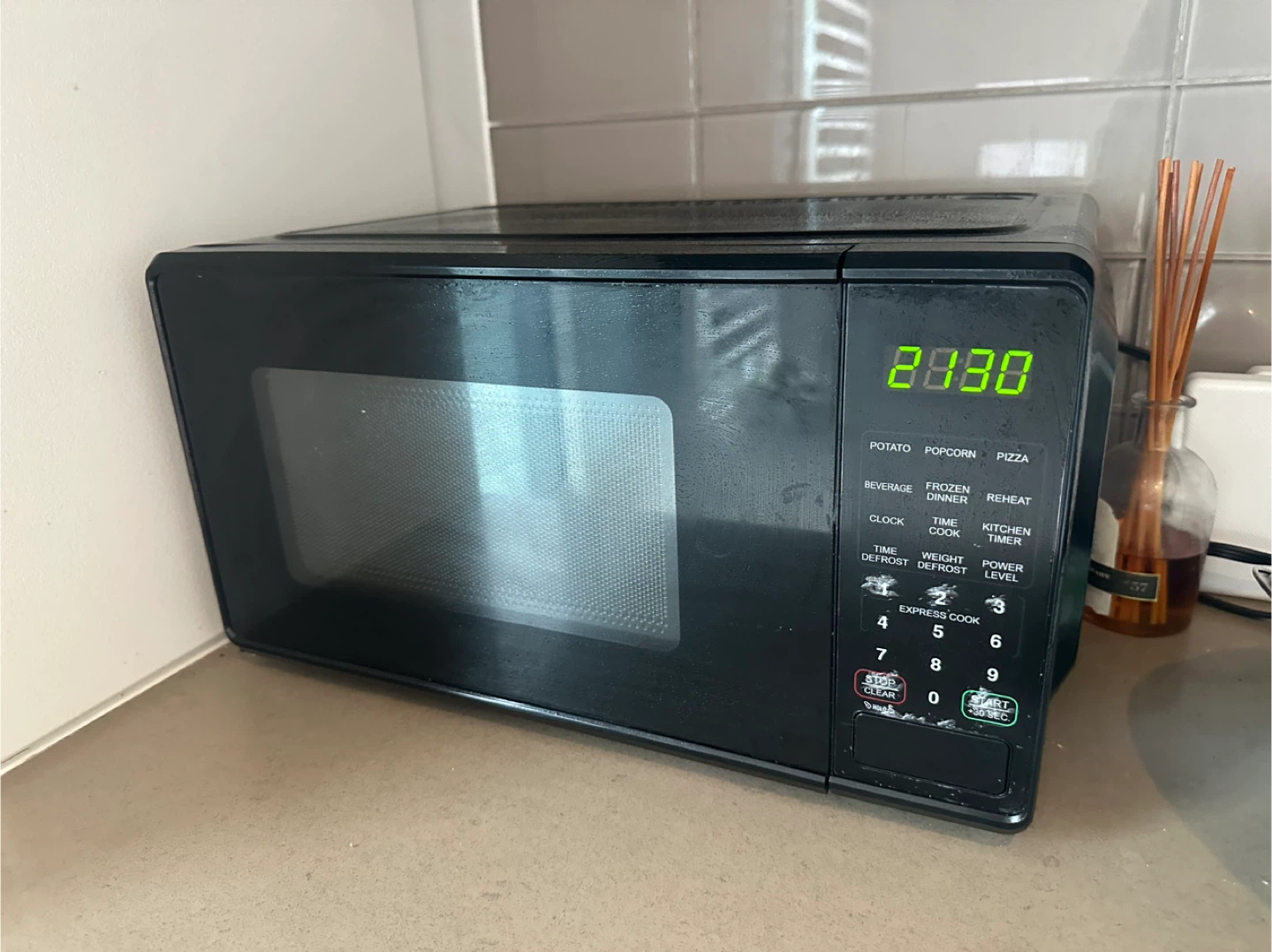 Selling a black microwave oven. It has settings for potato, popcorn, and pizza. There are also settings for beverage, frozen dinner, and reheat. It also has express cook settings.