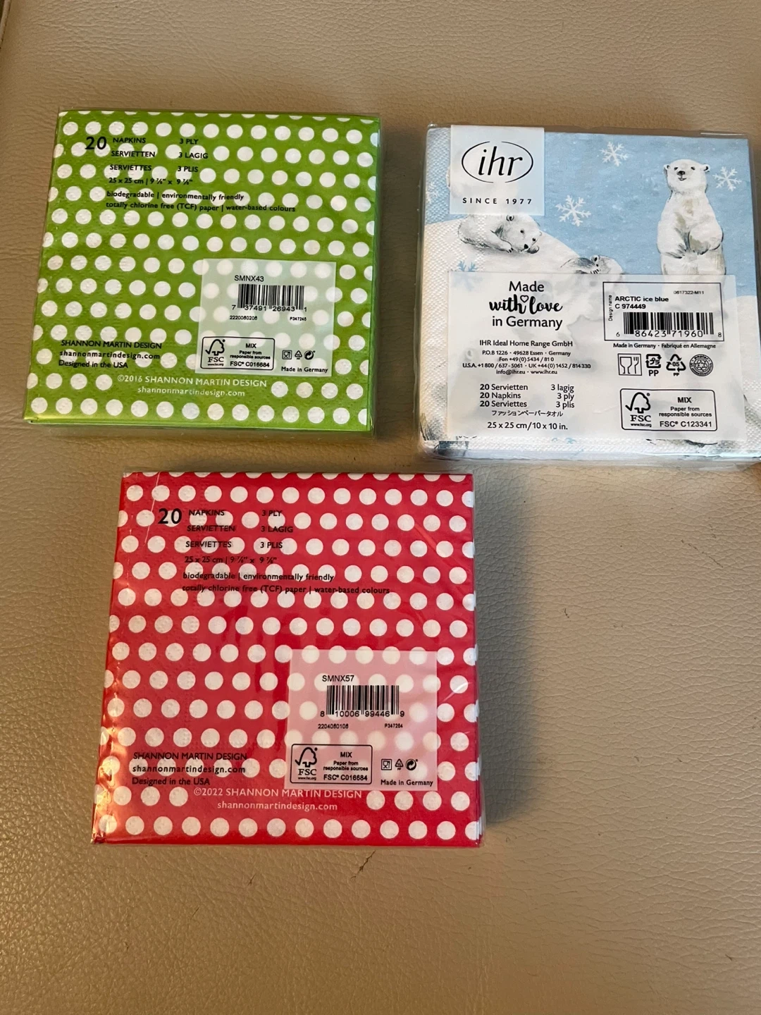 Selling a bundle of 3 packages of new holiday paper napkins in Bev size . 25cm printed on all four sides .