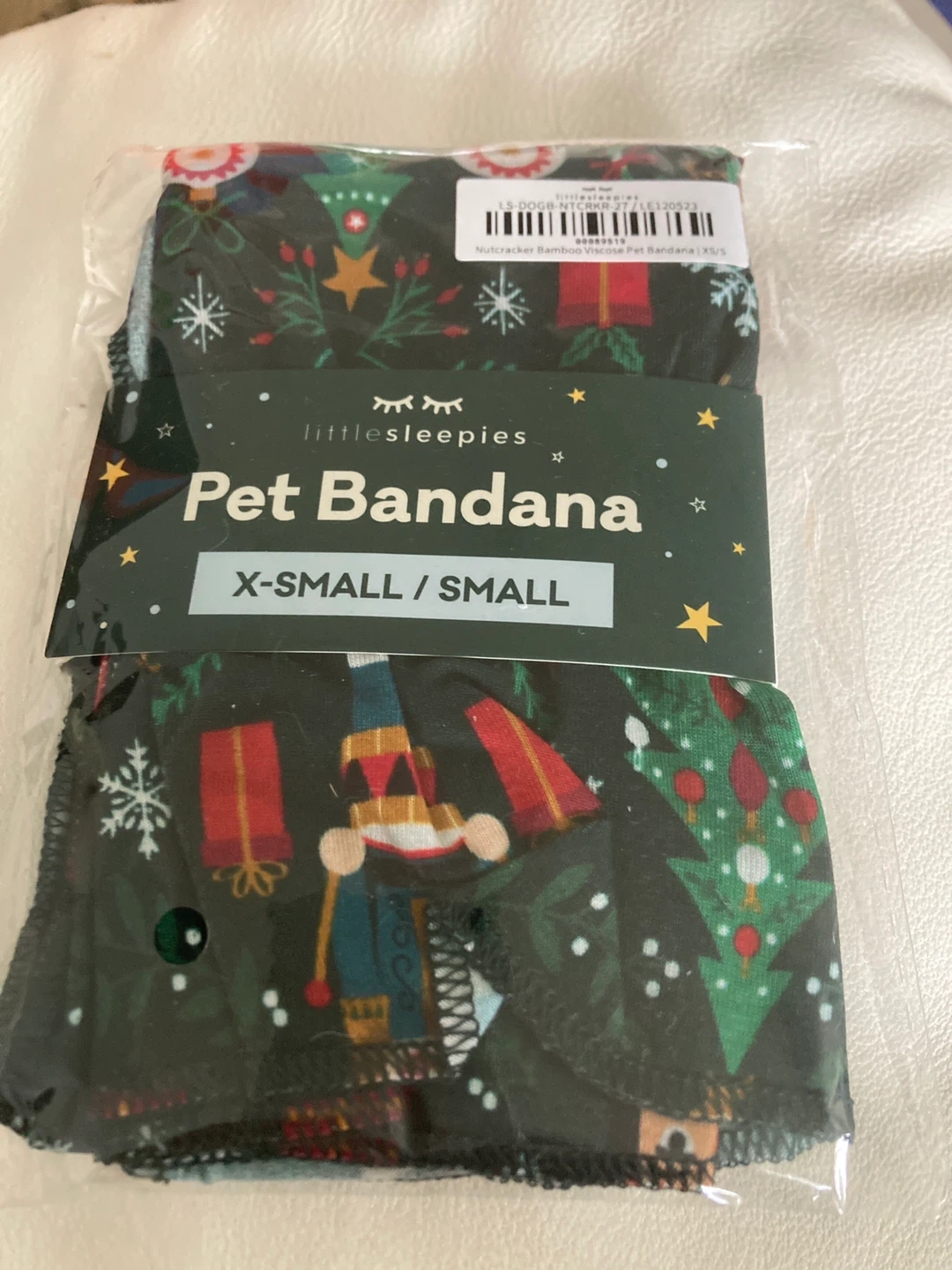 This is a brand new Little Sleepies pet bandana in size X-SMALL/SMALL! It's made of bamboo viscose and features a festive nutcracker design. Perfect for your furry friend this holiday season