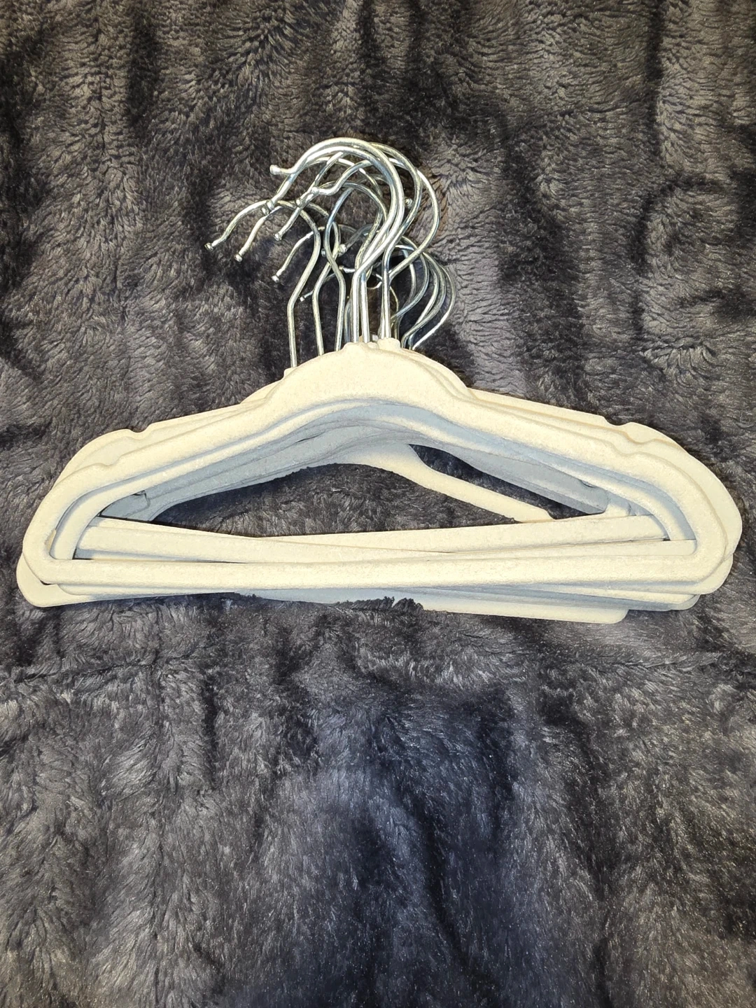 They're in great condition and ready to keep your clothes organized and wrinkle-free. The velvet material prevents clothes from slipping off, and the slim design saves space in your closet