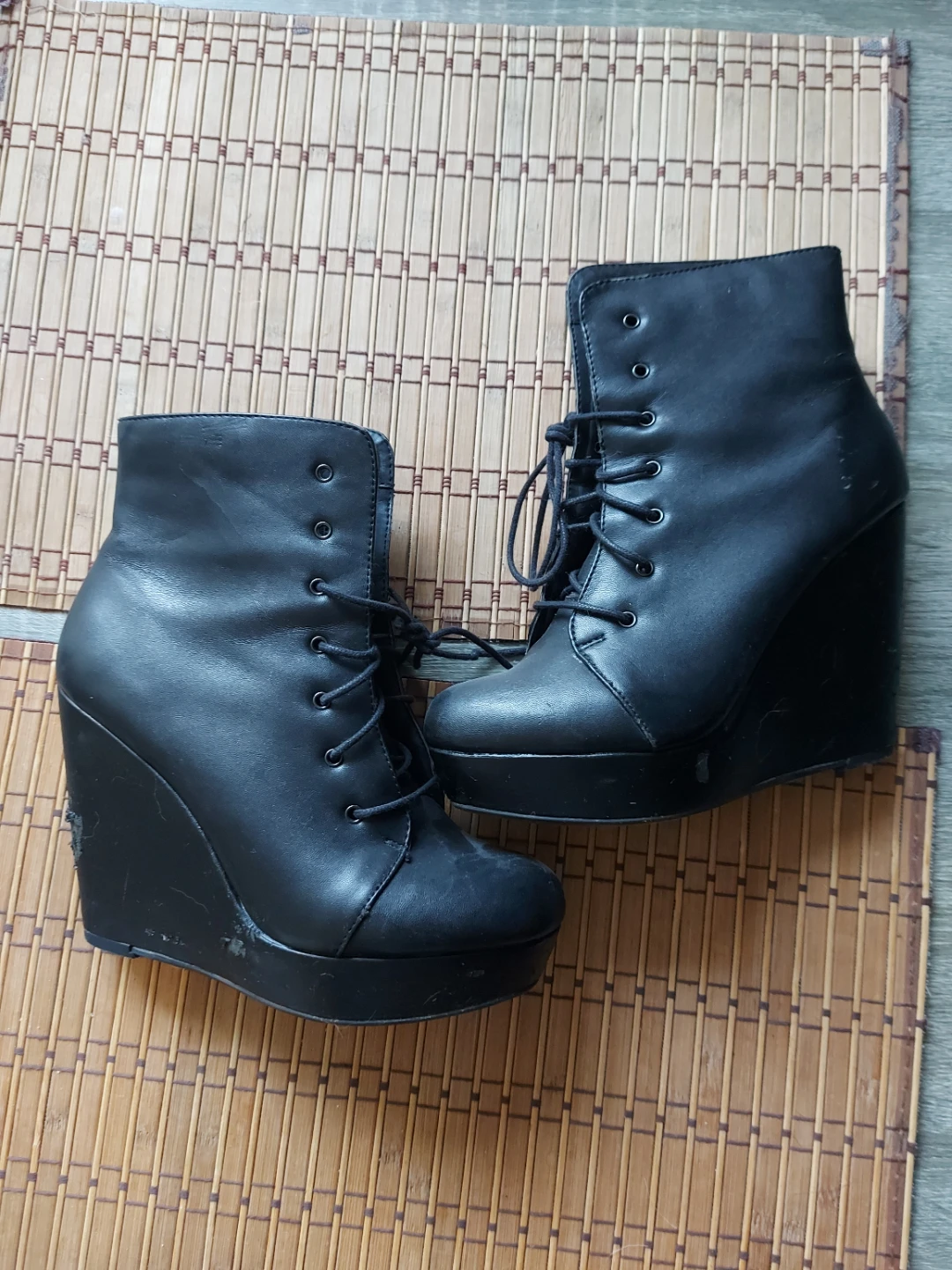 Buy & SellBlack Wedge Heel Lace-Up BootsBlack Wedge Heel Lace-Up Boots$2Selling a pair of black wedge heel lace-up boots. They show some signs of wear, as seen in the photos Womens size 7ConditionGoodWHERE TO MEETCollege ParkView MapSELLERBooCollege Park36340 reviews2 chats·3 favorites·70 viewsSEND CHAT TO SELLERHi Boo! I’m interested in your listing.Hi Boo! I’m interested in your listing.Get the Karrot app to chatSign In to chat