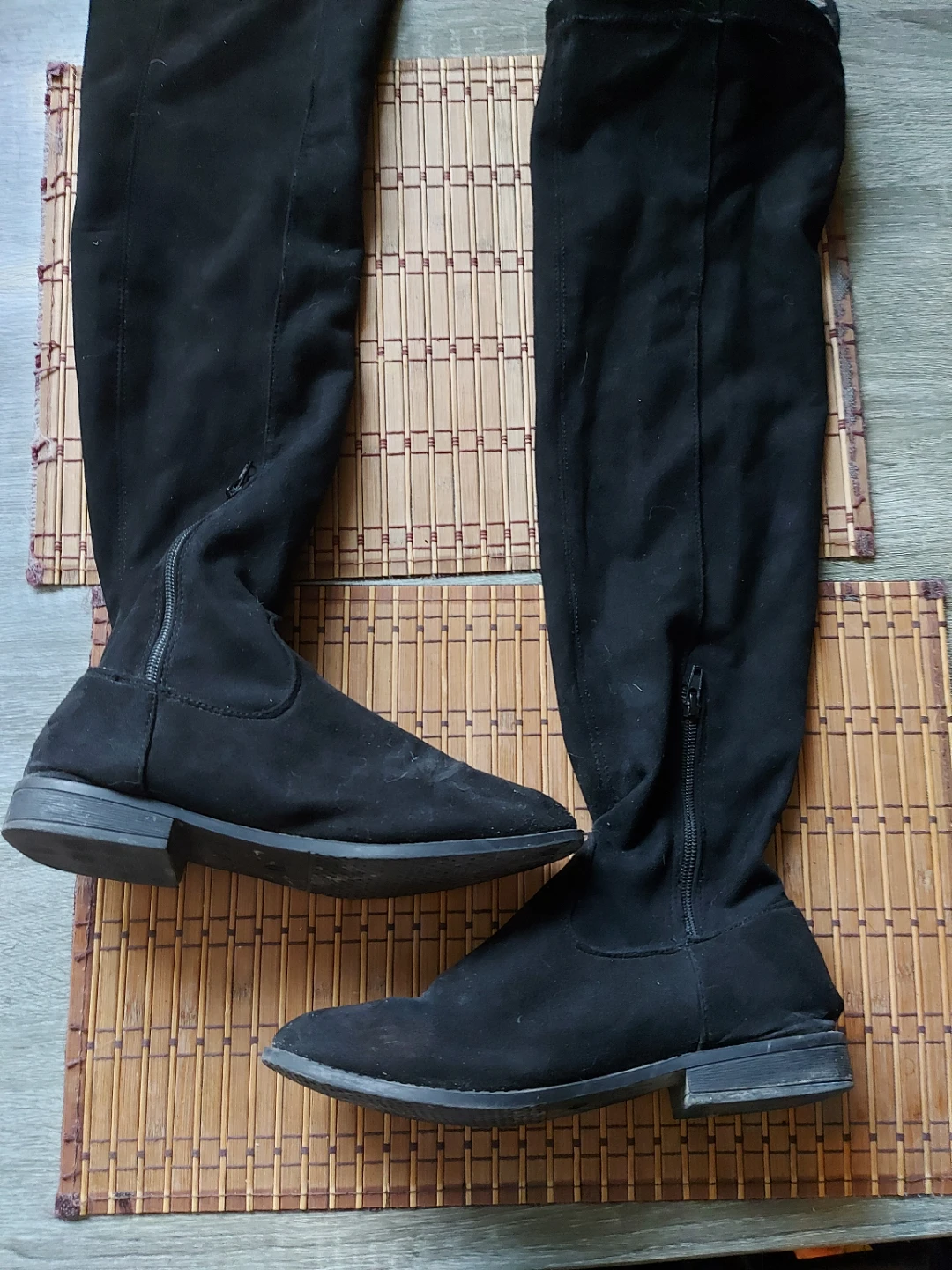 Selling a pair of black over-the-knee boots. They have a zipper on the side and a low heel. They are in good used condition.