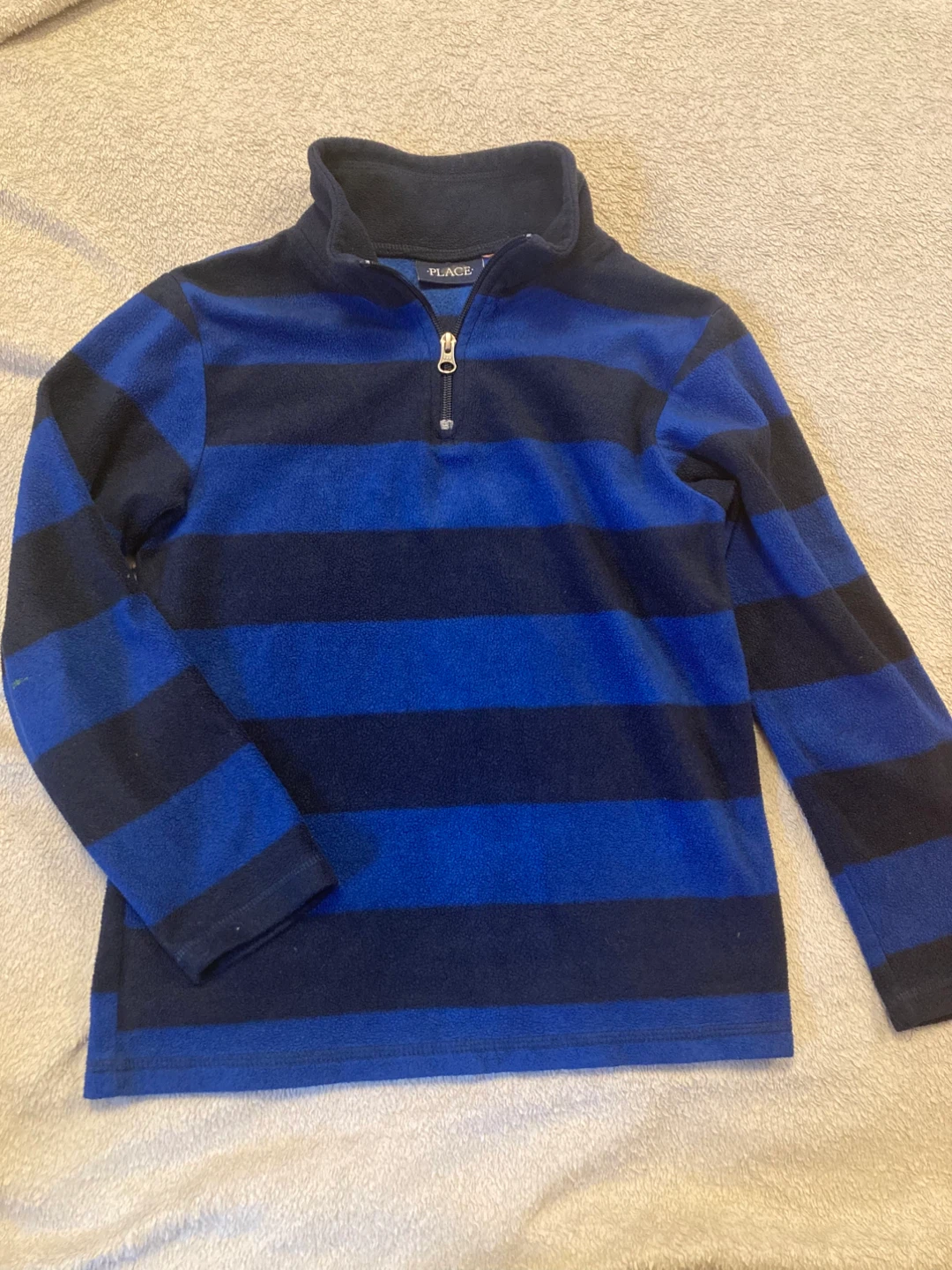 Here's a cozy fleece pullover from The Children's Place! It features a blue and navy striped pattern and a quarter-zip neckline. Perfect for keeping your little one warm on chilly days! Approx size age 7-8