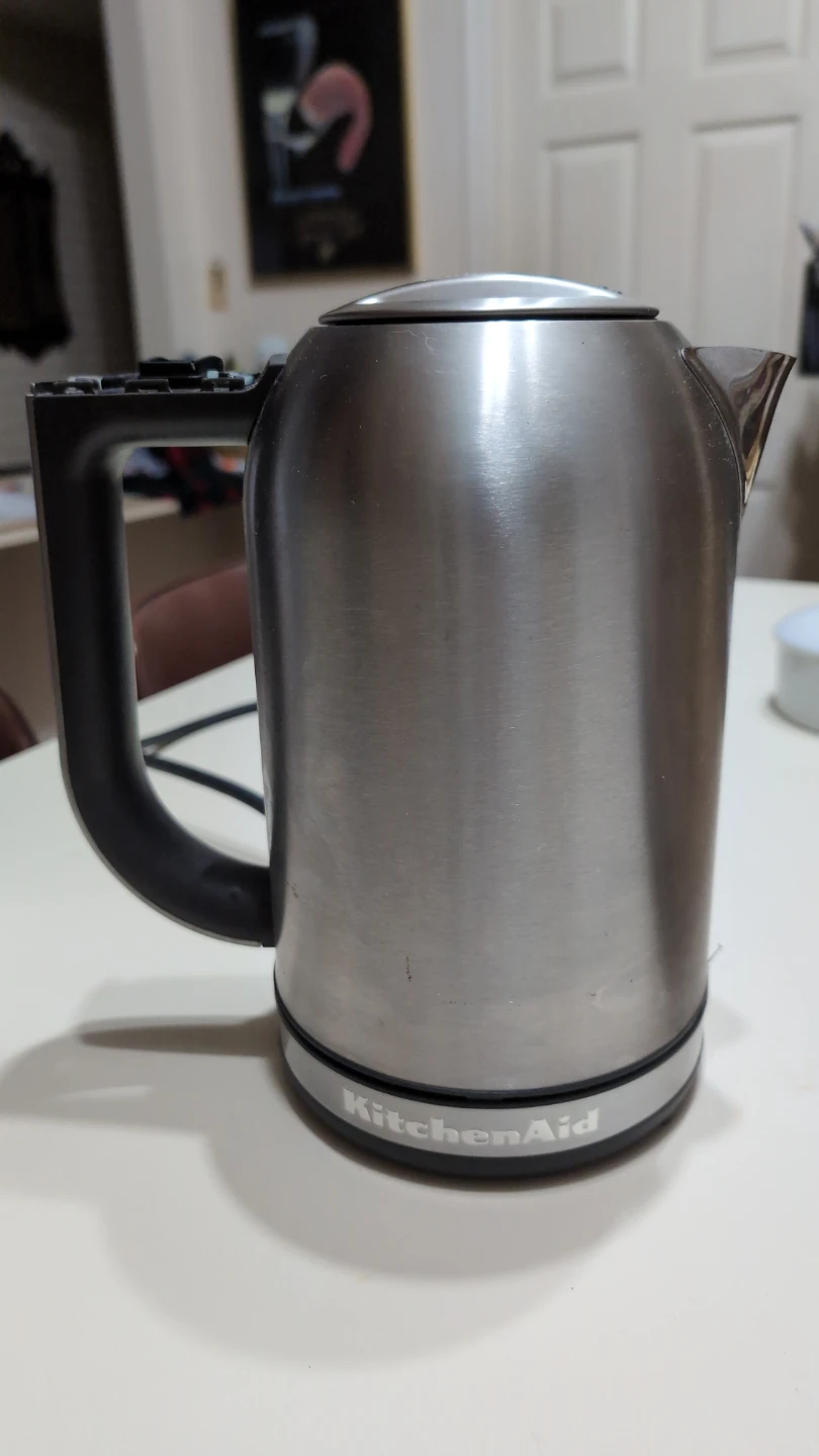 Gifting this Kitchenaid kettle. Slightly damaged but works fine! Perfect for tea, coffee, or any hot beverage