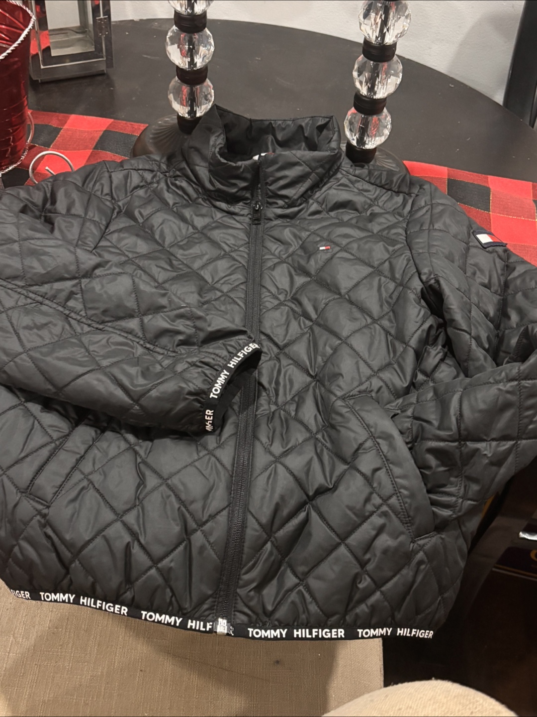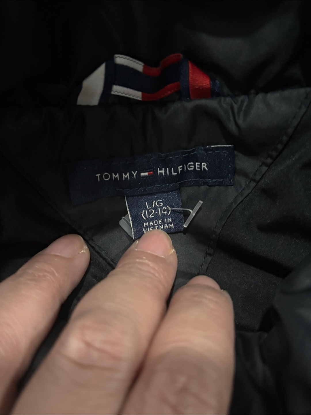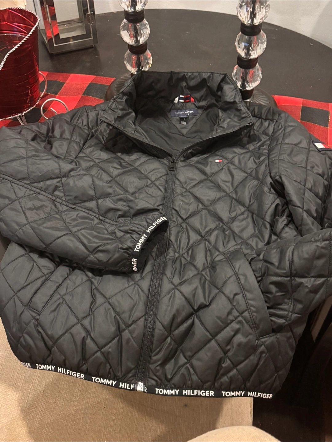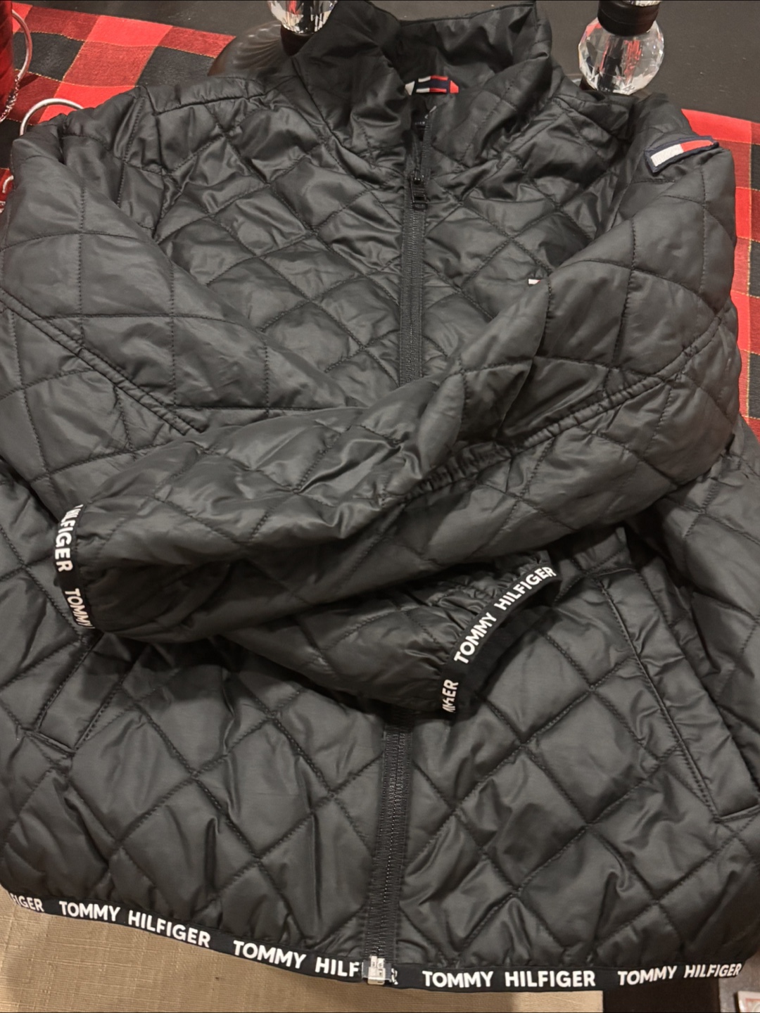 I'm selling a gently used Tommy Hilfiger quilted jacket. It's black and in great condition. The size is L (12-14). Perfect for keeping warm during those chilly days! Light jacket that can be layered up.