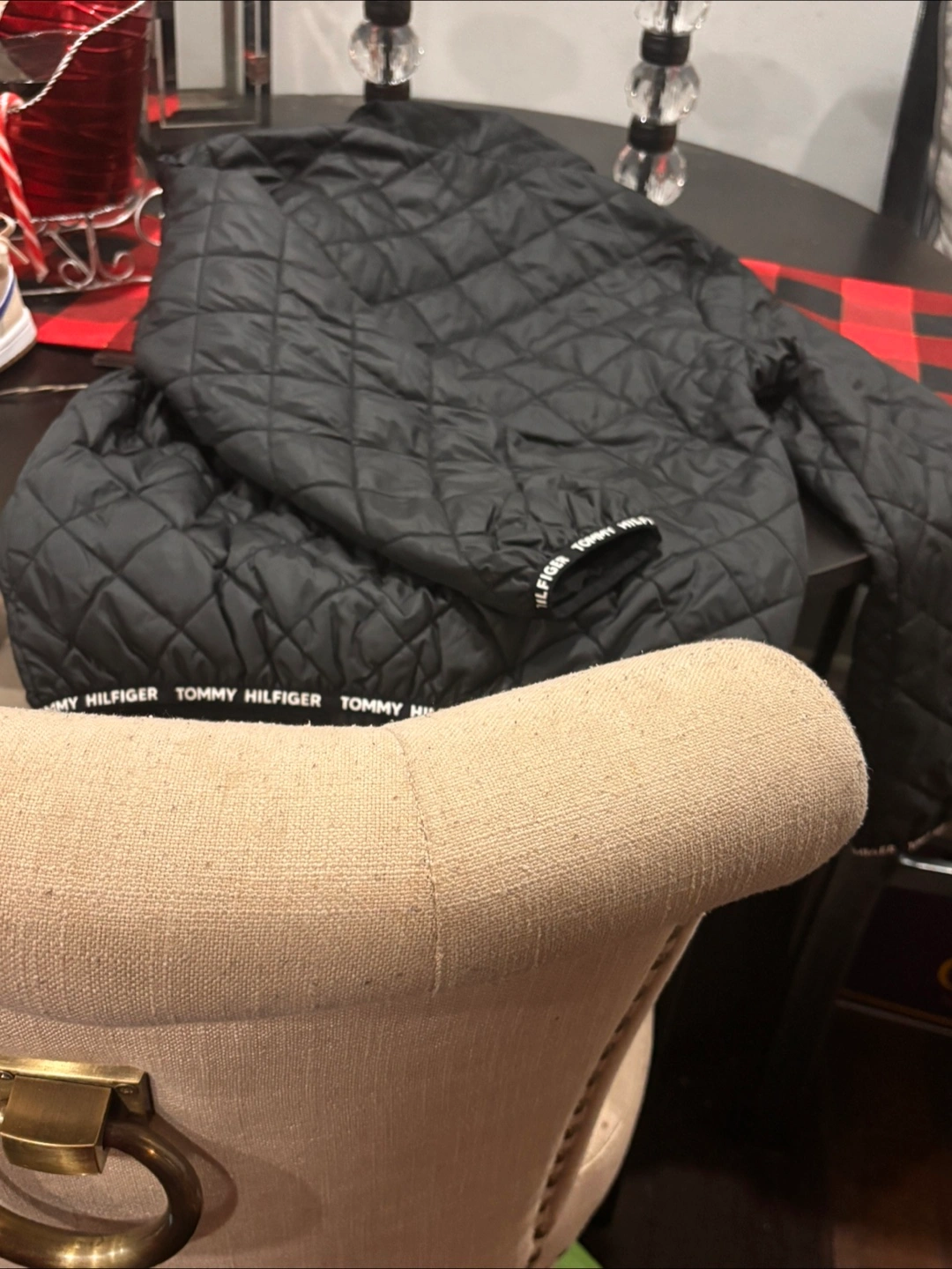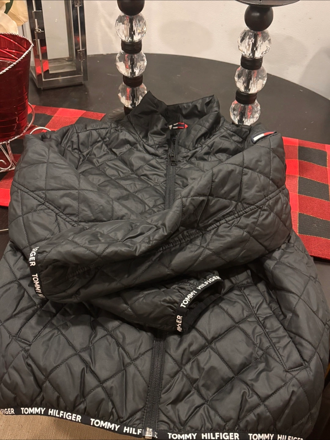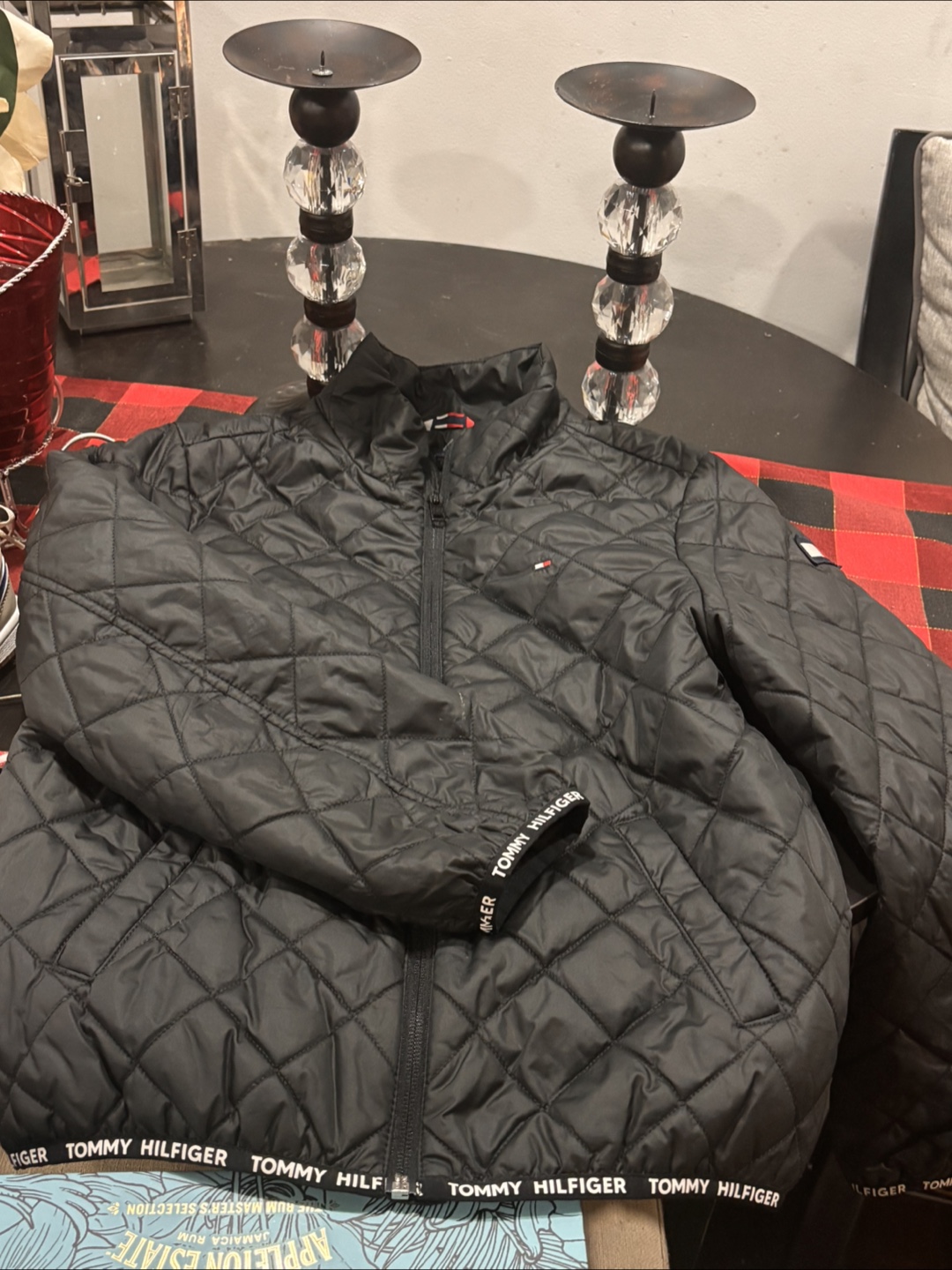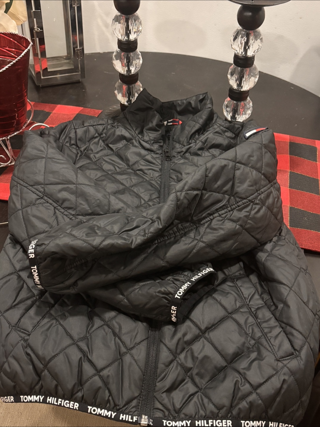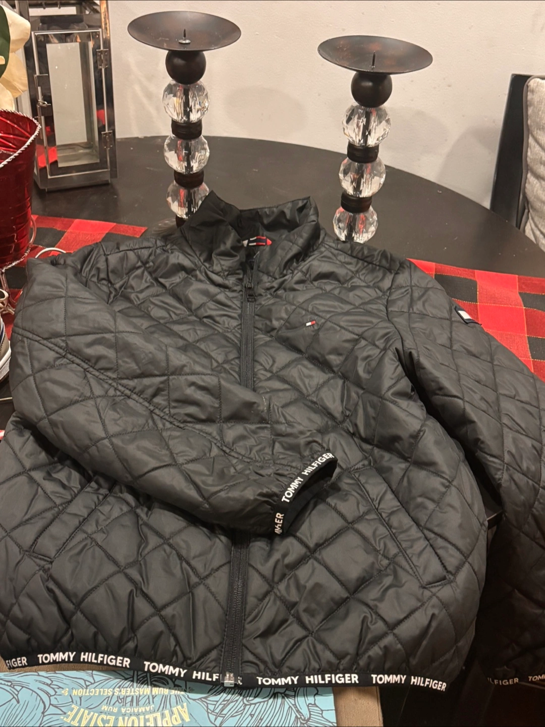 I'm selling a gently used Tommy Hilfiger quilted jacket. It's black and in great condition. The size is L (12-14). Perfect for keeping warm during those chilly days! Light jacket that can be layered up.