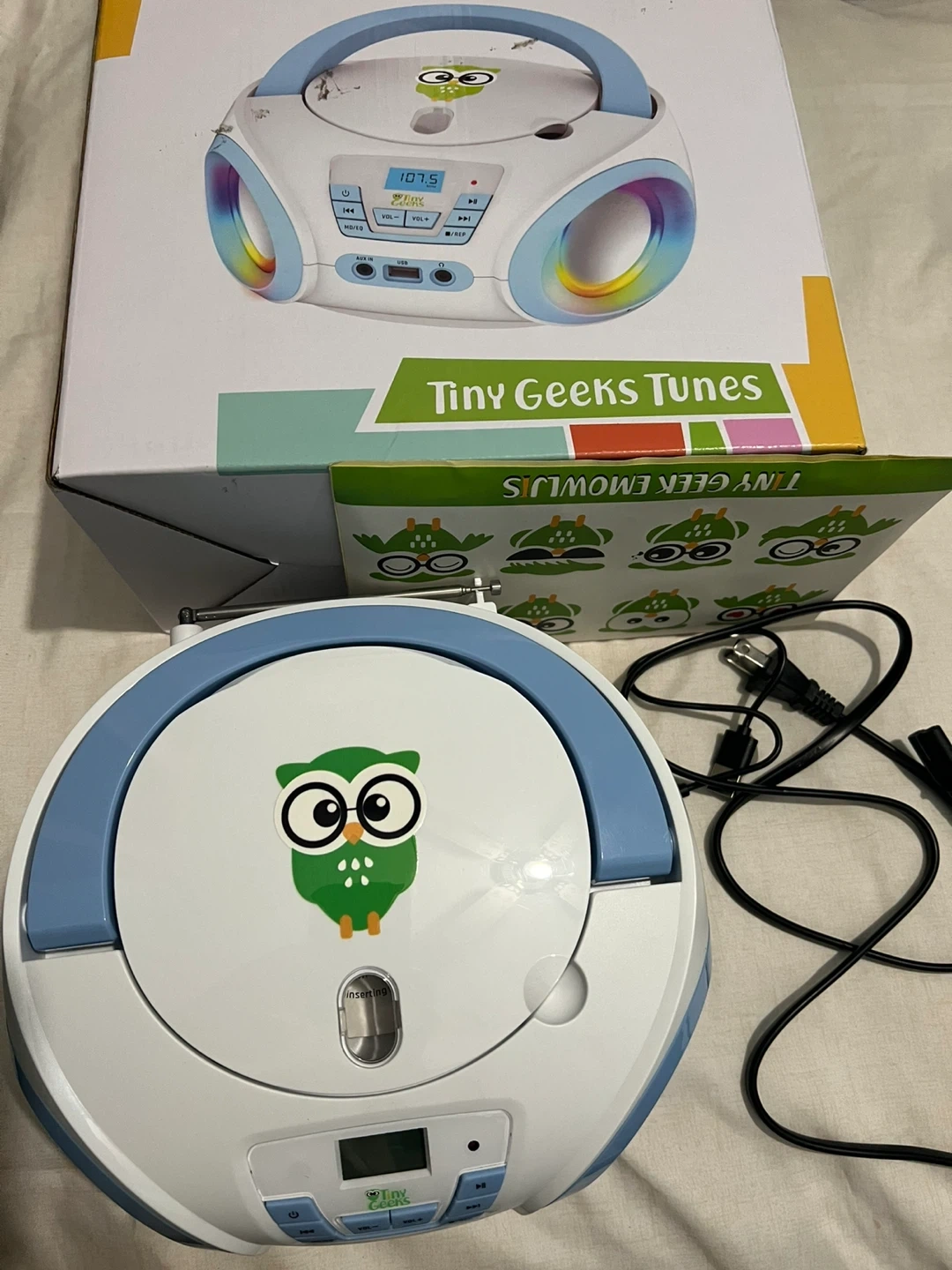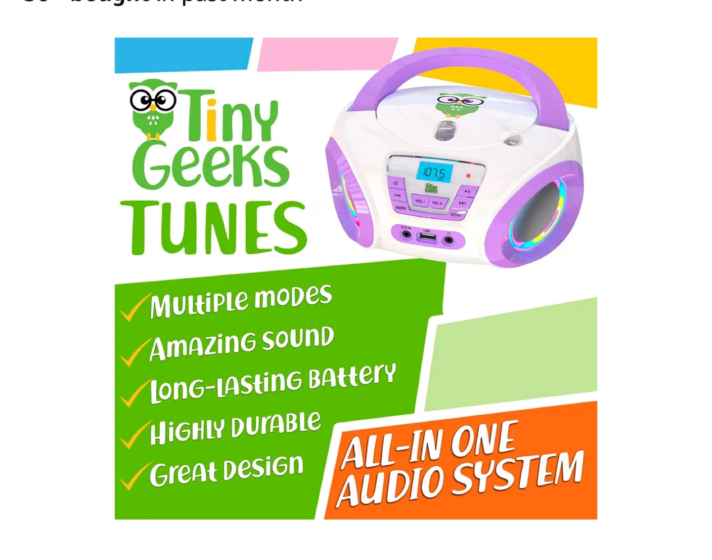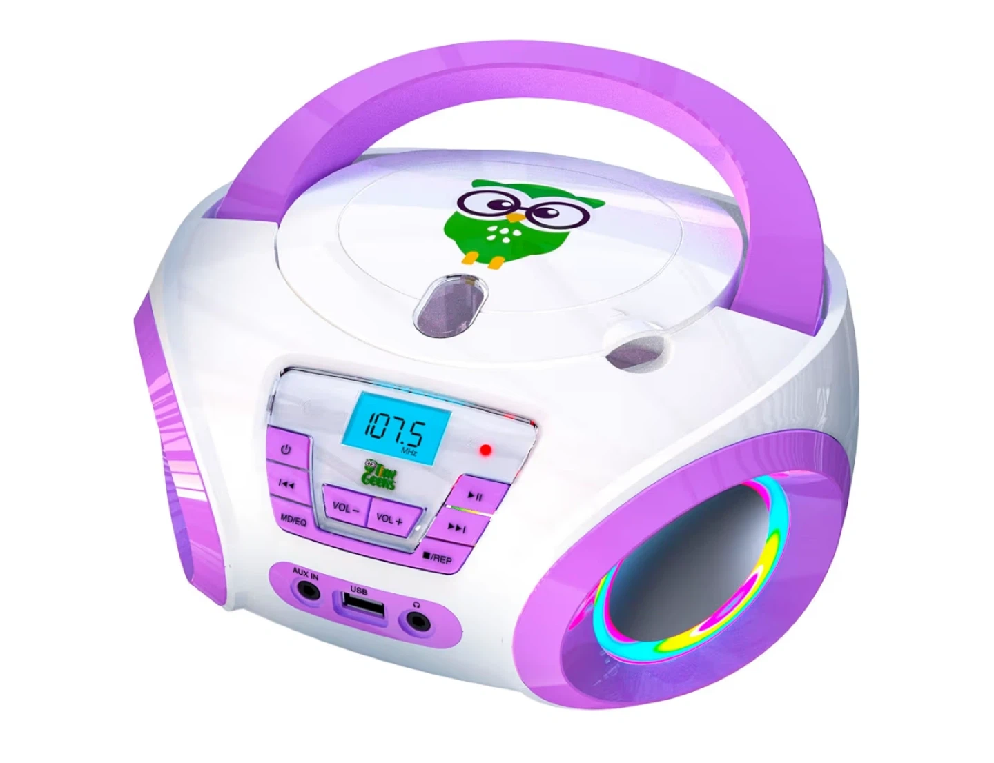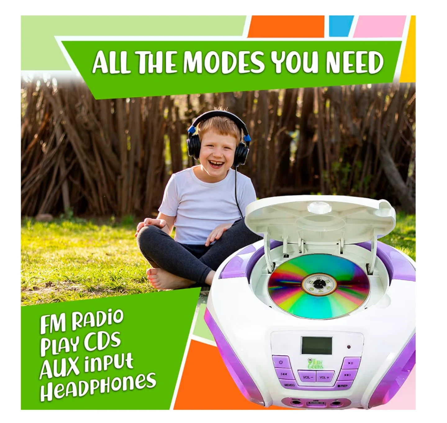 Get ready to groove with this Tiny Geeks Tunes CD player! It's an all-in-one audio system that's perfect for kids. It includes FM radio, plays CDs, has an AUX input, and even works with headphones.