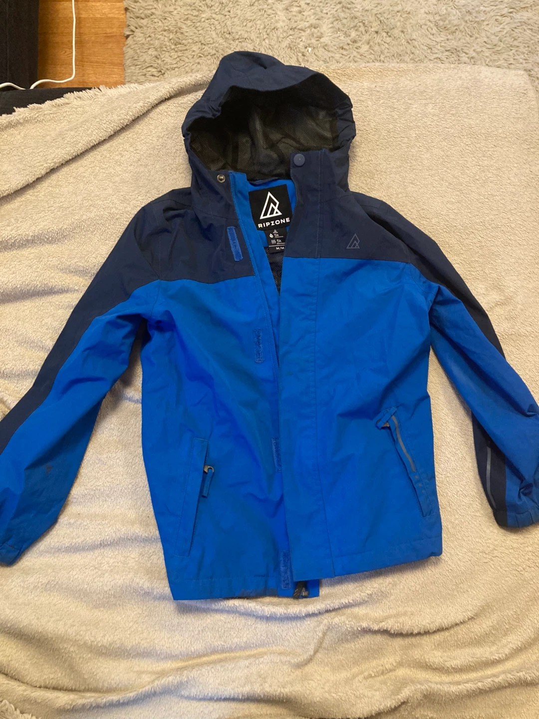 This is a Ripzone kids' rain jacket in blue. It's a size M/M and in great condition. Perfect for keeping your little one dry on those rainy days!