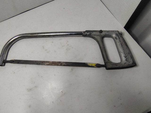 This is a hacksaw, perfect for cutting metal or plastic, featuring a sturdy frame and a comfortable grip. Given that it's in used condition, it's perfect for someone who needs a reliable tool without breaking the bank. The blade shows signs of use, but it still has life left.