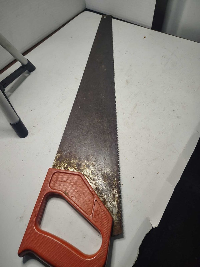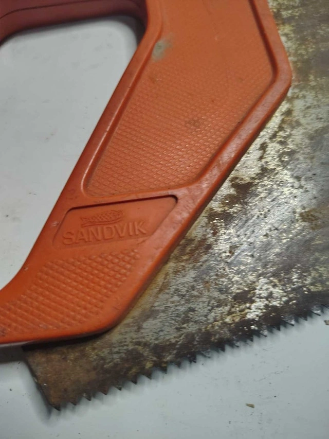 This is a vintage Sandvik hand saw, perfect for collectors or those looking for a classic tool. It is a sturdy saw with a comfortable grip, ideal for various woodworking tasks. Being a vintage item, it shows signs of wear consistent with its age, but it remains functional and ready for use. The blade exhibits some surface rust, which is typical for tools of this era. * Brand: Sandvik * Type: Hand Saw * Vintage item This hand saw is priced to sell at CAD $25 obo