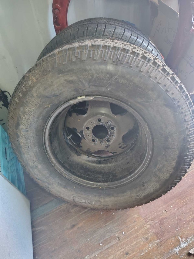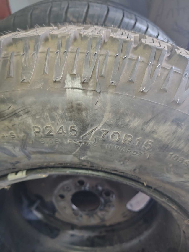 I'm selling a Goodyear Wrangler A/T P245/70R15 tire, still mounted on a wheel. This tire is unused. It's just been sitting in my garage.