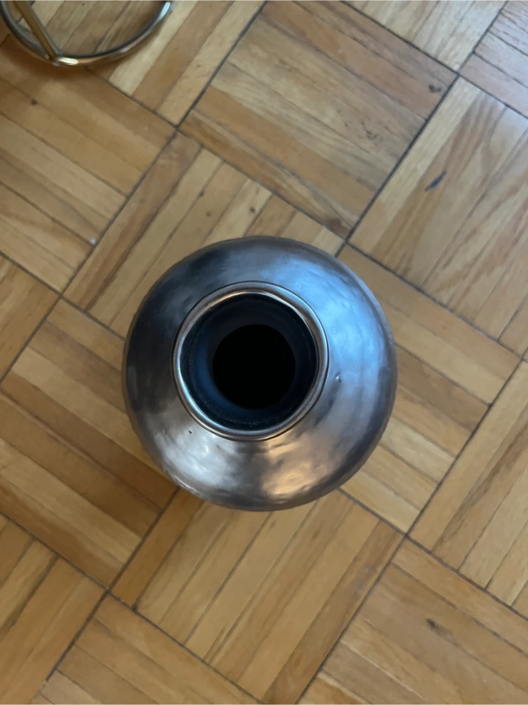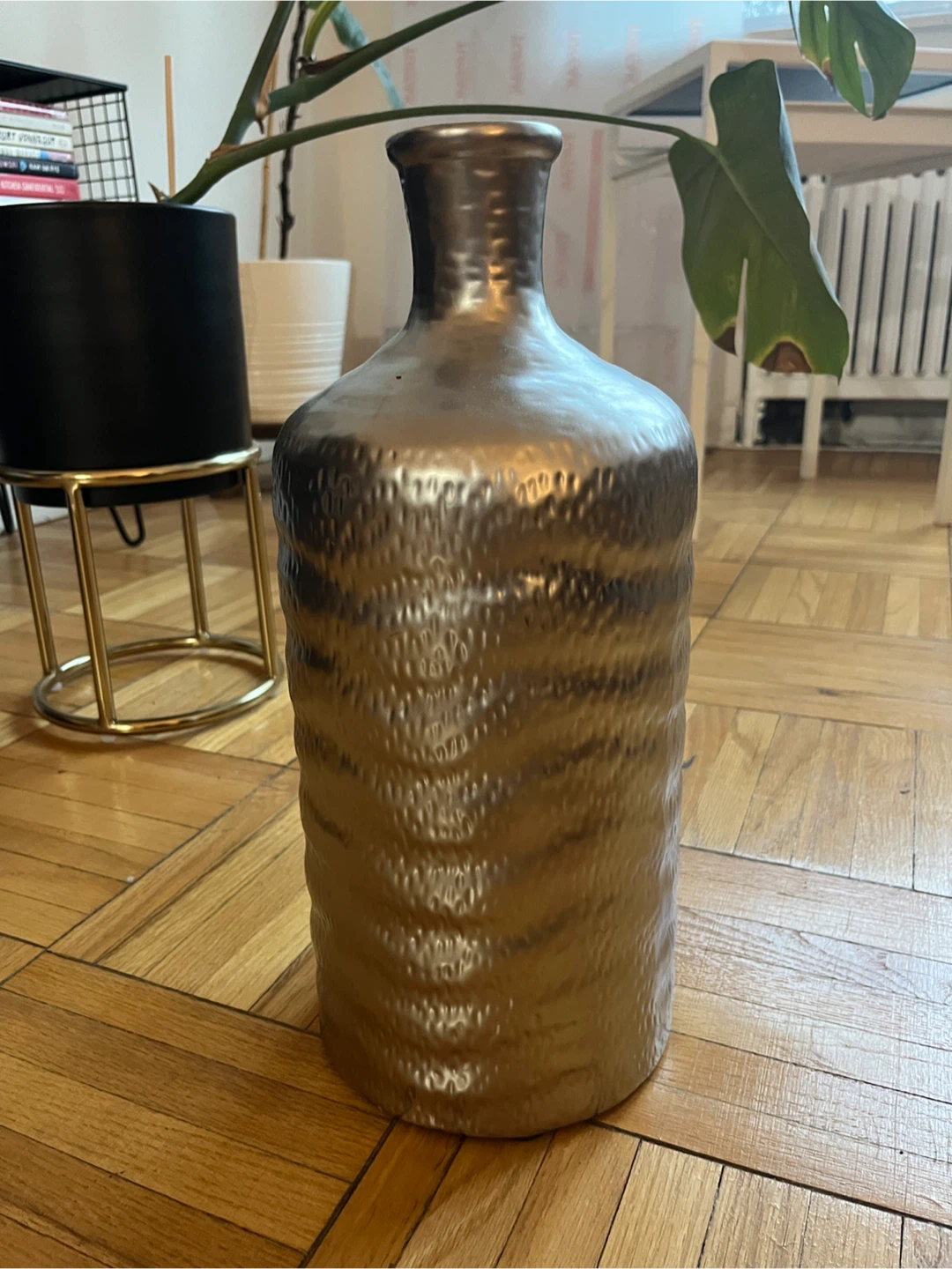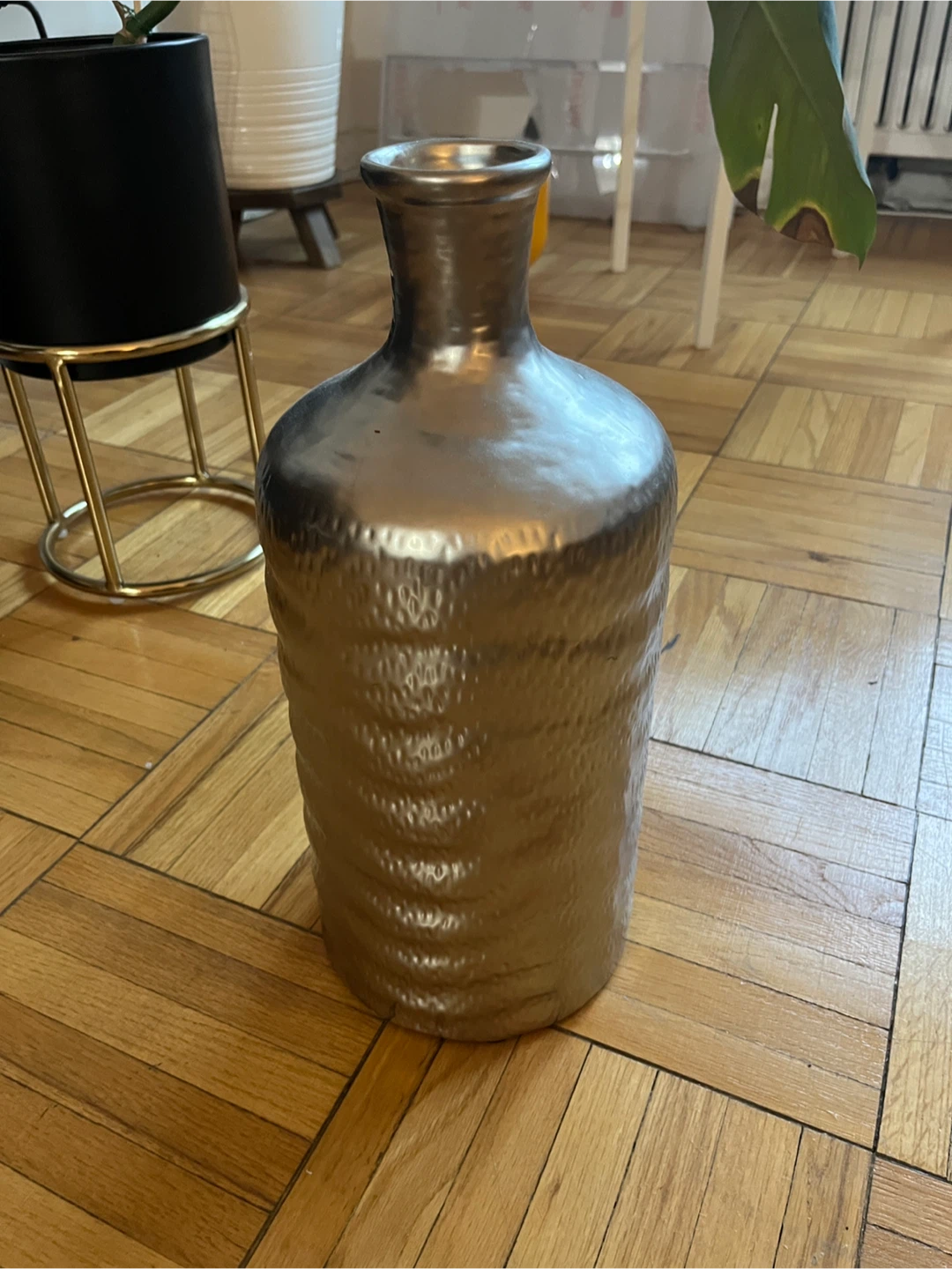 Selling a beautiful hammered metal vase! It's in great condition and would look lovely in any home. The vase has a unique texture and a stylish design that catches the eye. It's perfect for displaying flowers or as a standalone decorative piece