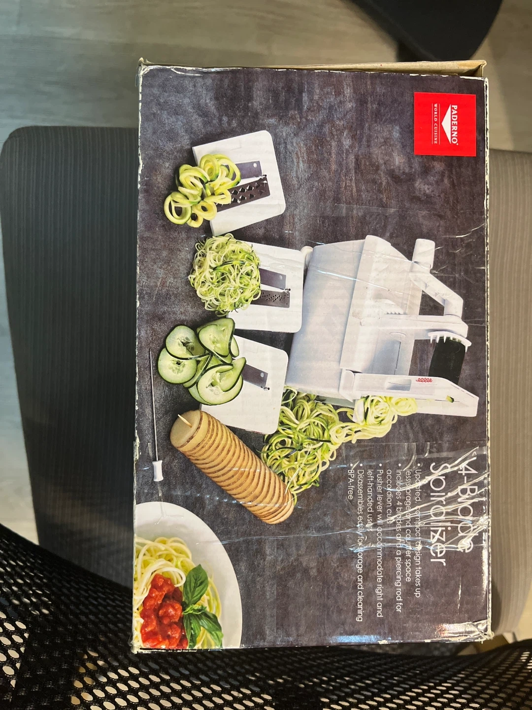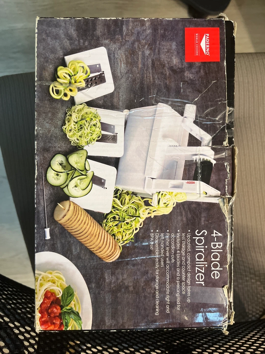 I'm selling a Paderno 4-Blade Spiralizer. This spiralizer has a compact design that takes up less storage and counter space. It also includes 4 blades and a piercing tool for accordion cuts. It's perfect for both right and left-handed users, and disassembles easily for storage and cleaning