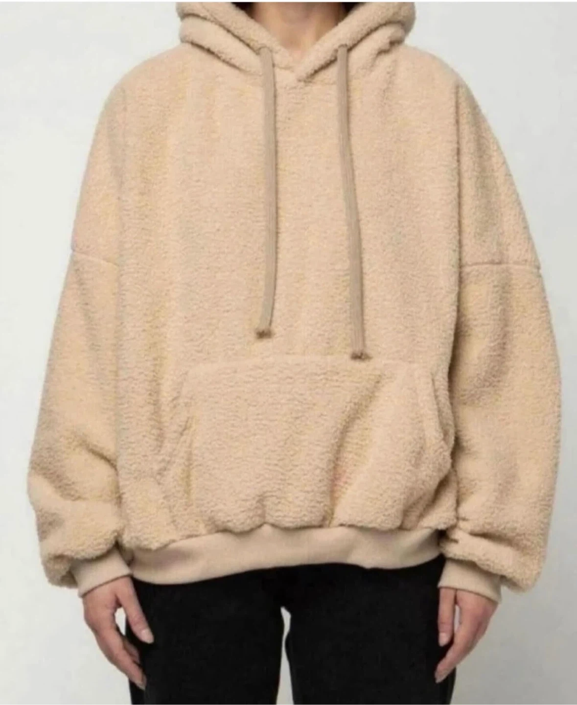 Cozy up in this super soft beige teddy bear hoodie! It's perfect for chilly days and lounging around the house. The material is so comfy, you won't want to take it off!