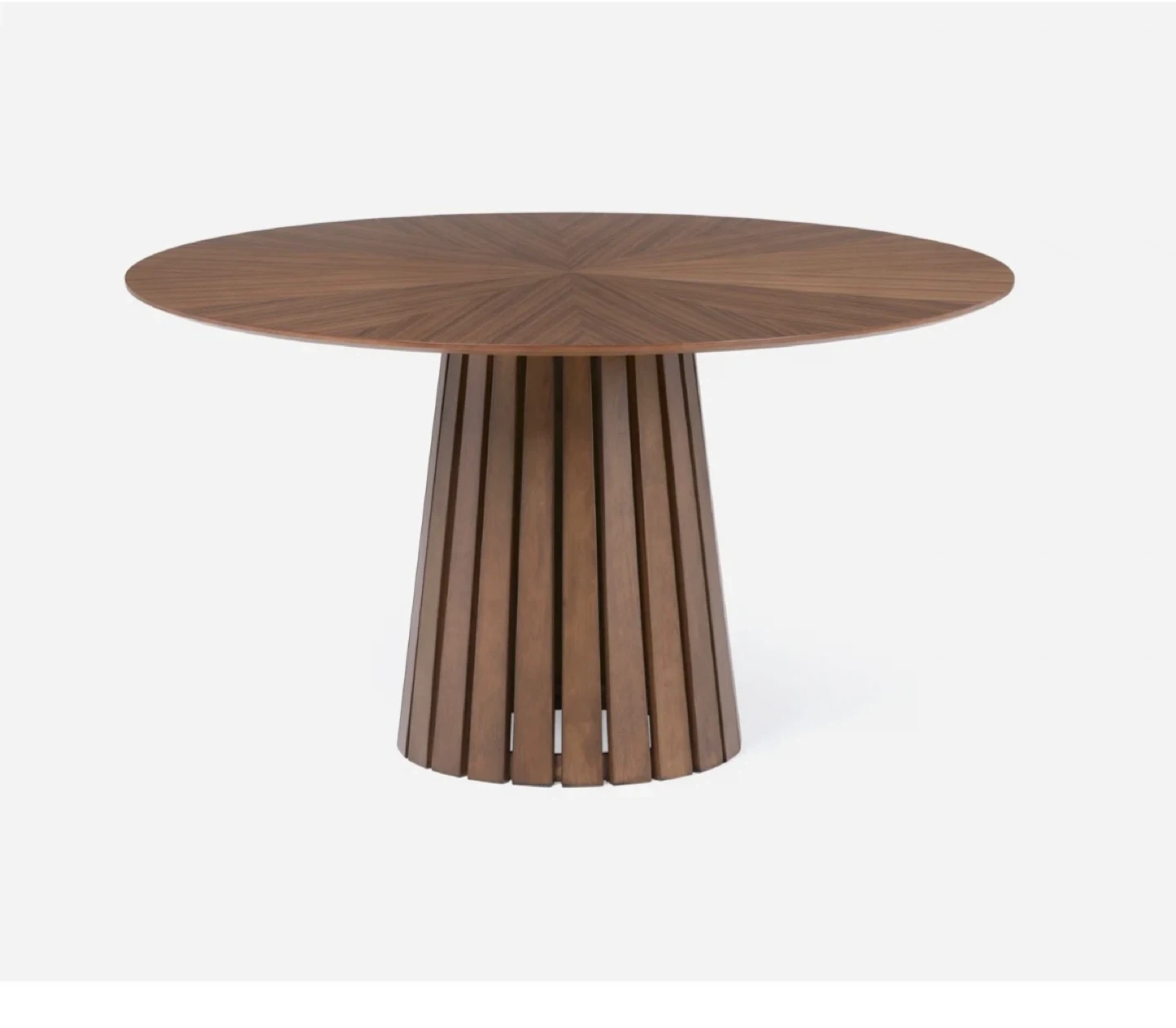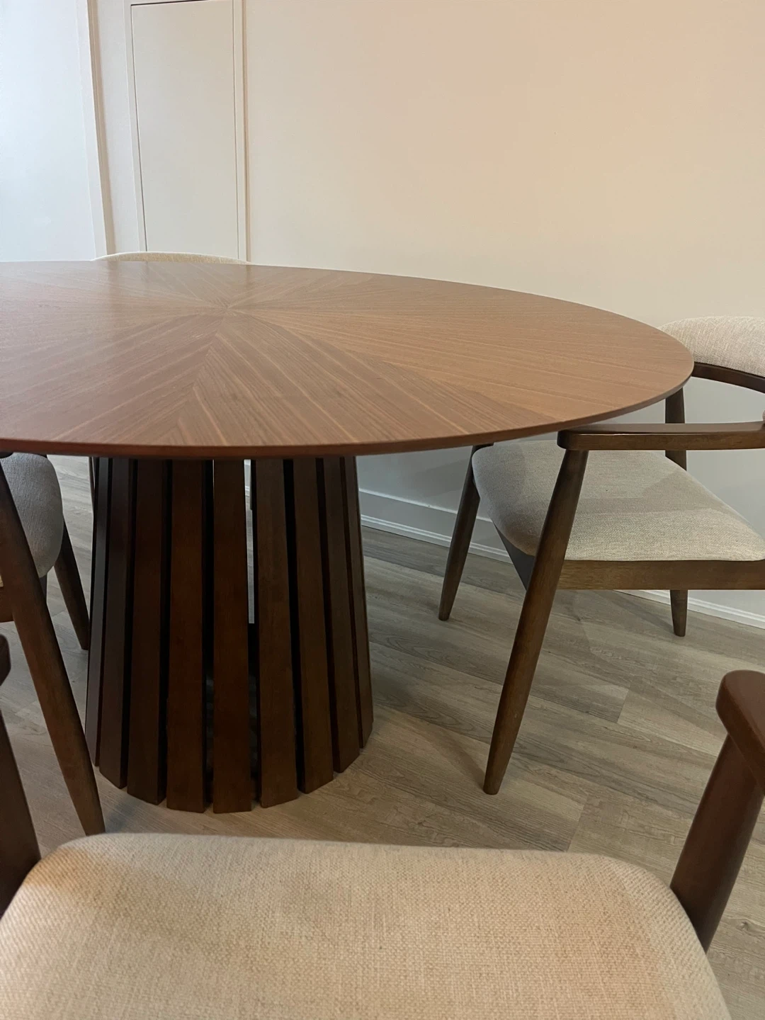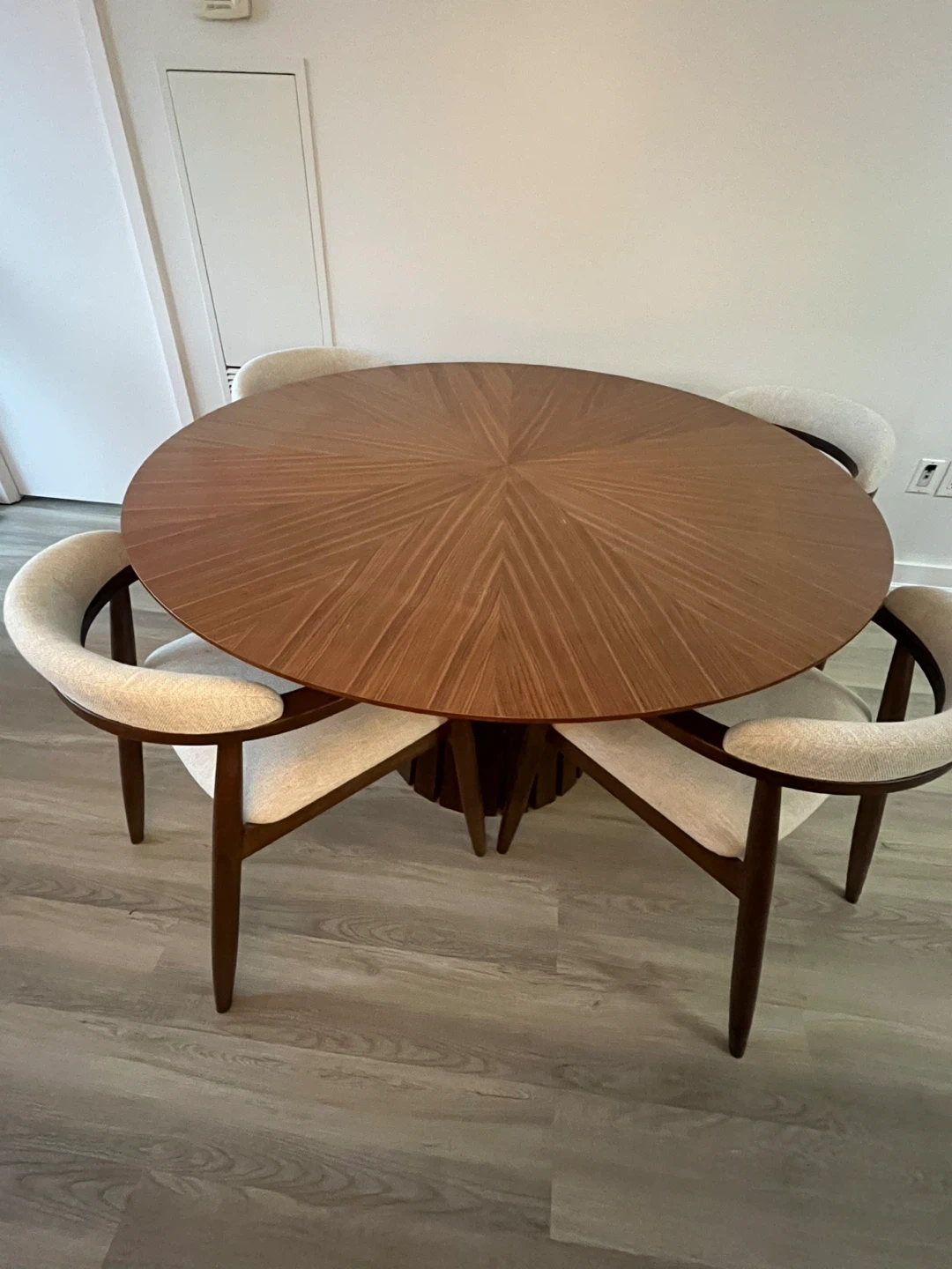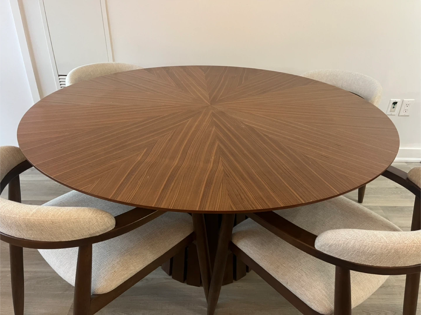 Selling a round dining table (optional: I also have a set of 4 chairs for 650$) The table has a unique base design and a beautiful wood grain pattern on the top. It's a great set for a dining room