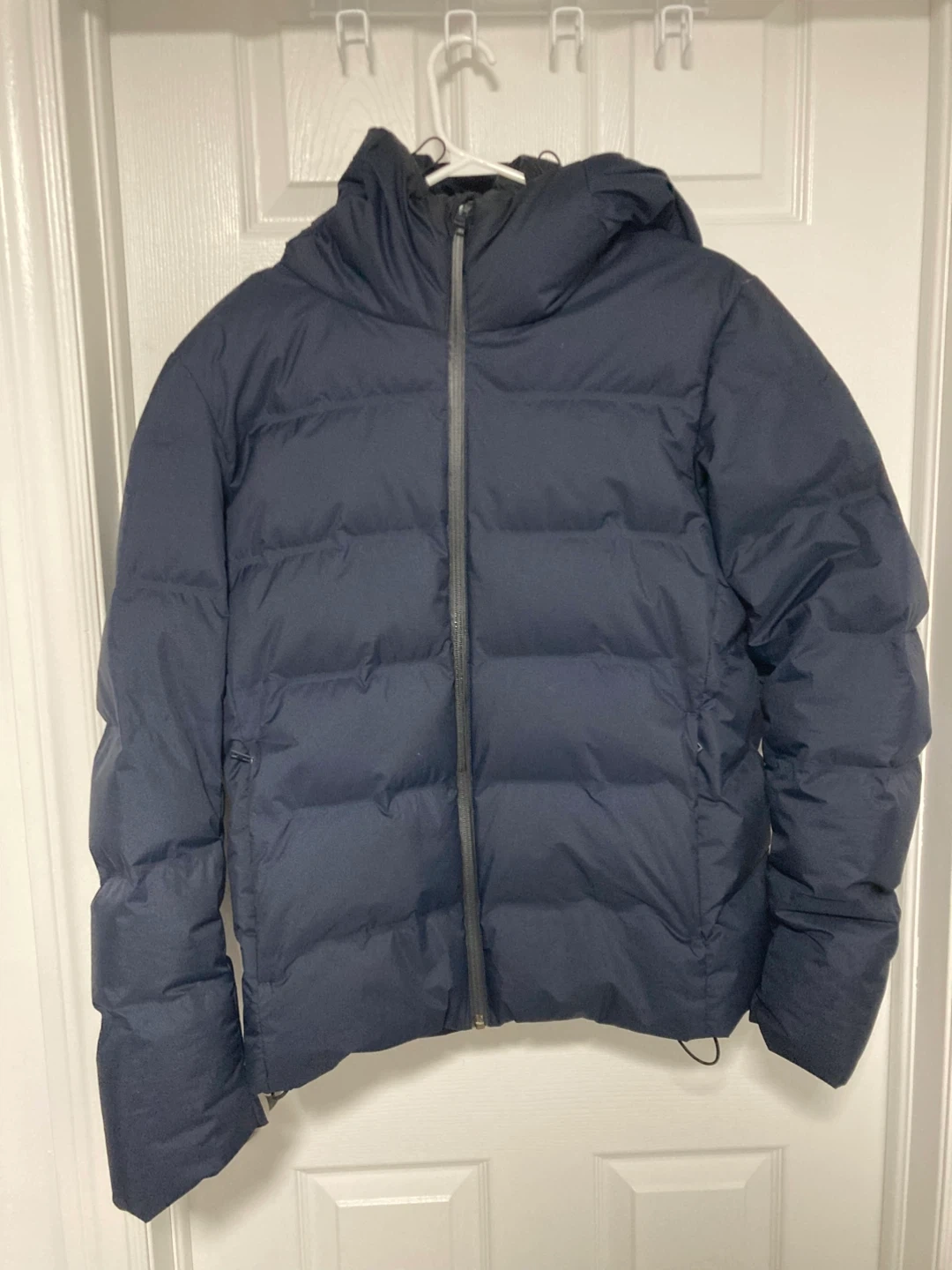 Here's a navy puffer jacket that's perfect for the colder weather! It looks to be in great condition and ready to keep you warm and cozy this winter