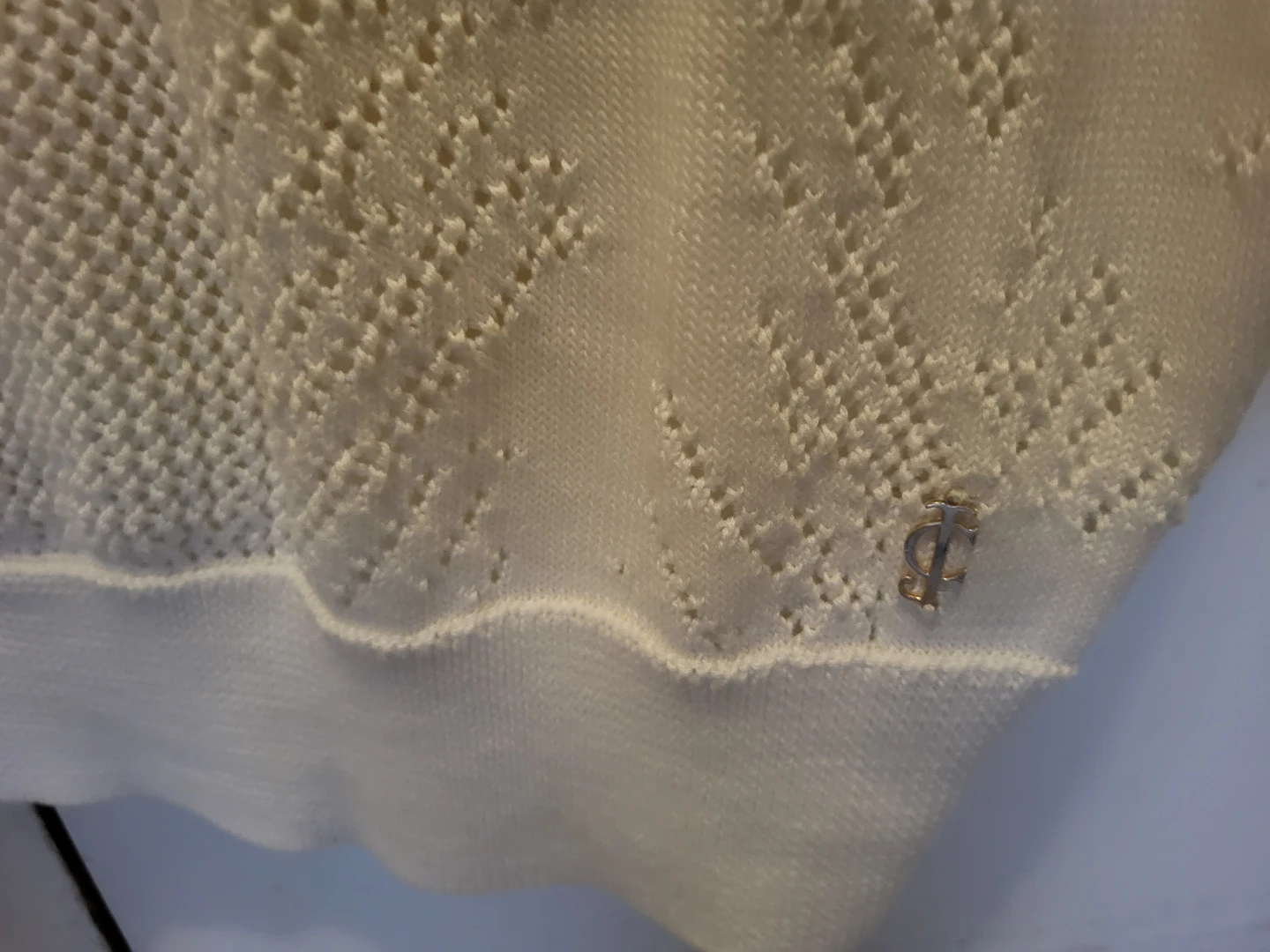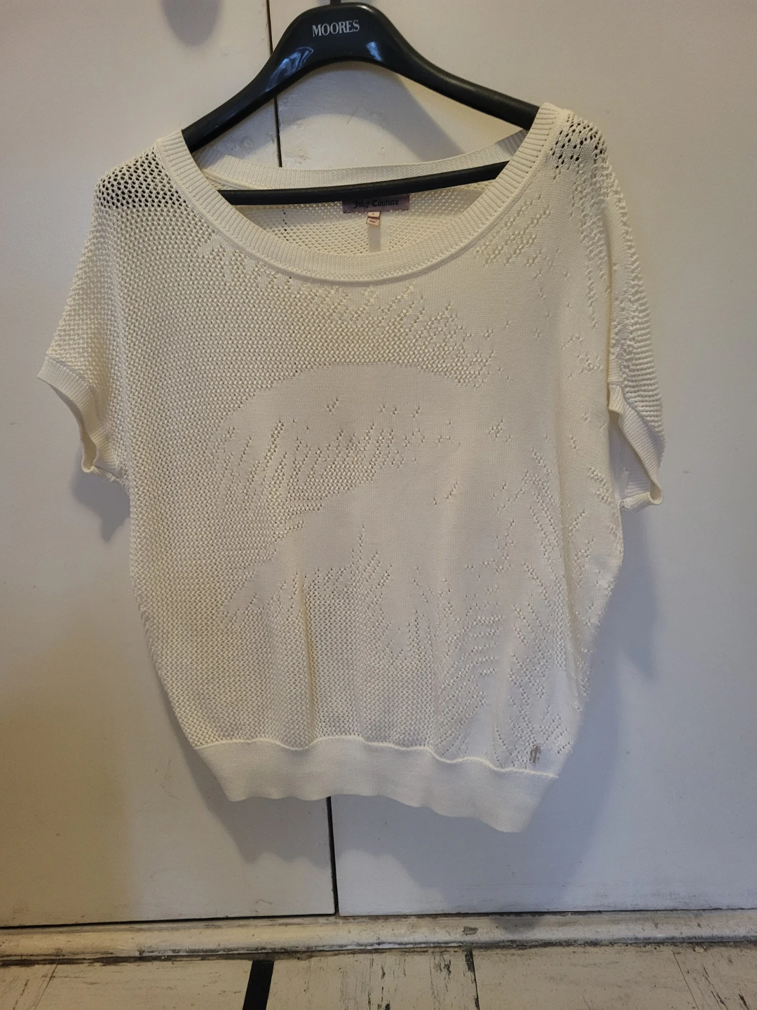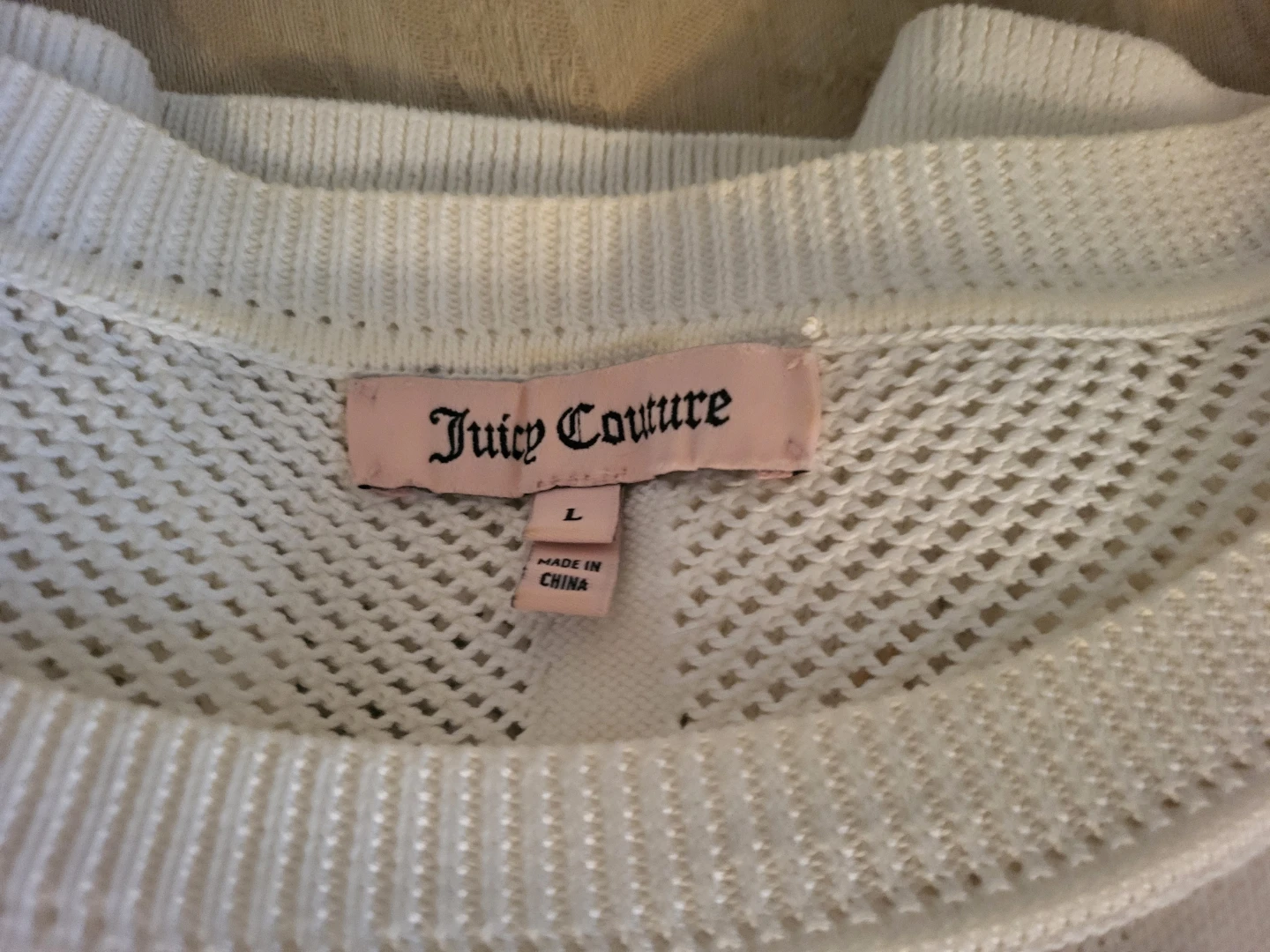 Selling a cute Juicy Couture knit top! It's a lovely white colour and size L. Perfect for a casual, comfy look. The material is soft and breathable, great for layering or wearing on its own. It has a nice open knit pattern throughout!