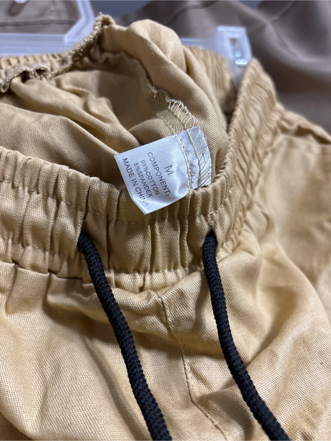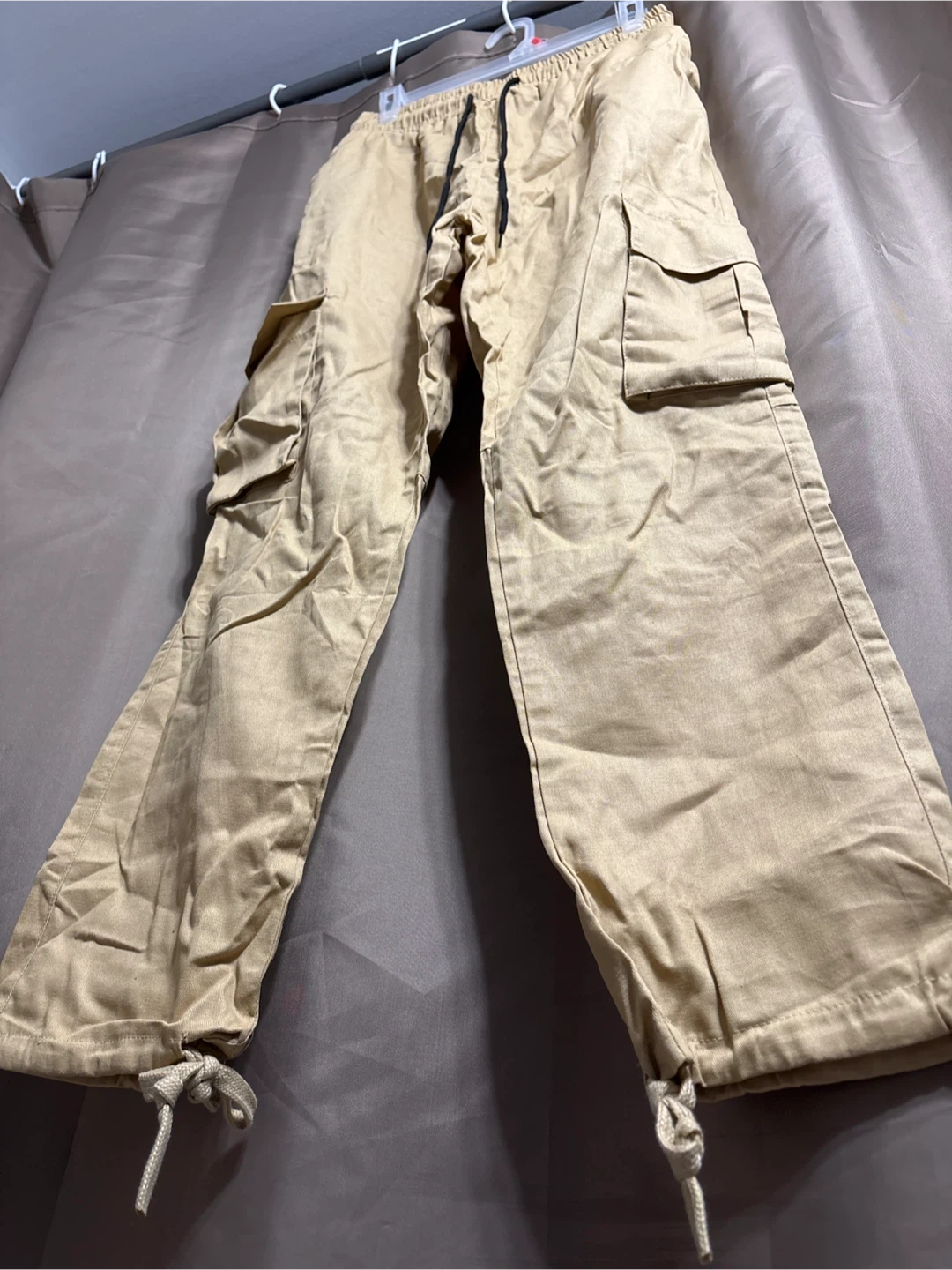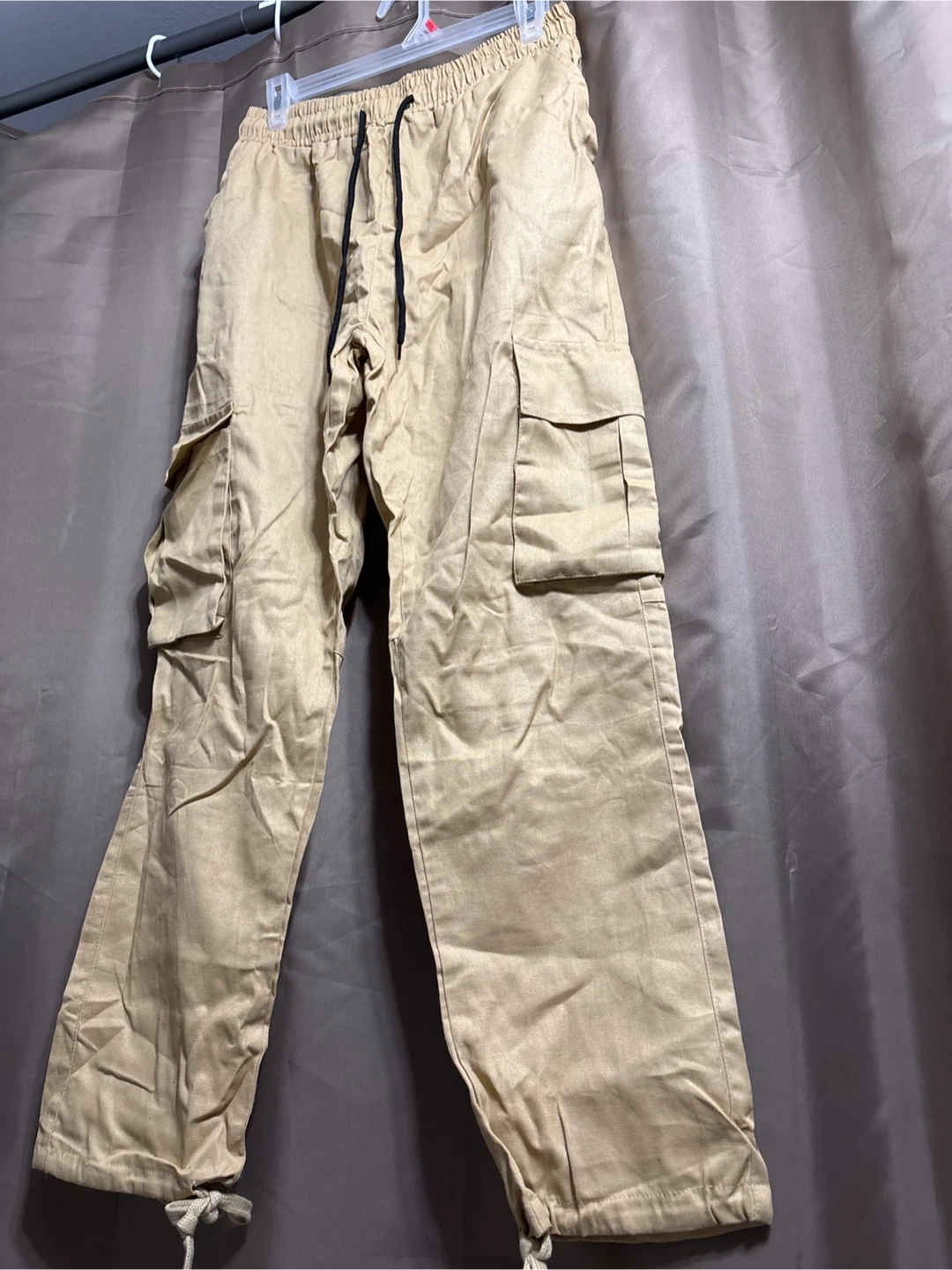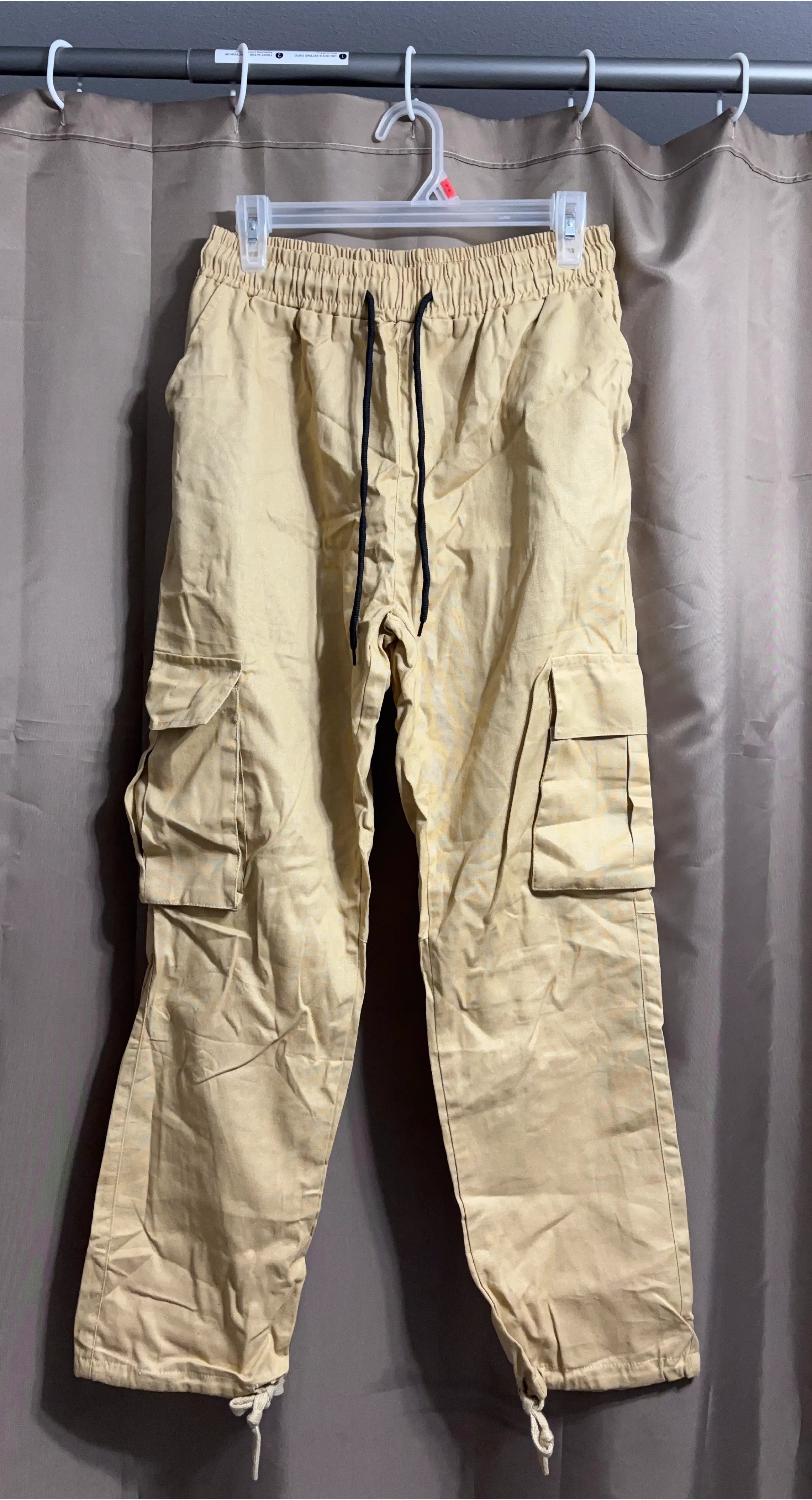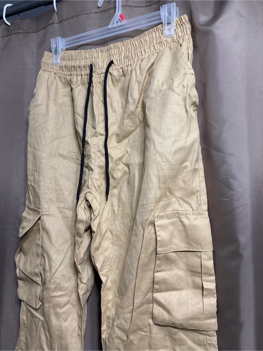 Khaki cargo pants in size medium. They're made of 100% polyester and have a comfortable elastic waistband with a drawstring. Can fit up to Large. New without tag.