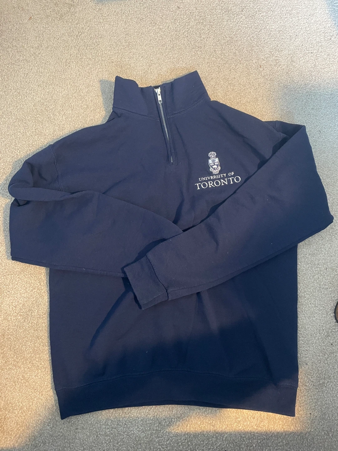 Selling a University of Toronto quarter-zip sweater from Jerzees Nublend! It's a size medium and in a nice navy colour. Perfect for showing off your school spirit!