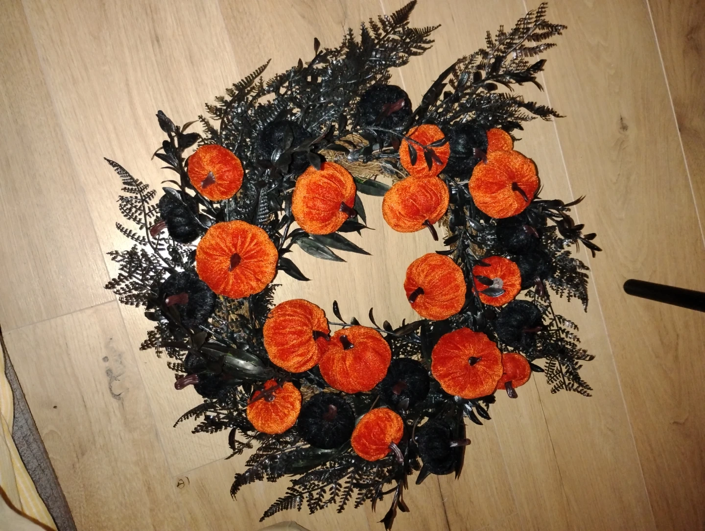 Add some spooky charm to your home with this Halloween pumpkin wreath! It features a mix of orange and black pumpkins nestled among black foliage. Perfect for your front door or as a festive wall decoration during the fall season