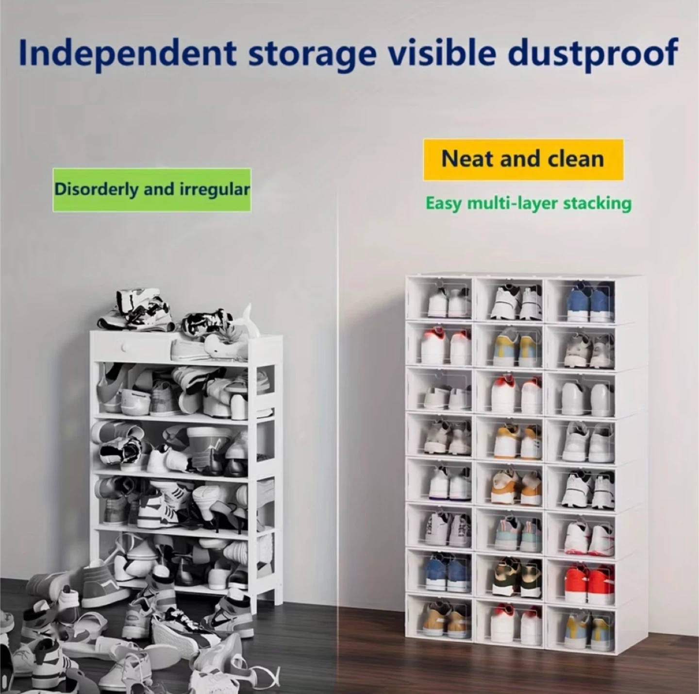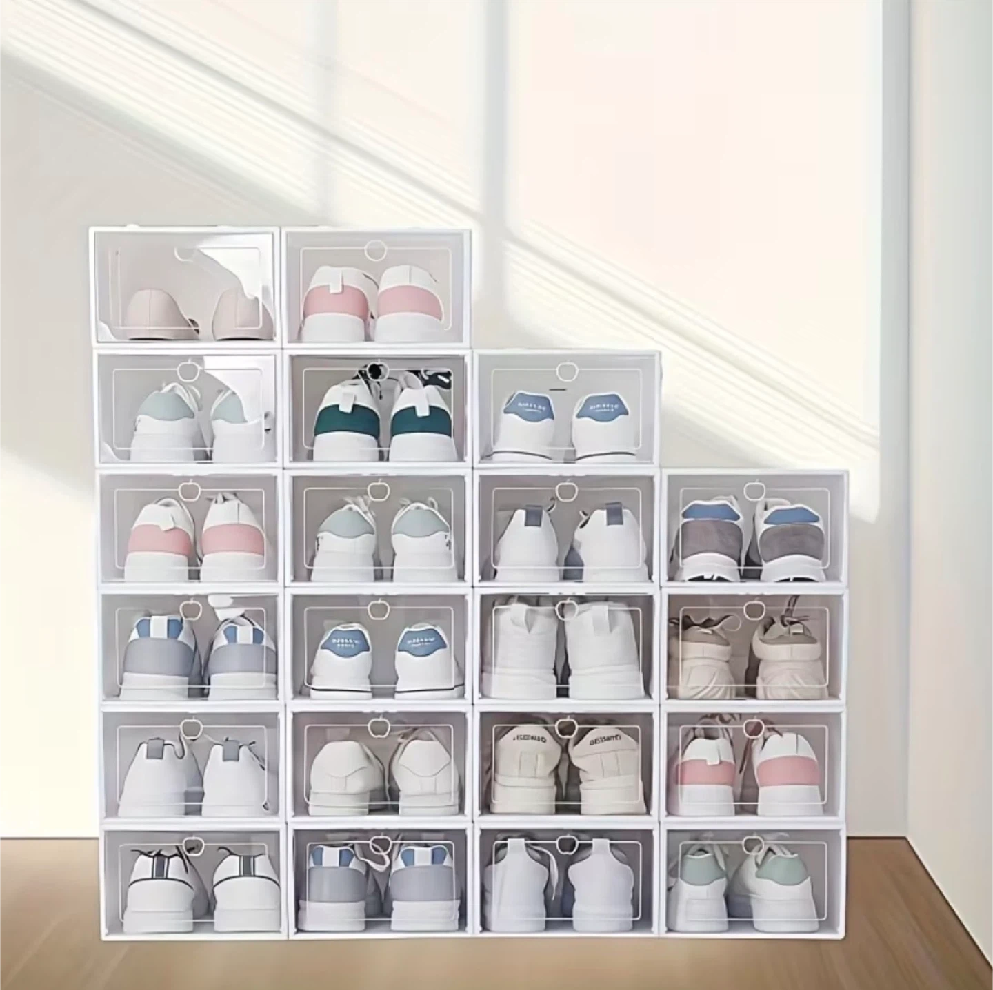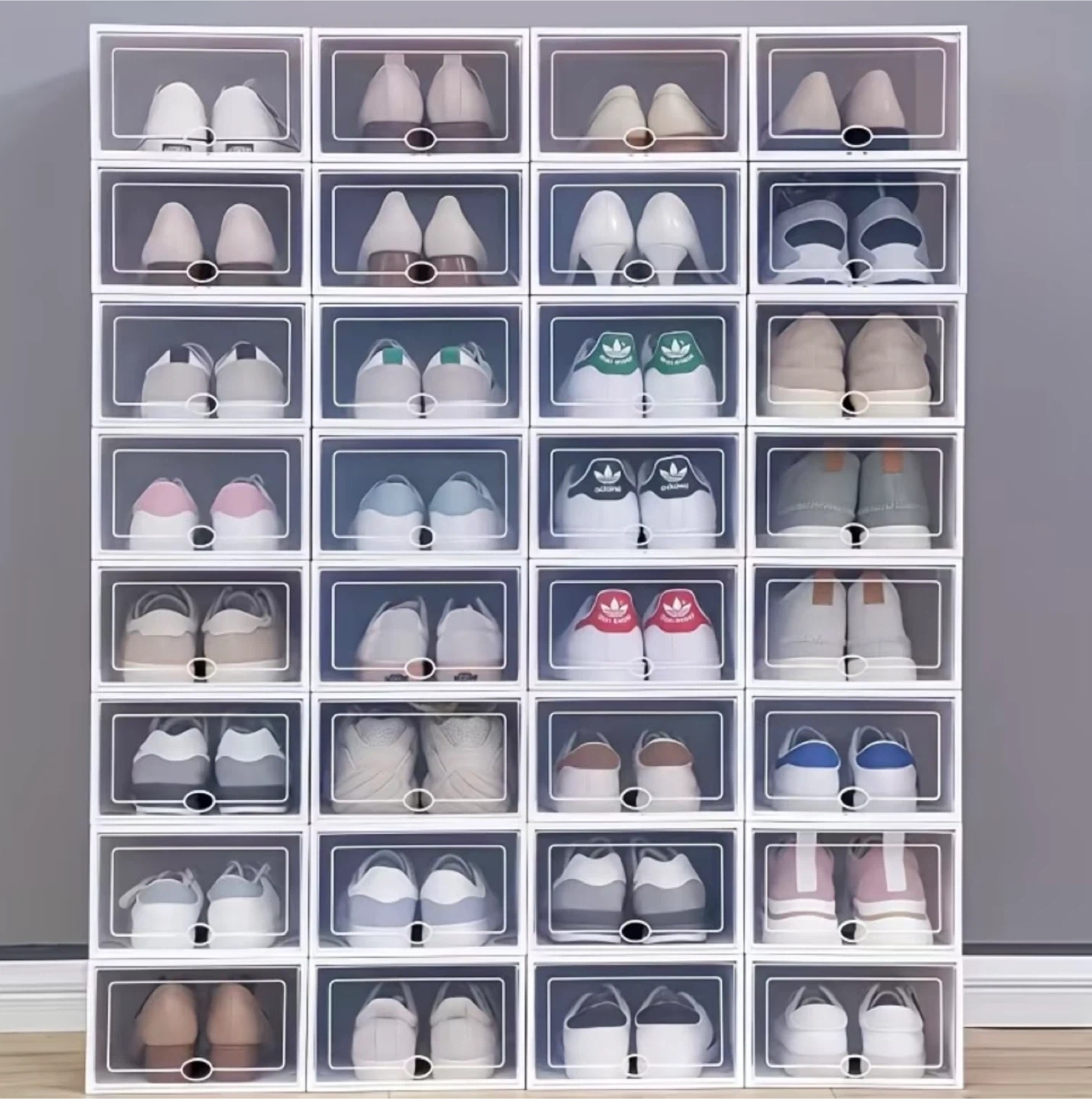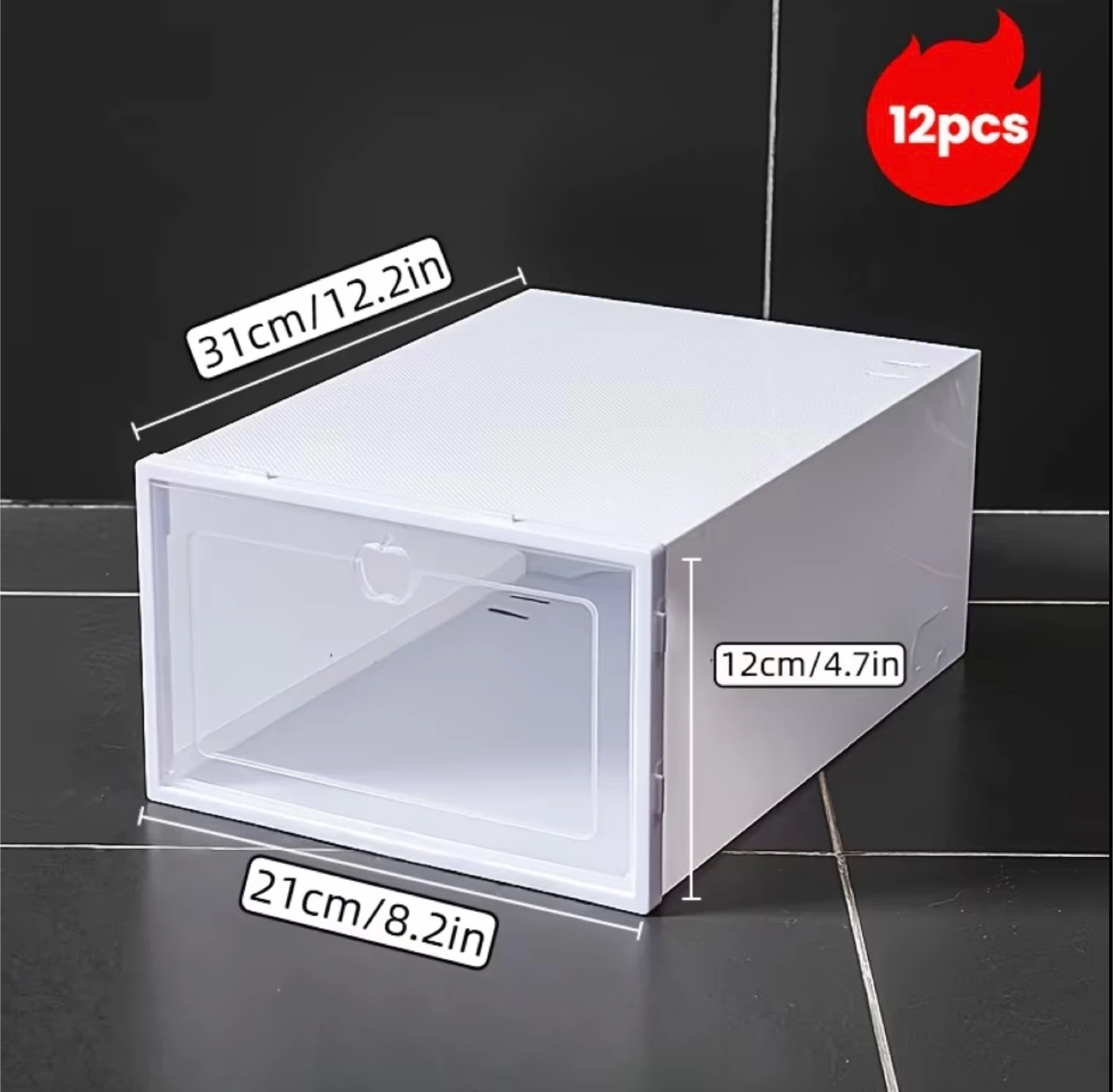 Keep your shoes neat and tidy with these stackable storage boxes! These clear front boxes make it easy to see your shoe collection while keeping them dustproof. Dimensions are mentioned in the pictures. It’s brand new in box.