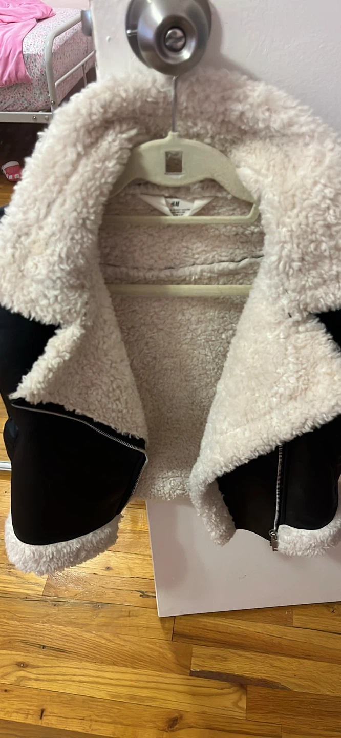I'm selling a stylish H&M jacket that's perfect for cooler weather! It features a black exterior with a cozy, faux shearling lining. This jacket is in great condition and ready for a new owner!