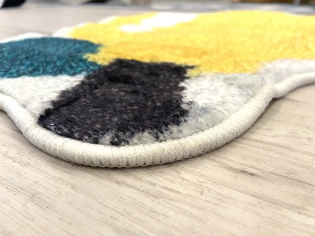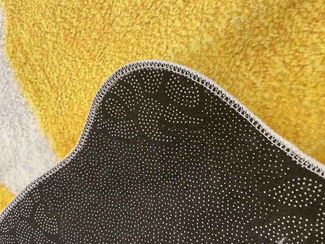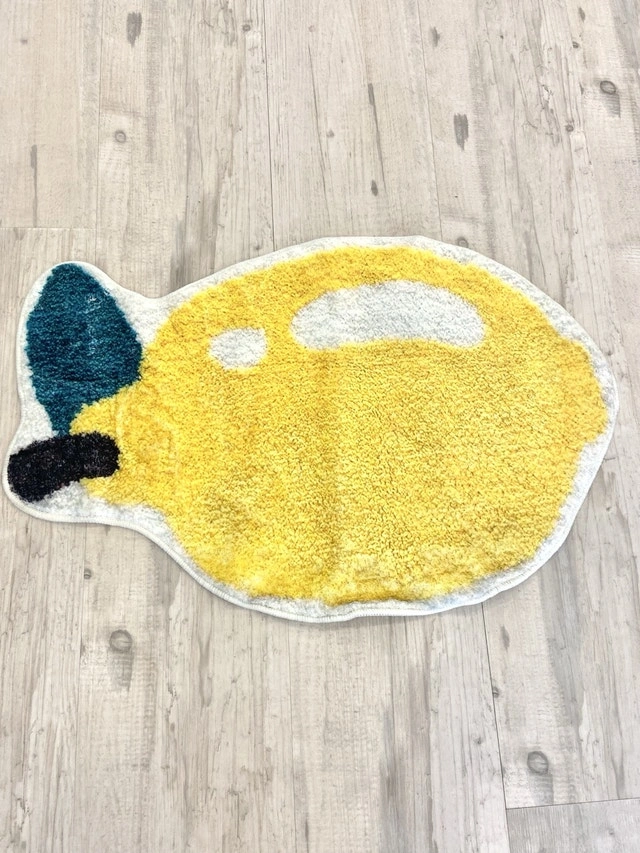 Add a playful touch to your space with this whimsical lemon-shaped rug. It's in good condition and ready to brighten up any room. Measuring approximately 30 inches in length and 20 inches in width, this rug is the perfect size for a bathroom, entryway, or as a fun accent piece in a bedroom. Here are the details: * Shape: Lemon * Colour: Yellow, white, blue and black * Dimensions: Approximately 30" x 20" * Material: Soft, plush fabric