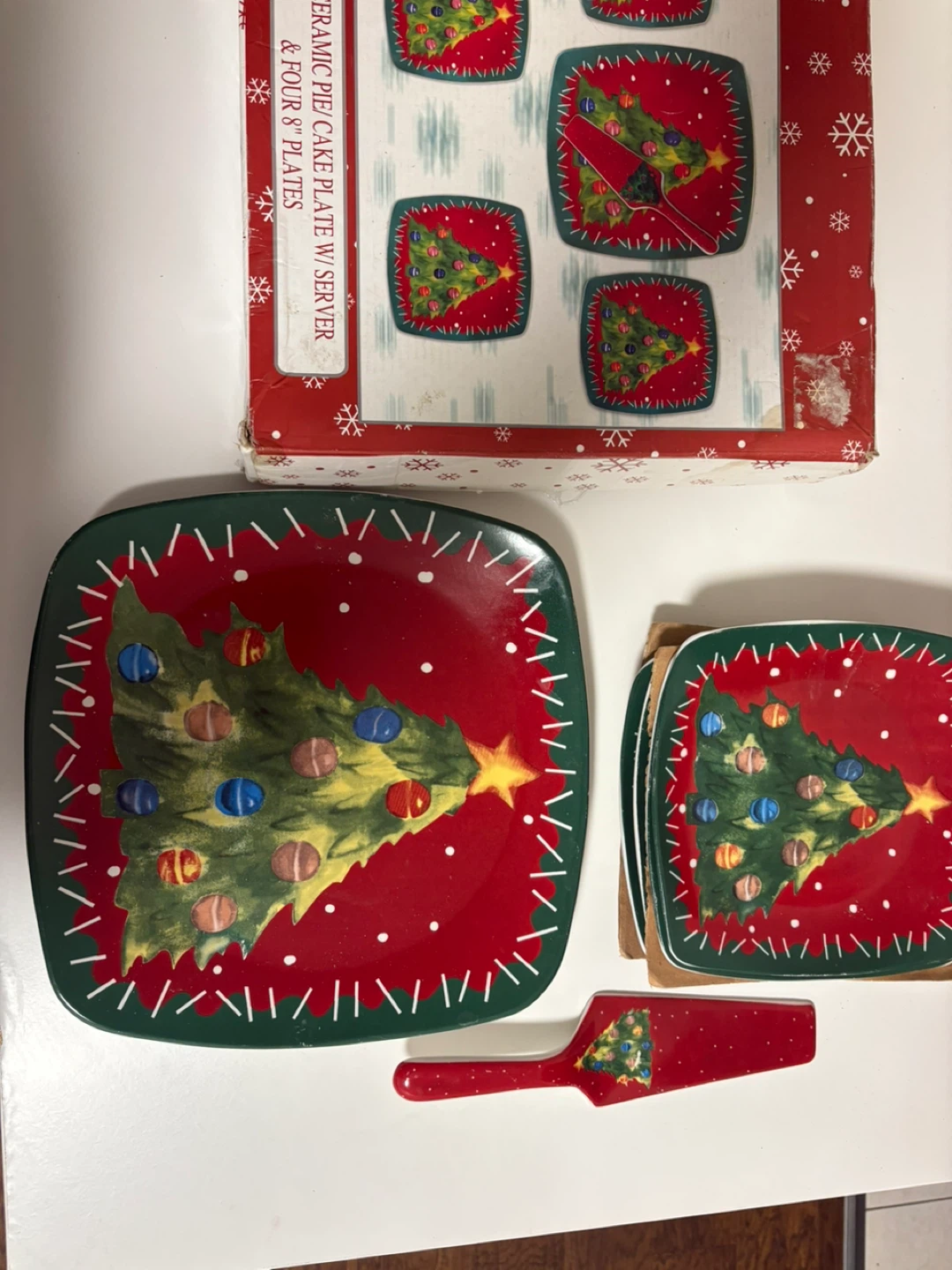 Ceramic pie/cake plate set, complete with a server and four 8-inch plates. Perfect for festive gatherings and holiday desserts! The plates feature a charming Christmas tree design. The set includes the original box.