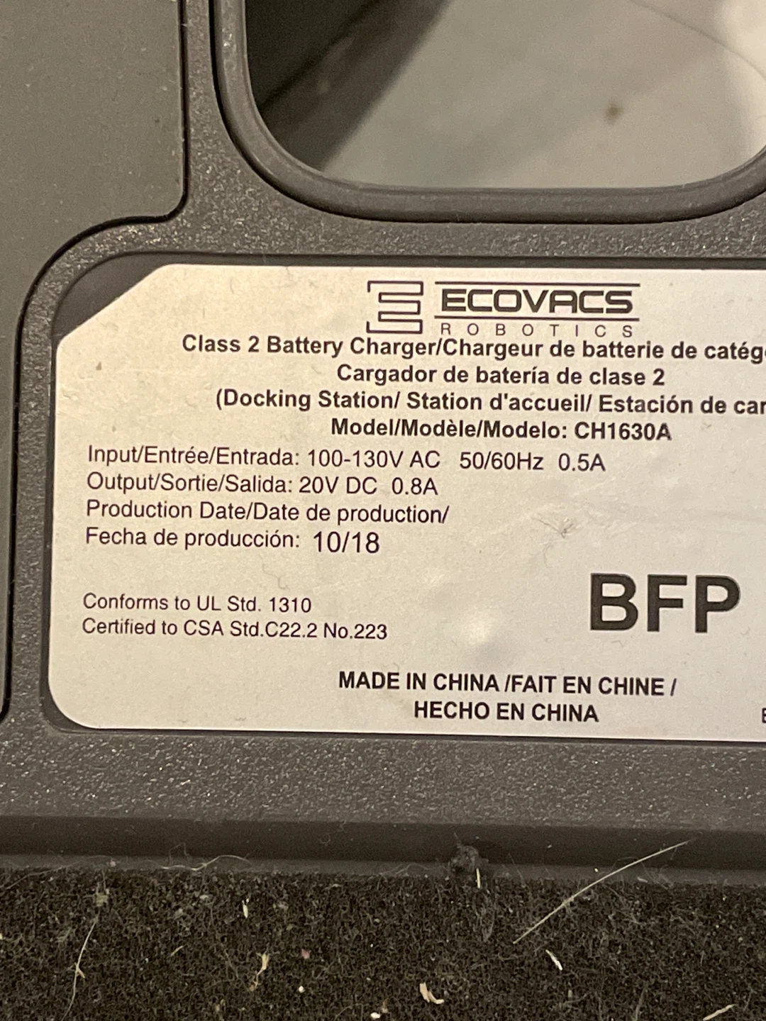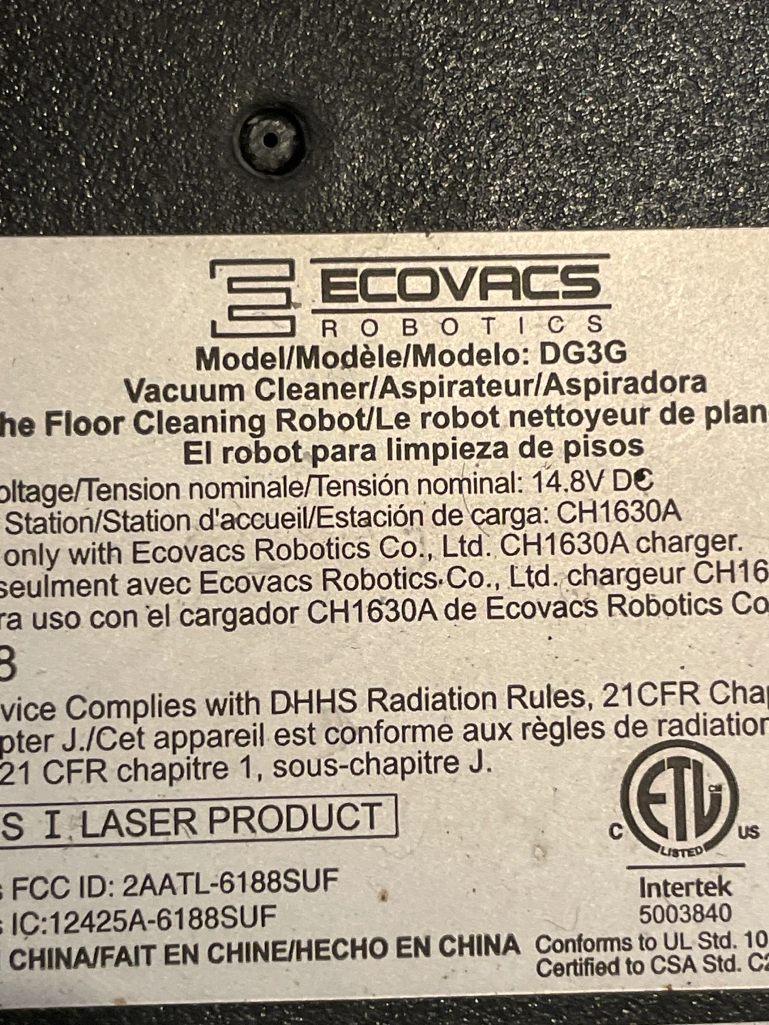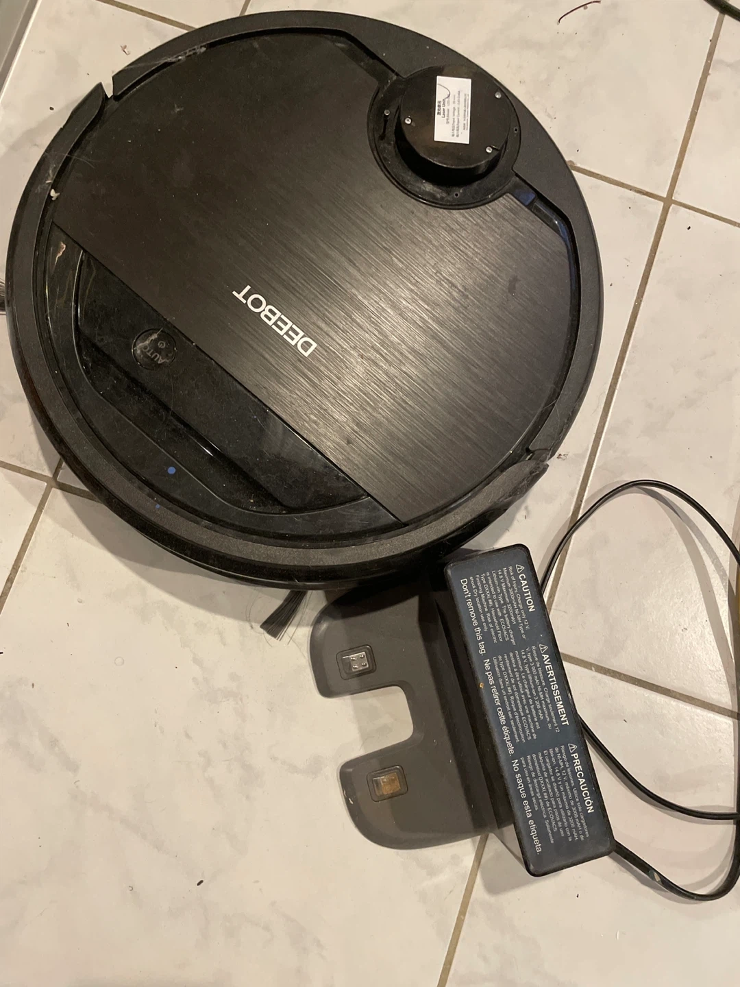 Selling an Ecovacs Robotics Deebot robot vacuum cleaner, model DG3G. It comes with the Class 2 battery charger, model CH1630A. It's in not working condition it starts then it stops working