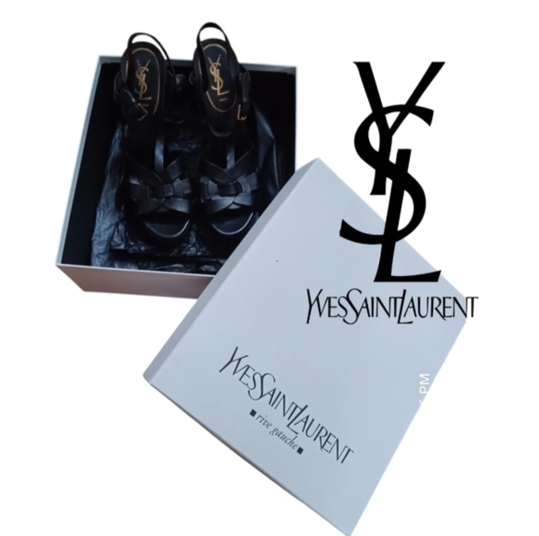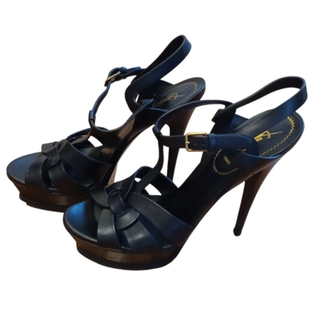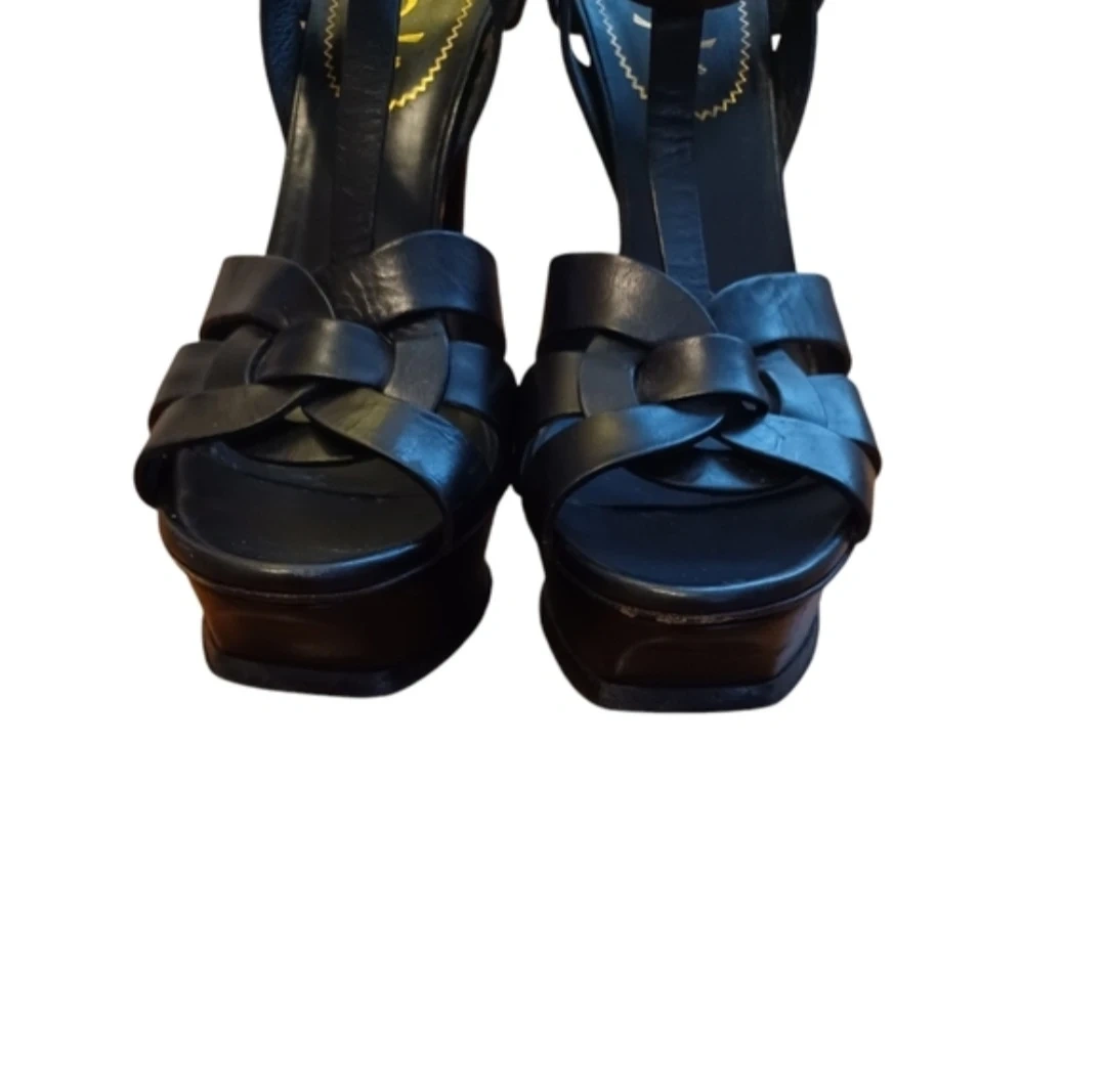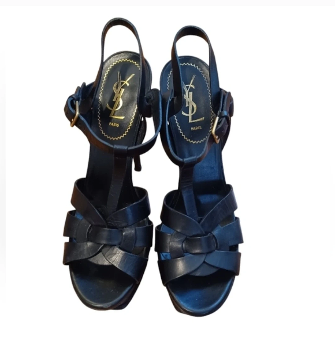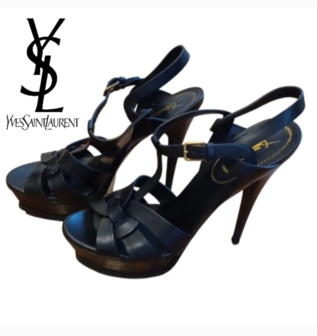 Selling a pair of Yves Saint Laurent Tribute heels in black leather. These stylish heels feature a platform and T-strap design. They come with the original box!