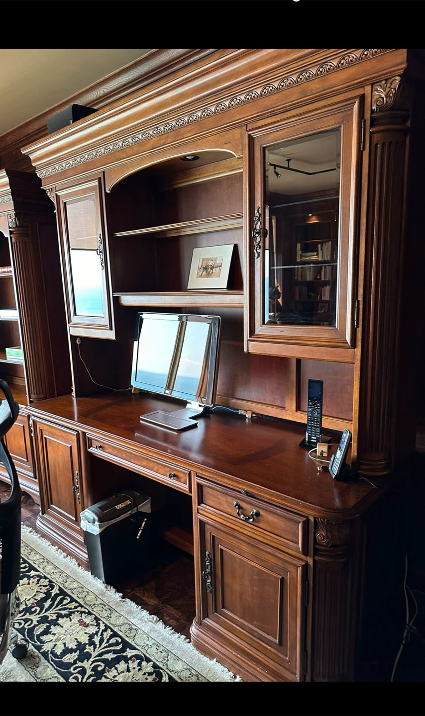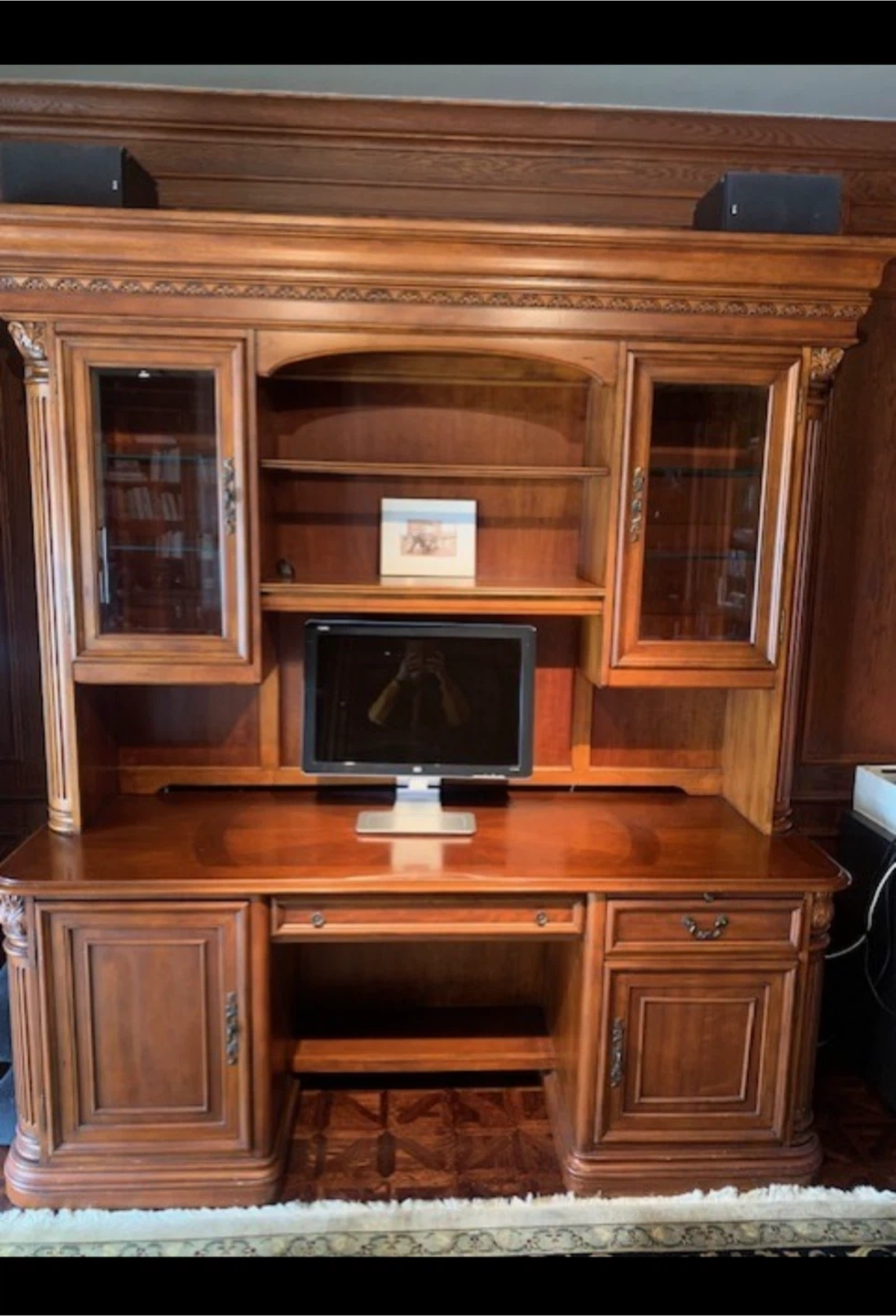 For Free: a beautiful solid wood executive desk with credenza attached (86"high x76"wide x 25" deep). This is a large, masculine desk with built in lighting and a keyboard drawer built in. This desk is beautiful with intricate and ornate carvings. It is free to a good home and will bring its own success vibes for the new user π. Just have to pick it up.