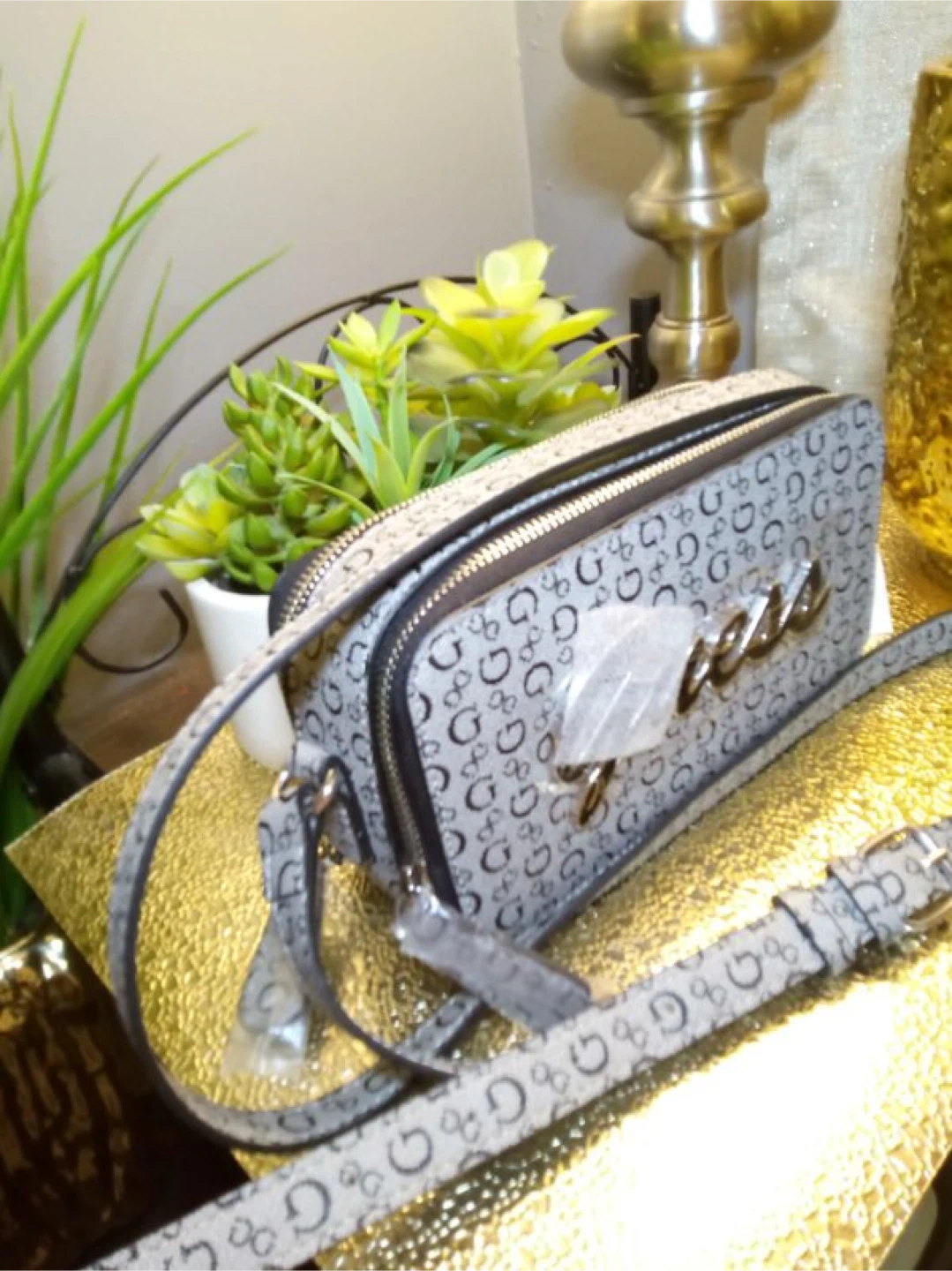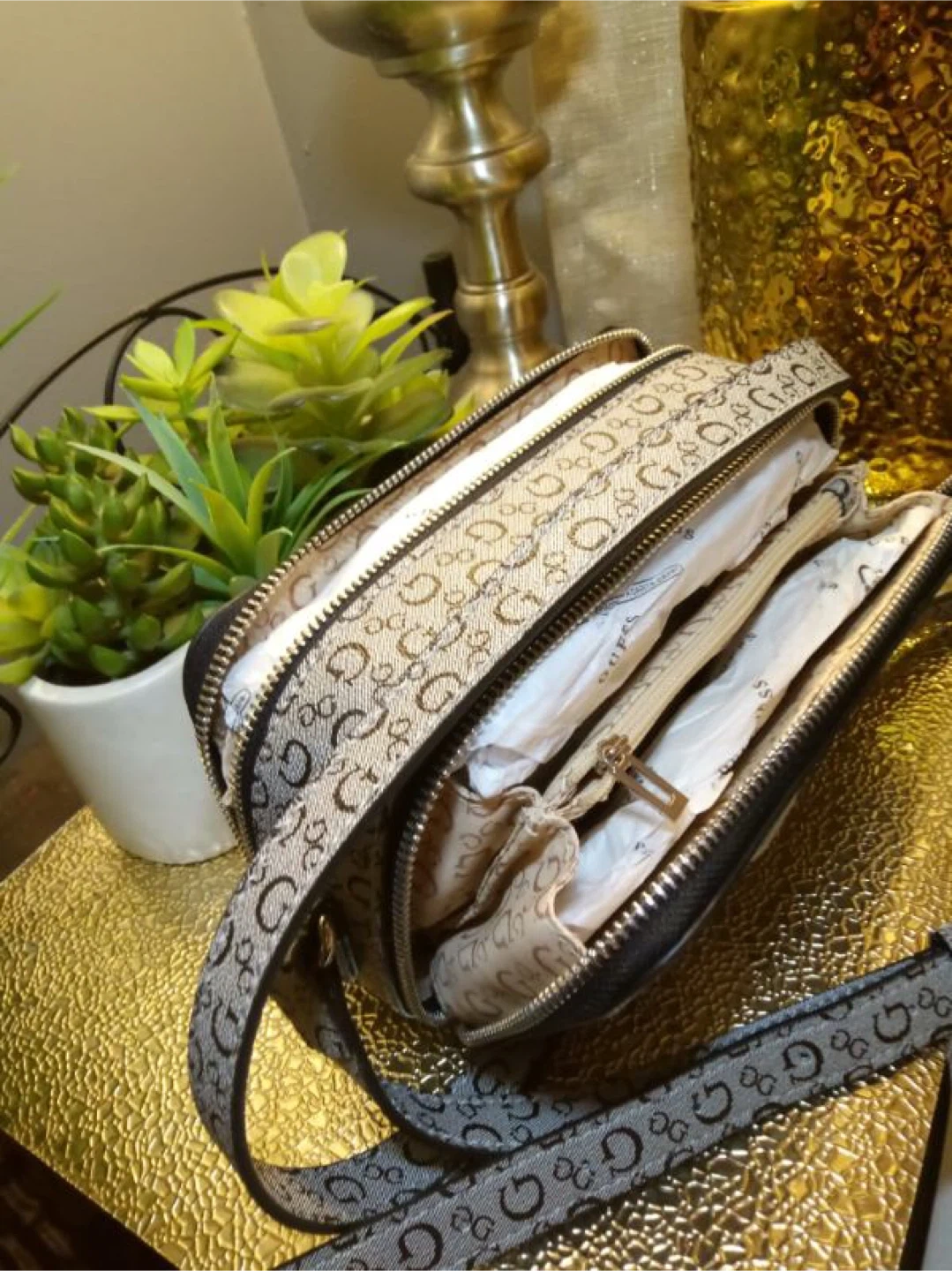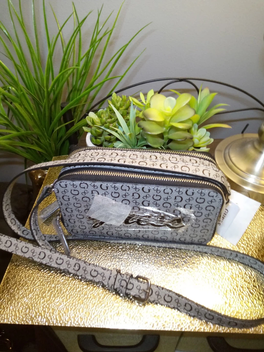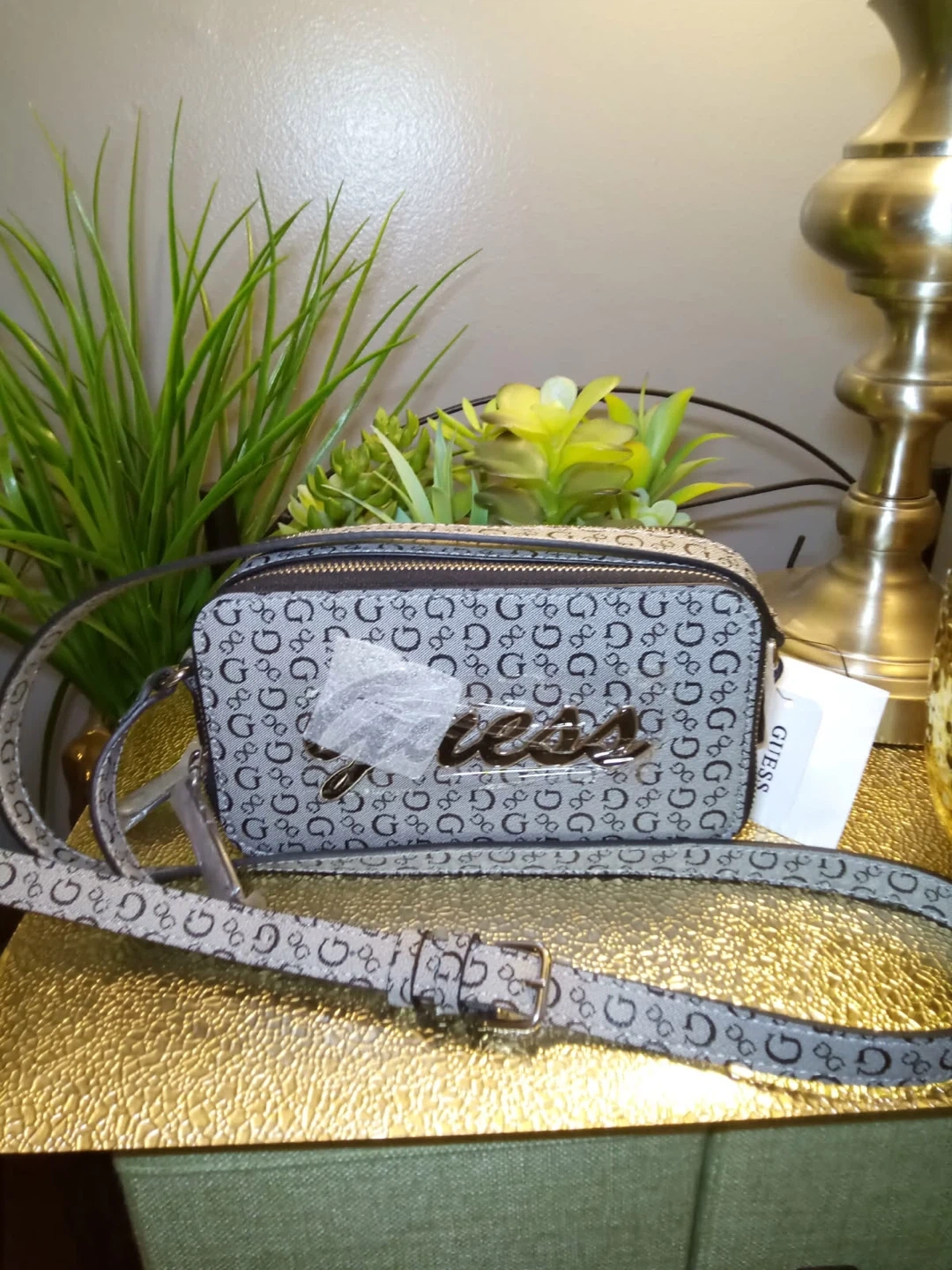 This is a new Guess crossbody bag. It has a gray color with the Guess logo all over the bag and strap. It has multiple zippered compartments.