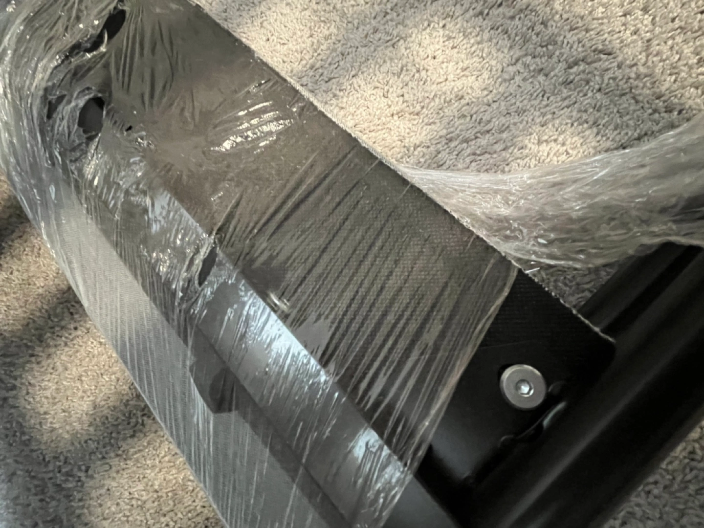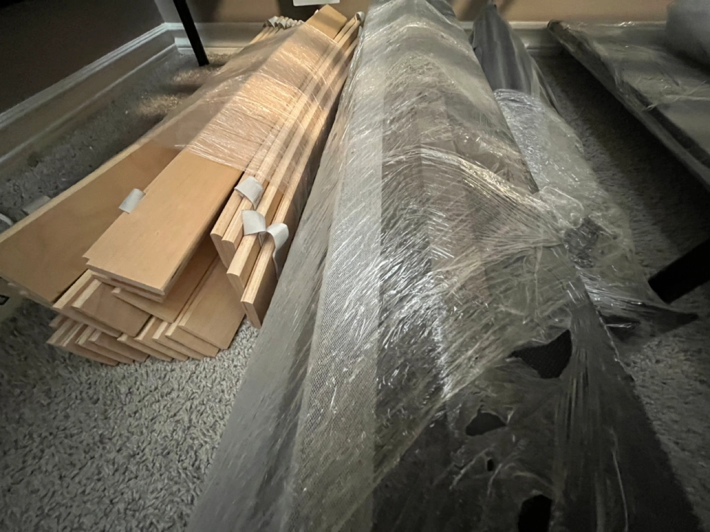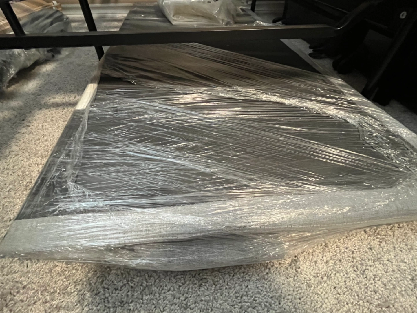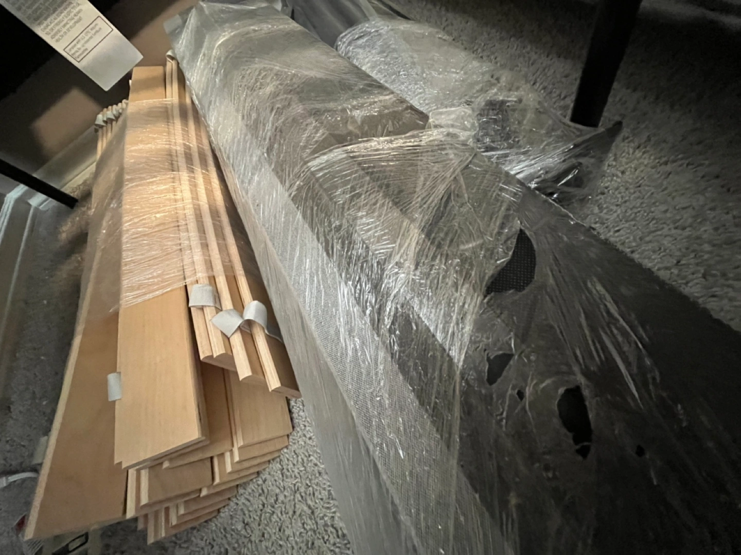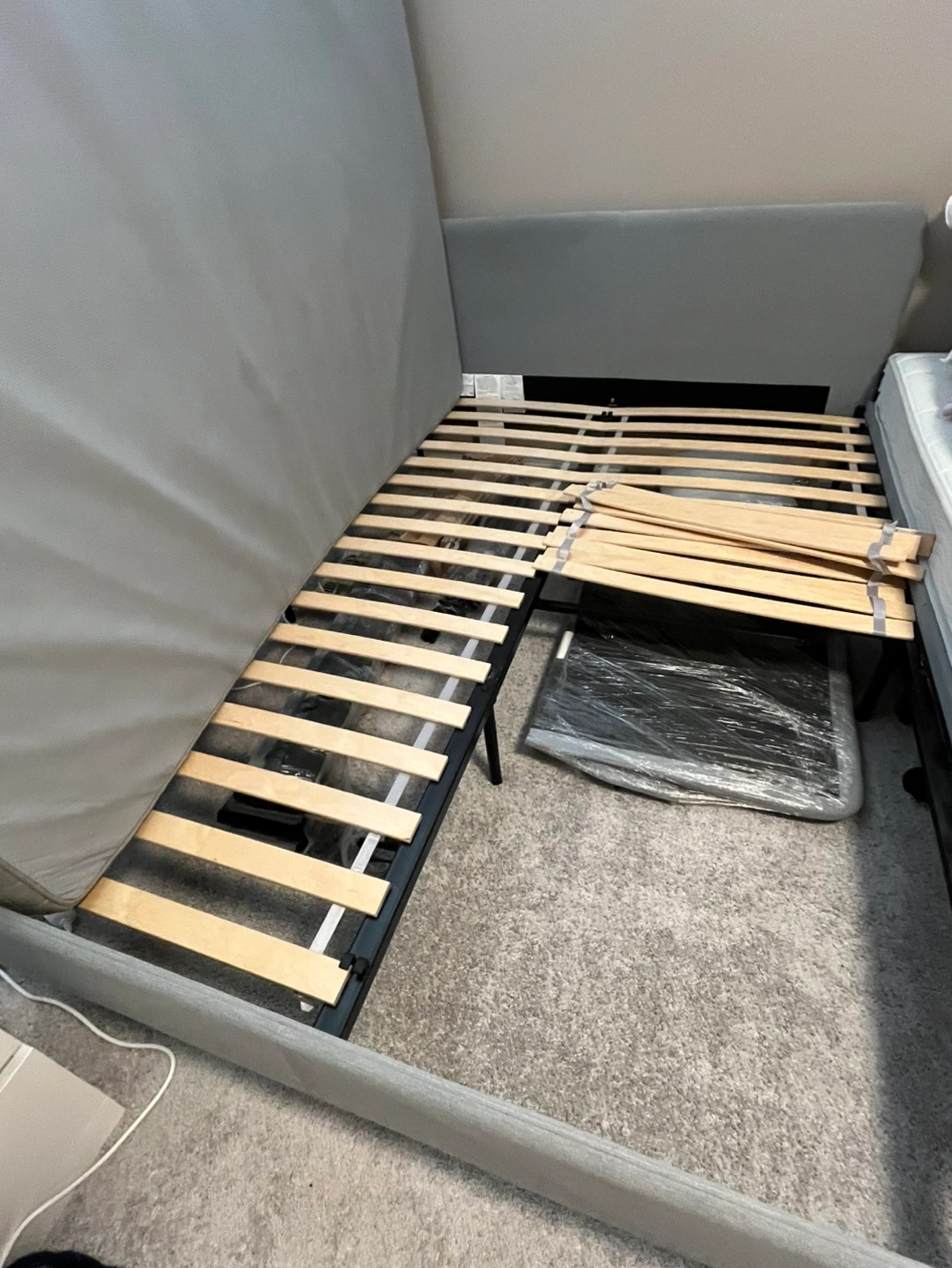 Selling a gray bed frame that's in good condition. It comes with all the slats needed for support. The frame is a stylish gray color, perfect for any bedroom. Get a great deal on this sturdy bed frame!
