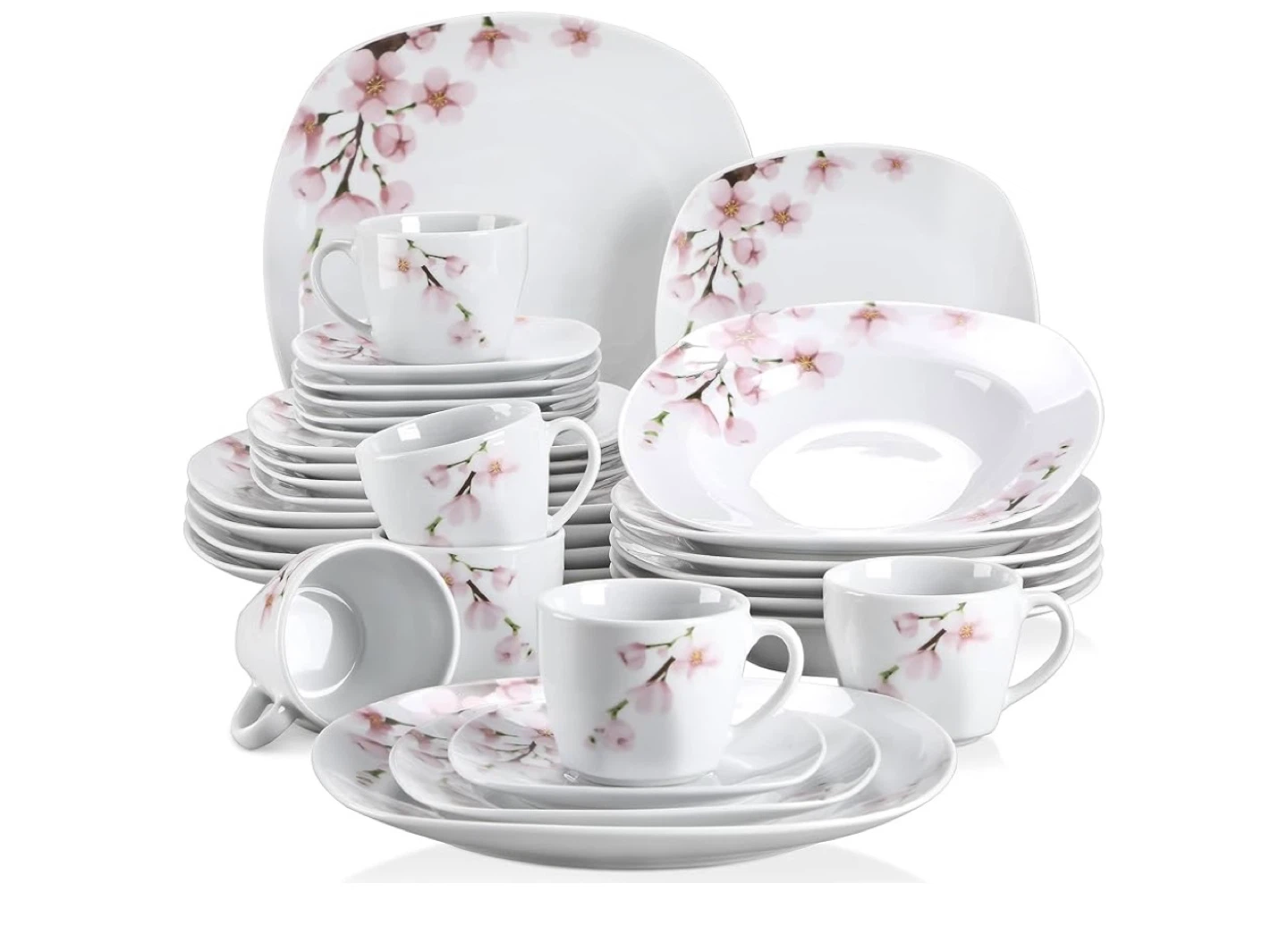 VEWEET Annie Porcelain Dinnerware for 6, 30-Piece Pink Floral Dish Set With Plates and Bowls Including Dinner, Dessert, Soup, Cups & Saucers