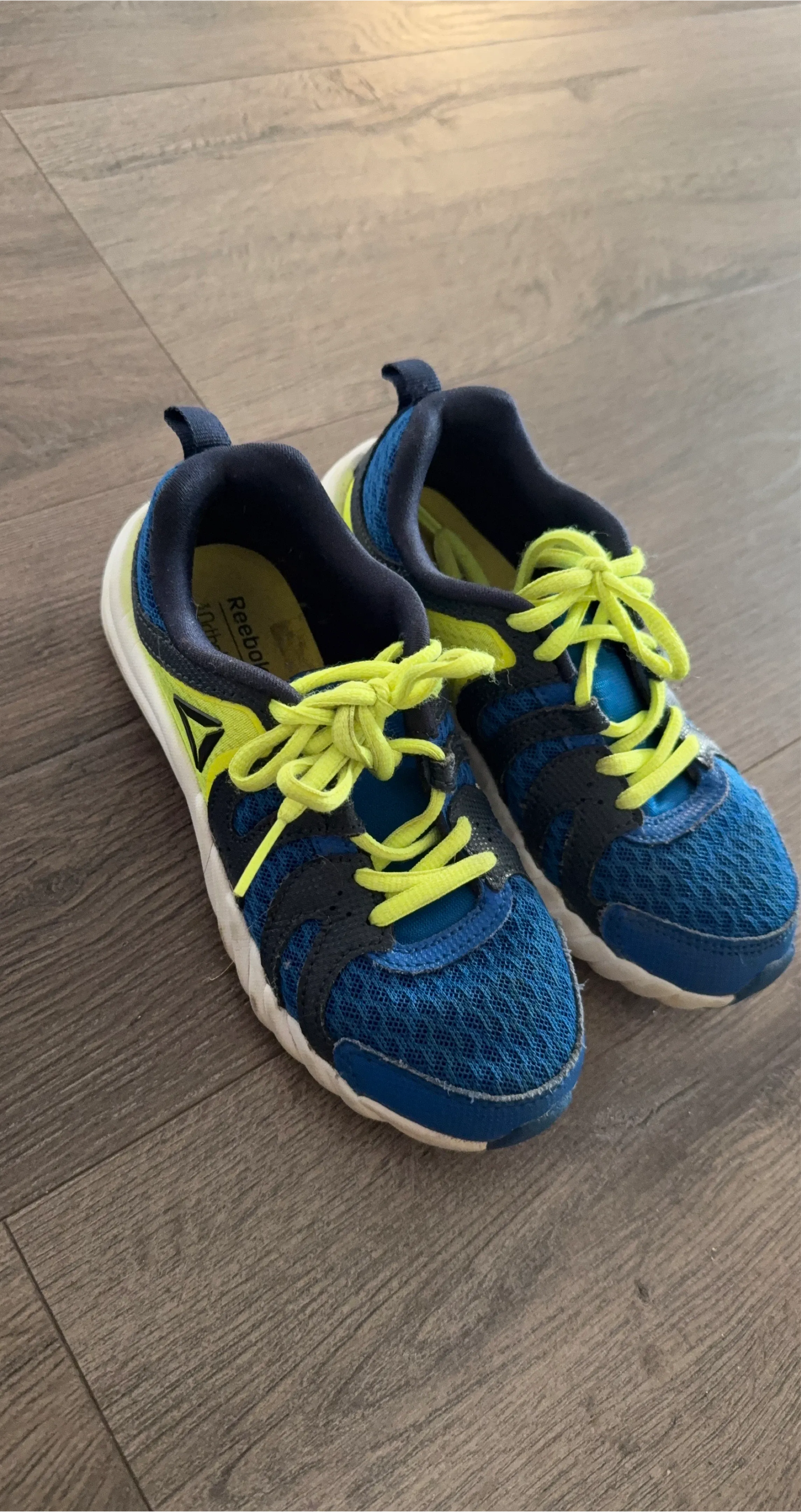 Selling a pair of Reebok kids' running shoes! They're a vibrant blue and yellow colour. Great for active kids!