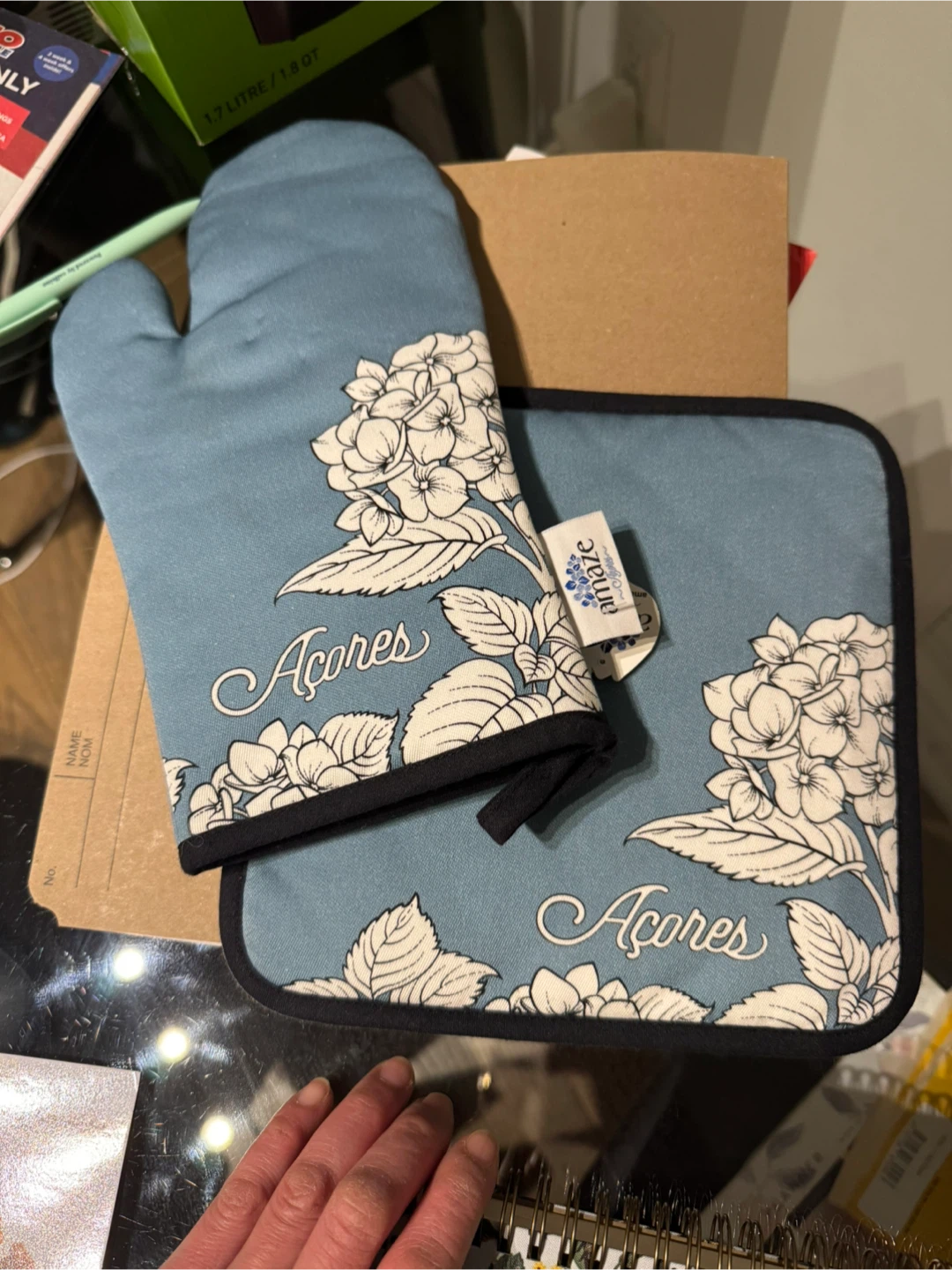 Keep your hands safe with this cute oven mitt and pot holder set! It's from Amaze and features a lovely Azores design with white flowers on a blue background. Perfect for adding a touch of charm to your kitchen