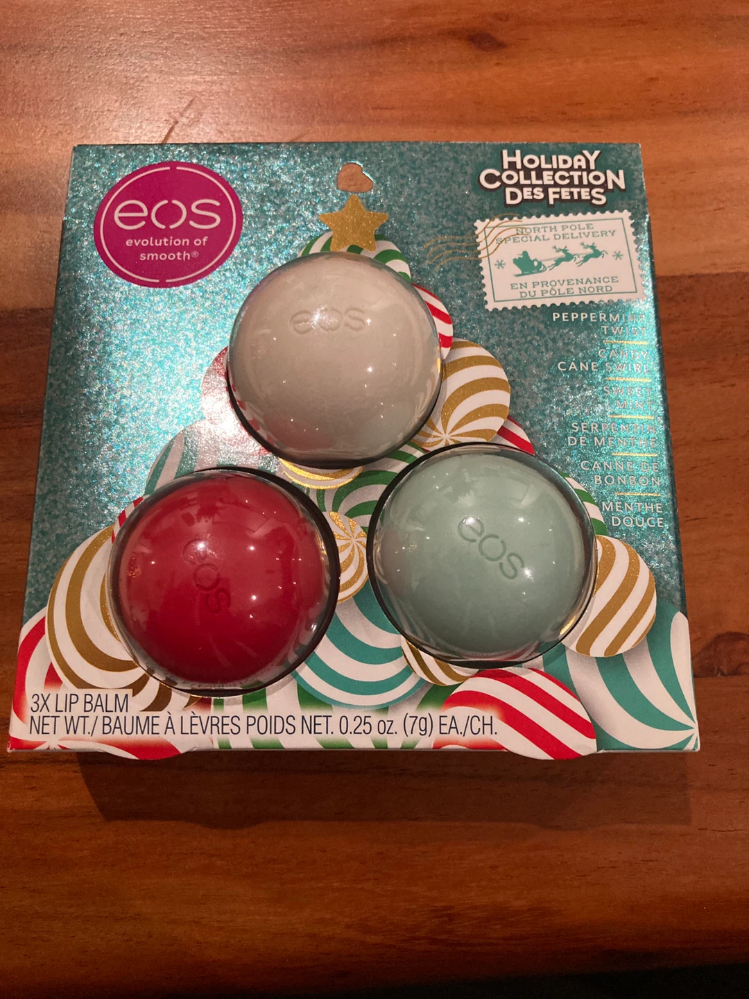 Here's a new EOS Holiday Collection lip balm set! It includes three different flavours: Peppermint Twist, Cane Swirl, and Serpent de Menthe. The set contains 3 lip balms, each with a net weight of 0.25 oz (7g).