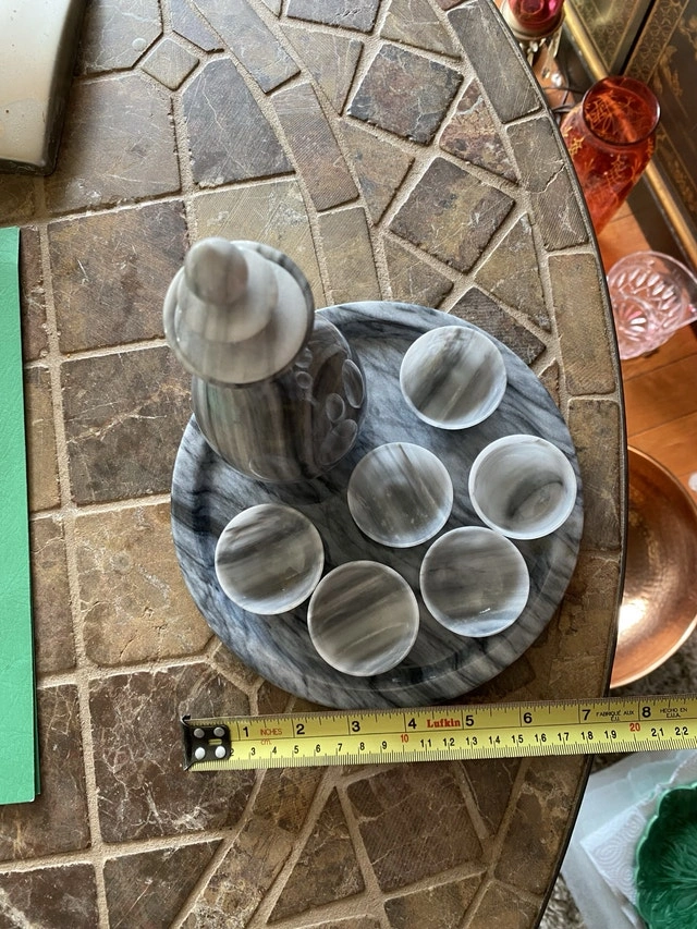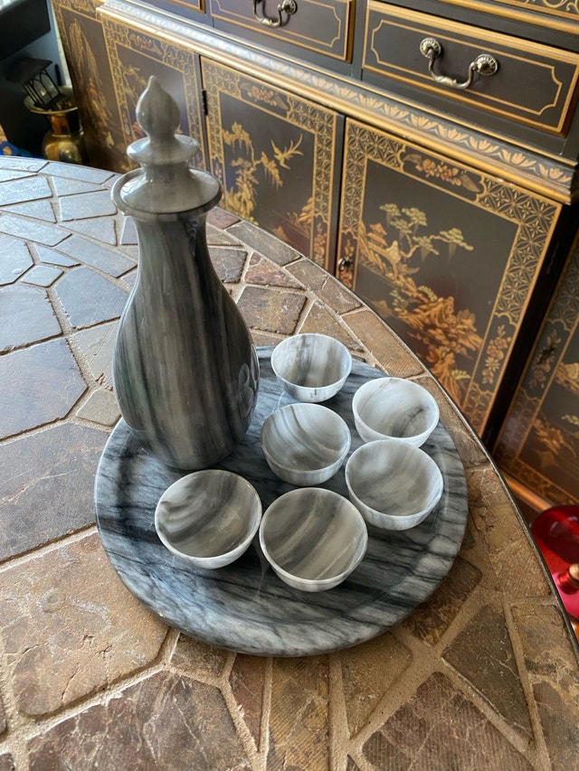 This vintage saki set features a beautiful marble design, including a decanter (h: 7.5”) and six small cups arranged on a matching tray, perfect for serving saki in style. This set is used, please see images for condition. This gorgeous set would be an amazing addition to your barware collection. * Includes one decanter, six cups, and a serving tray * Made of marble