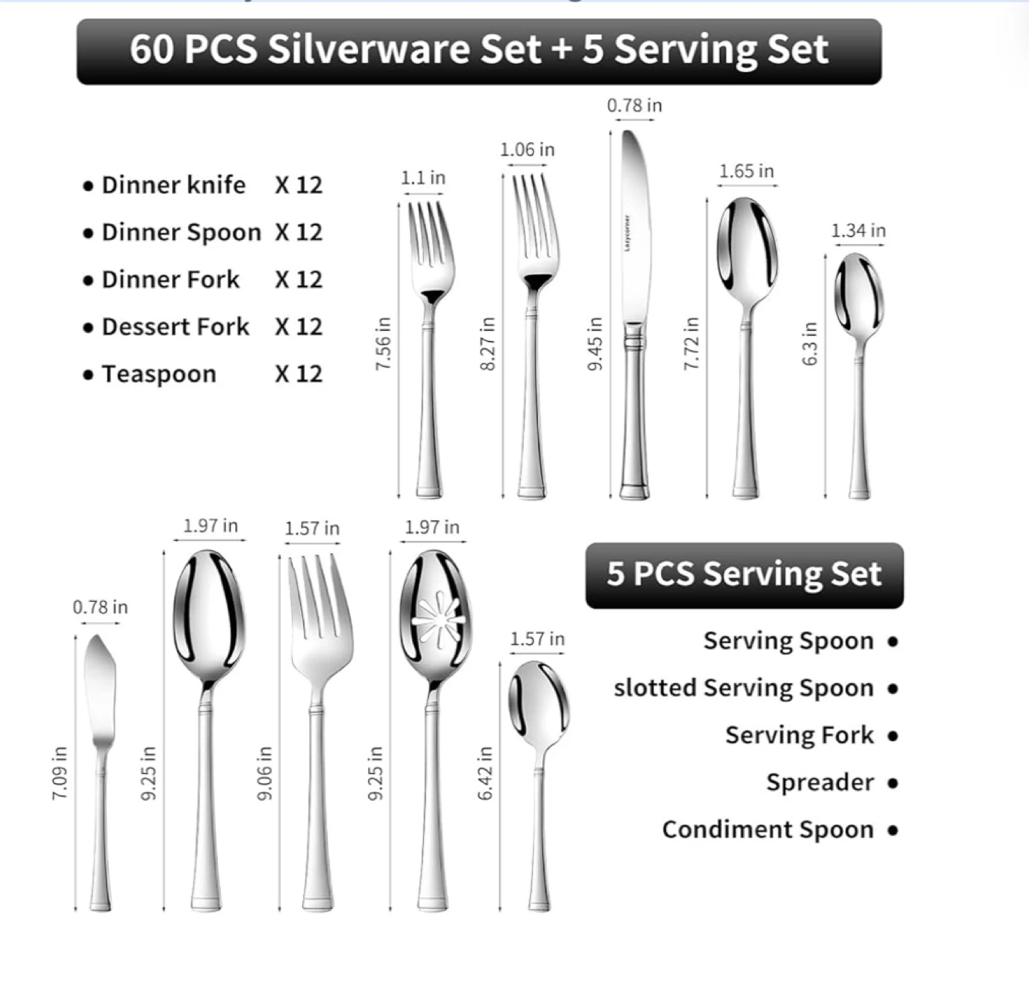 Selling a Lazy Corner 60-piece silverware set with a 5-piece serving set. This set includes dinner knives, dinner spoons, dinner forks, dessert forks, and teaspoons, each with 12 pieces. The serving set includes a serving spoon, slotted serving spoon, serving fork, spreader, and condiment spoon. Perfect for everyday use or special occasions!