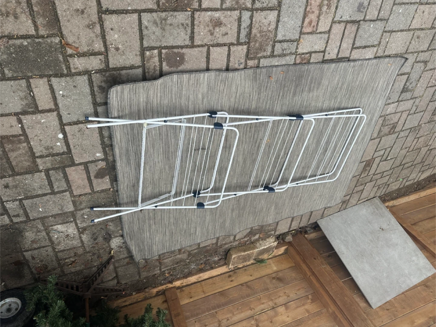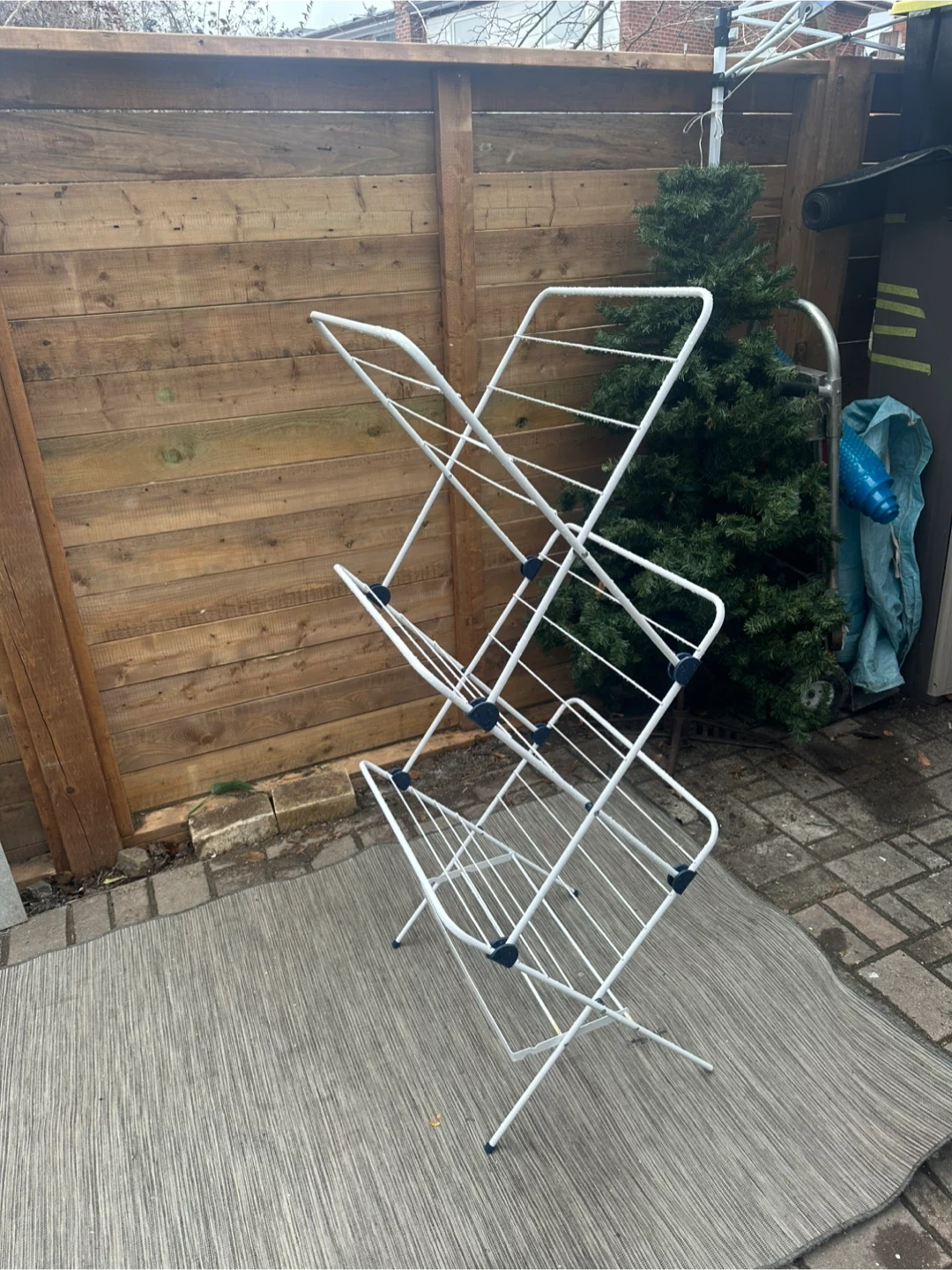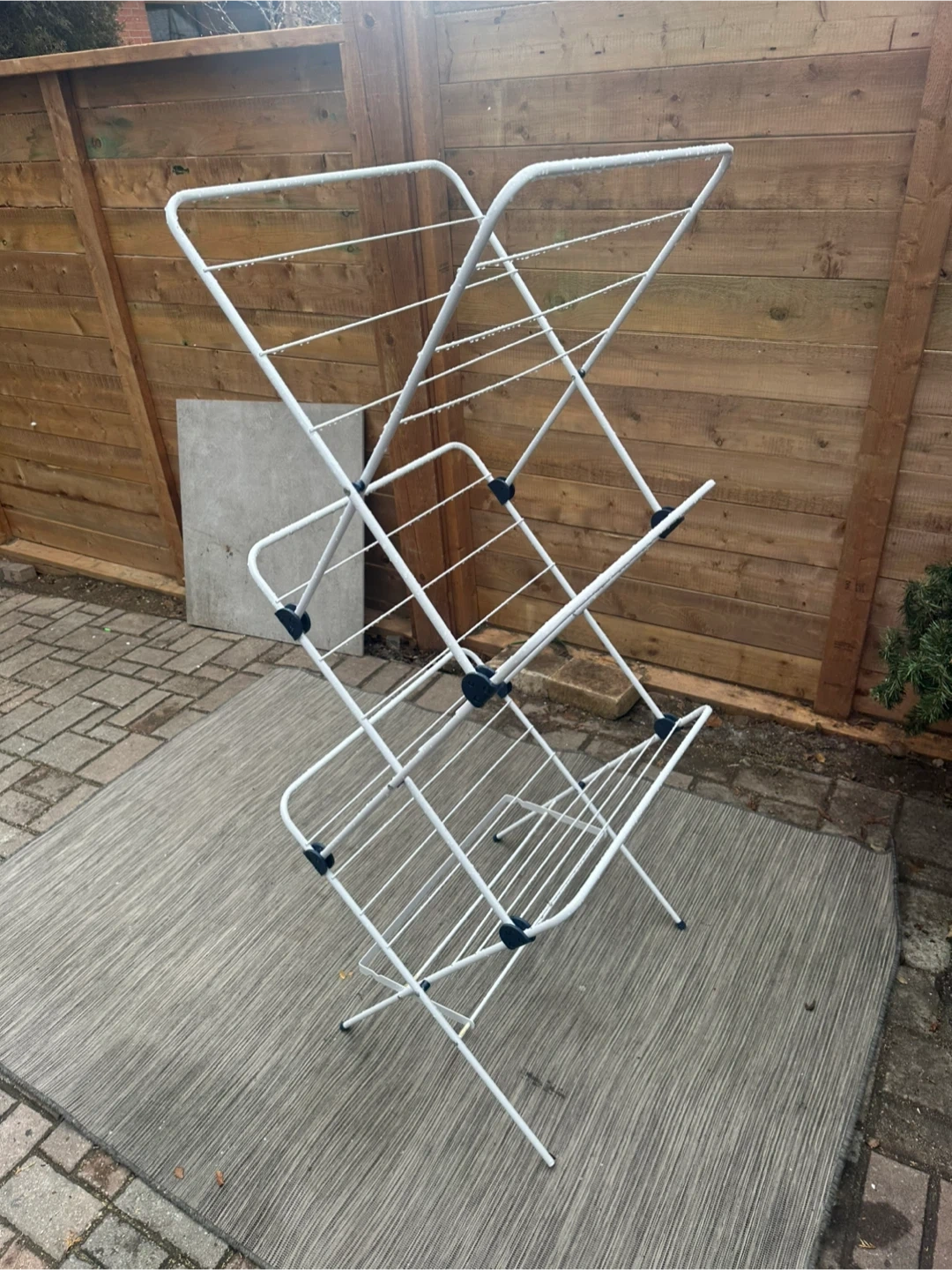 Selling a white folding clothes drying rack! It's in great shape and perfect for saving space when you're not using it. Folds up easily for storage, too!