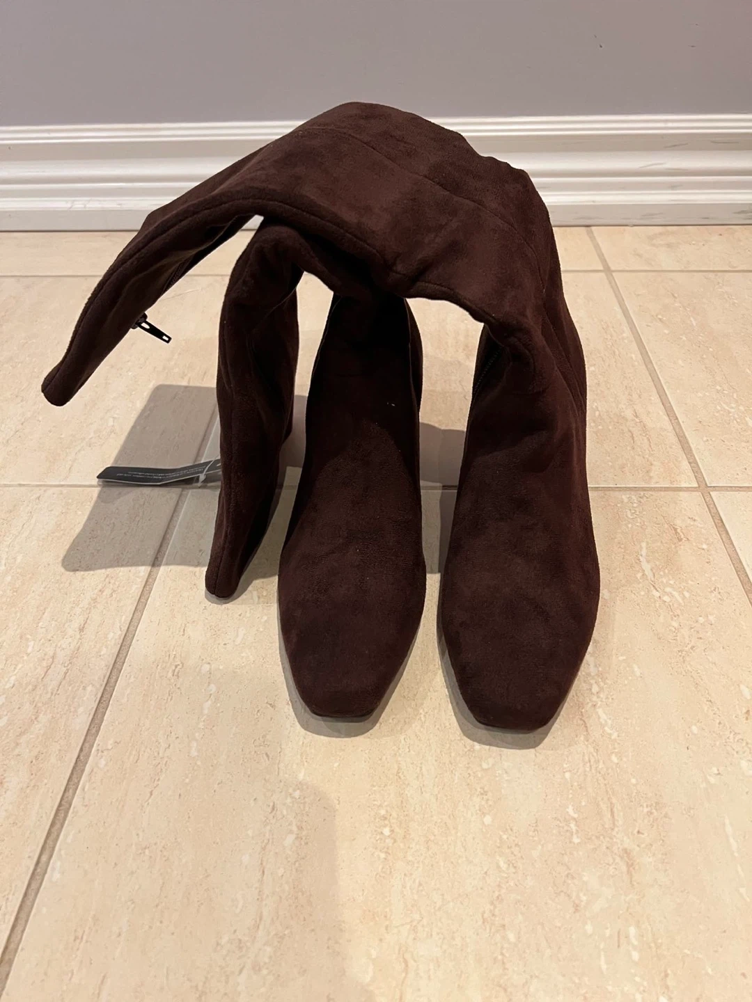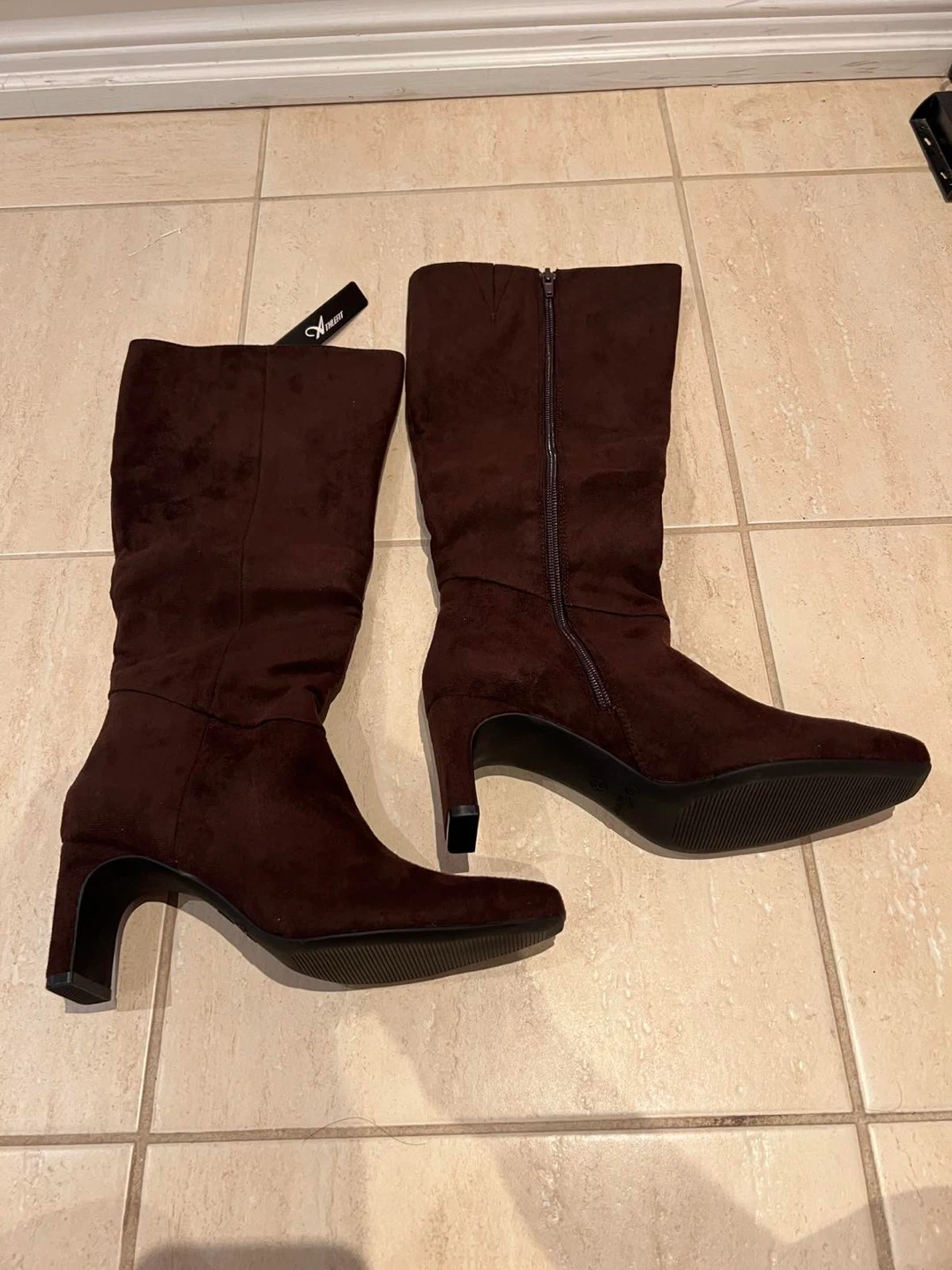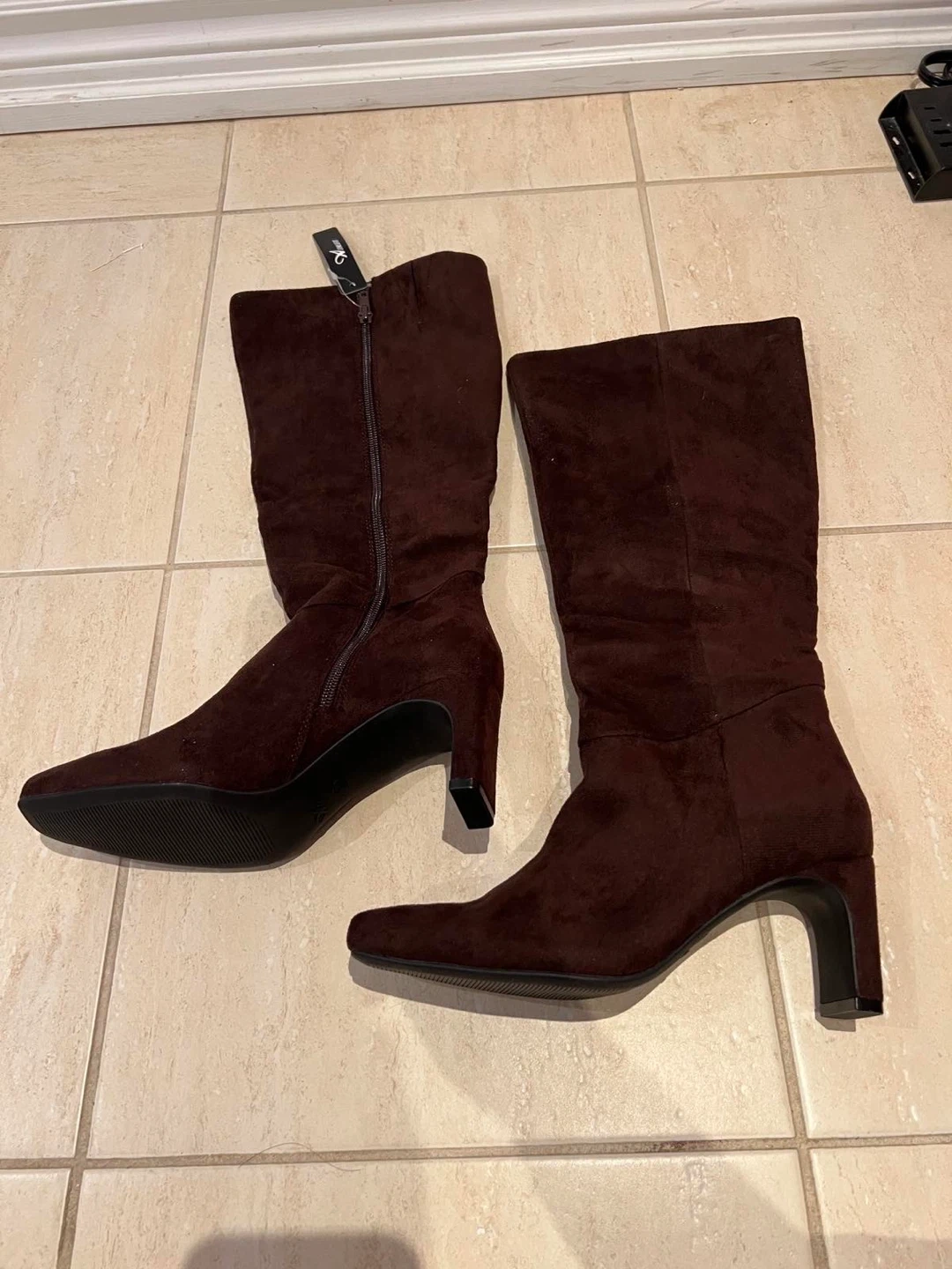 These are a pair of Amaryllis knee-high boots in a lovely brown colour. They have a heel and a zipper on the side. Perfect for fall!